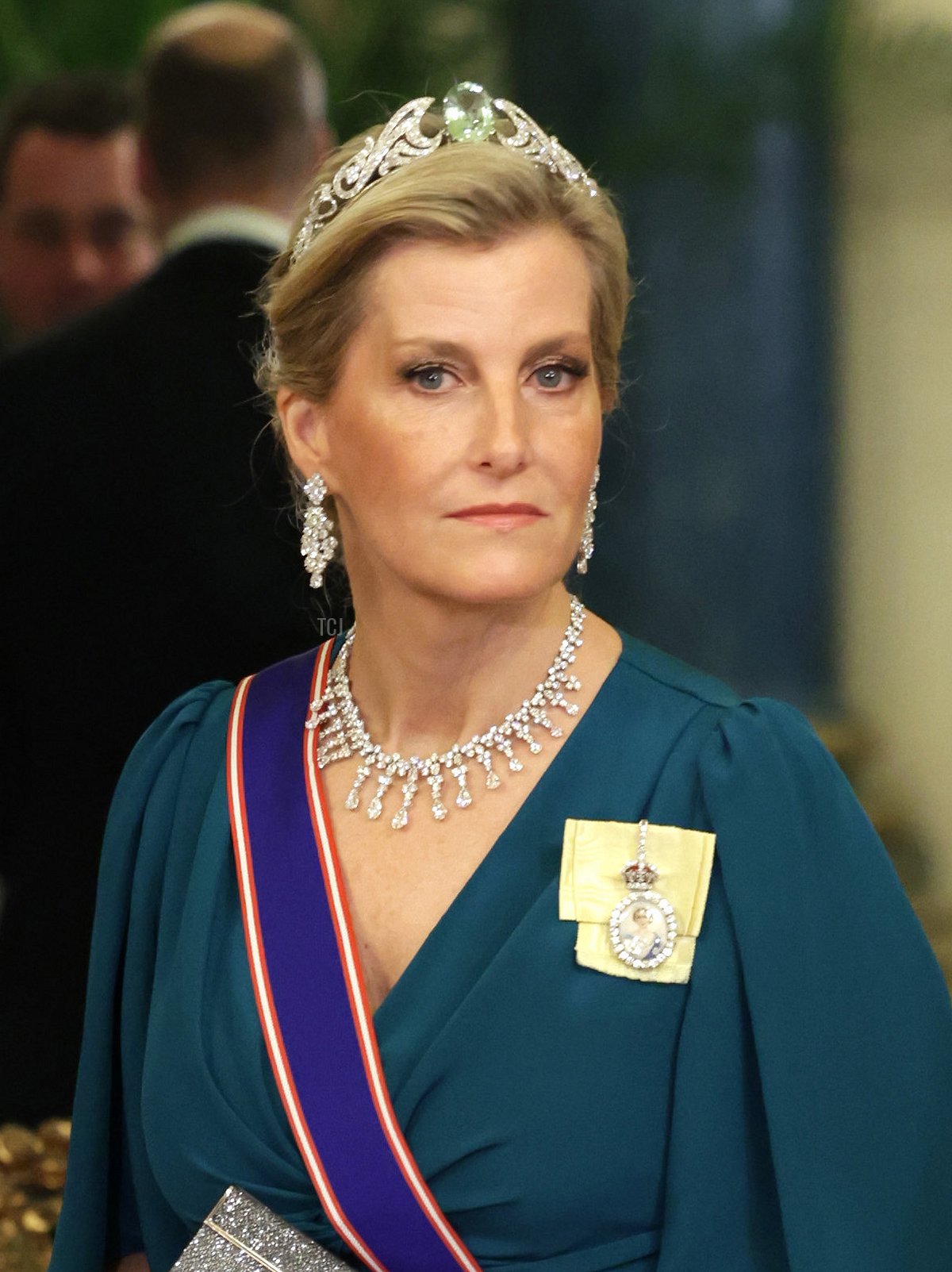 More recently, parts of the suite have been worn by other members of the royal family. The Countess of Wessex wore the necklace and earrings with her recently-renovated wedding tiara for the American state banquet at Buckingham Palace in June 2019.