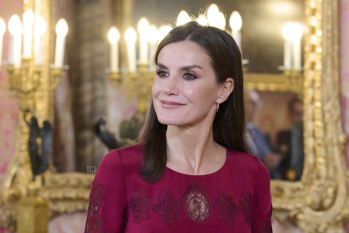 Inside the palace, she removed the wrap to reveal a dark red Felipe Varela gown that she’s had in her closet for many years. The dress features lace appliqué detailing.