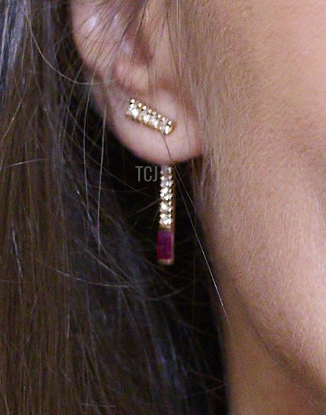 She wore earrings from a favorite brand, Gold & Roses. The “needle” earrings come from the brand’s “I Am Red” line.