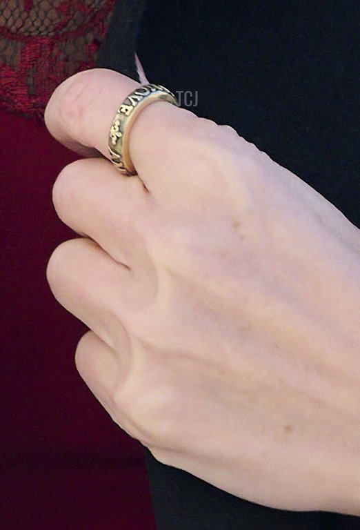 In place of her usual Karen Hallam oval ring, she wore a new gold ring from an Italian-American brand, Coreterno. The yellow gold ring is the brand’s “Amor che tutto move” style. The name translates to “Love moves everything,” which is the final line of Dante’s Divine Comedy. The ring also has an engraved inscription inside, which reads, “As long as I’m existing you will be loved.” (Thanks to Queen Letizia Style for this ID!)