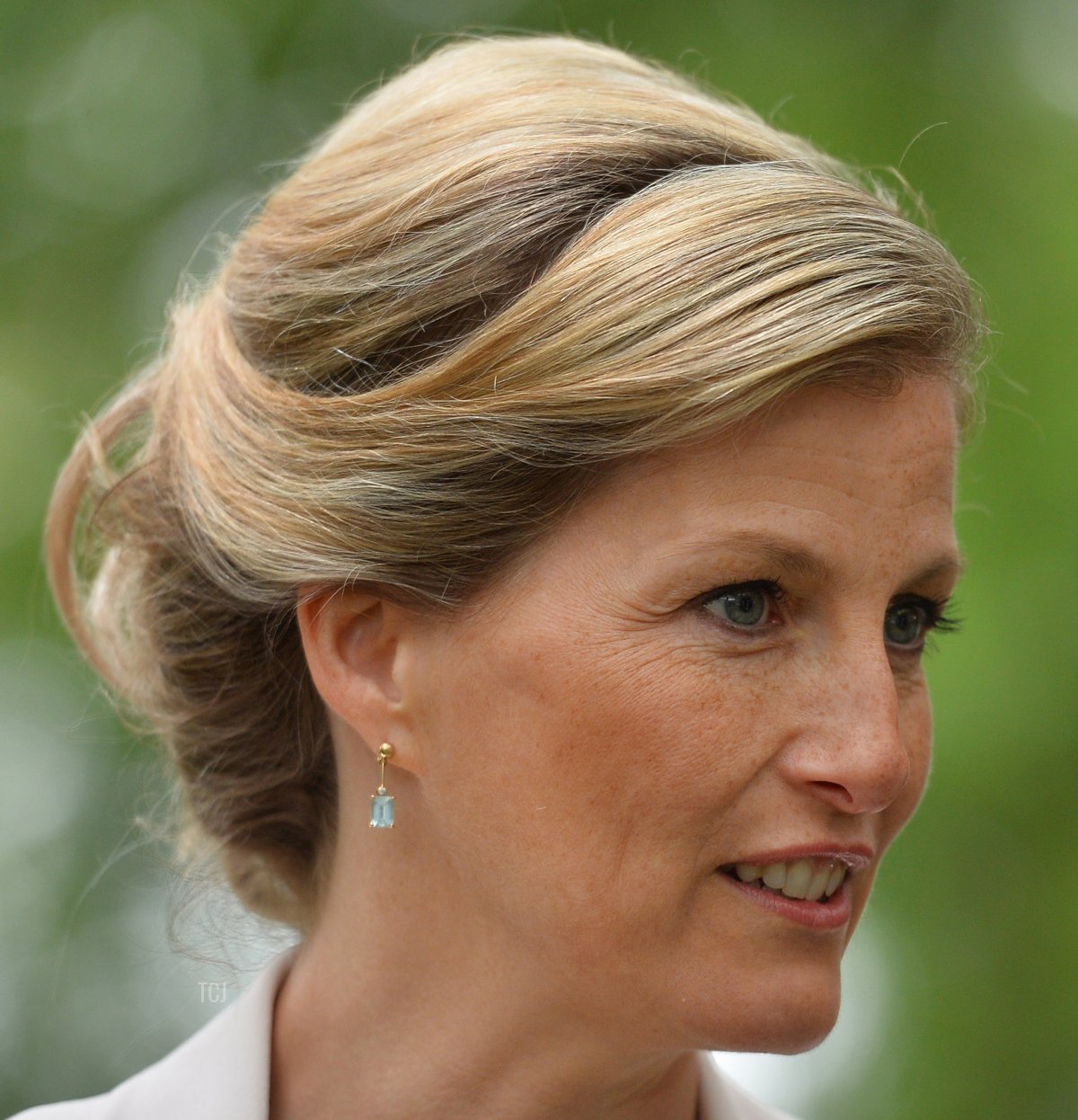 Sophie has paired the Art Deco brooch with various earrings, including some set with blue gems. This gold pair, worn at the Chelsea Flower Show in 2013, features rectangular blue gemstone drops.