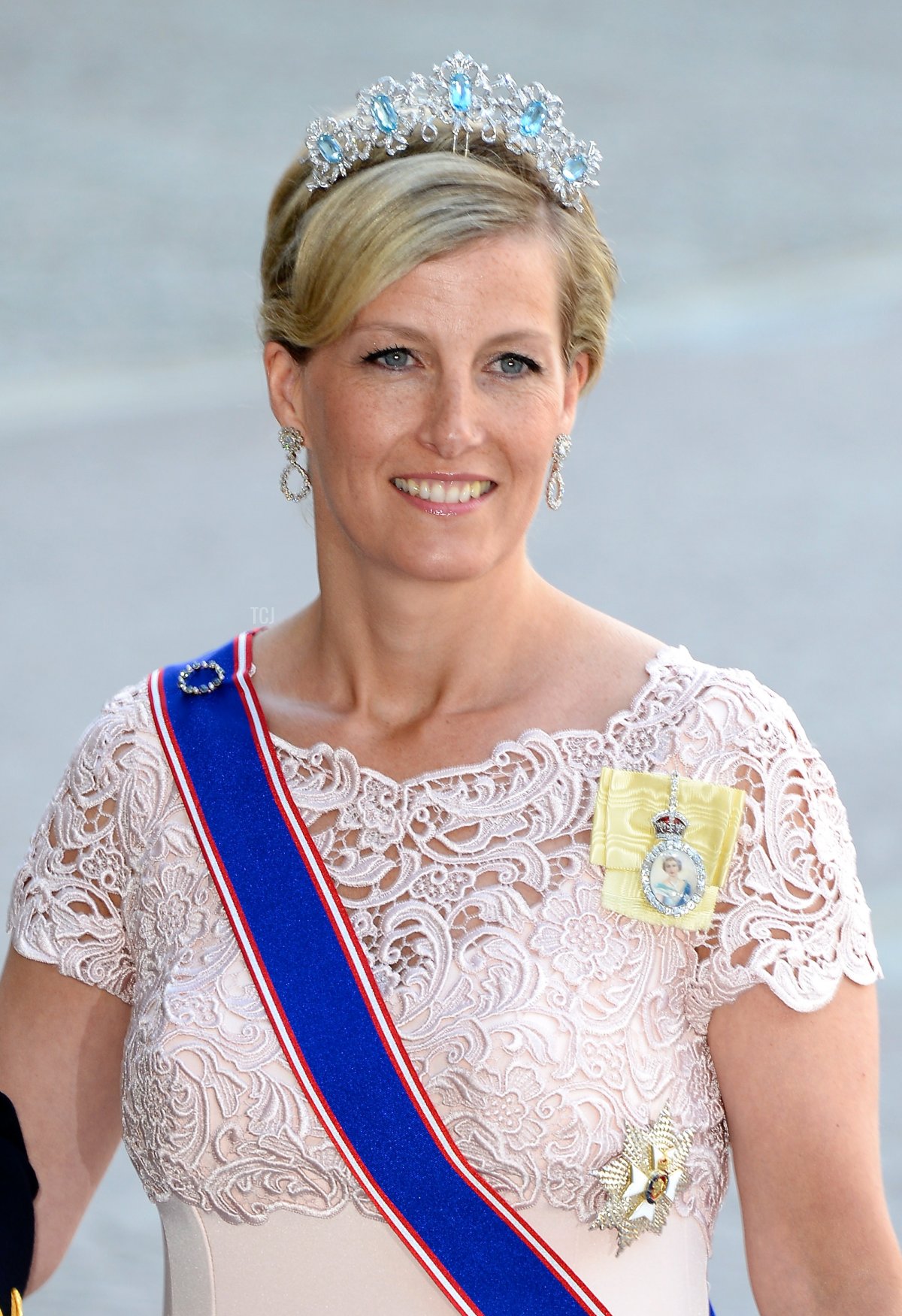 Sophie has worn the tiara on subsequent occasions as well, including a prominent outing at the wedding of Princess Madeleine of Sweden in June 2013. For that event, she paired the tiara with Queen Elizabeth II’s Pear-Shaped Diamond Pendant Earrings and a round brooch that also appears to be set with white and blue gemstones.