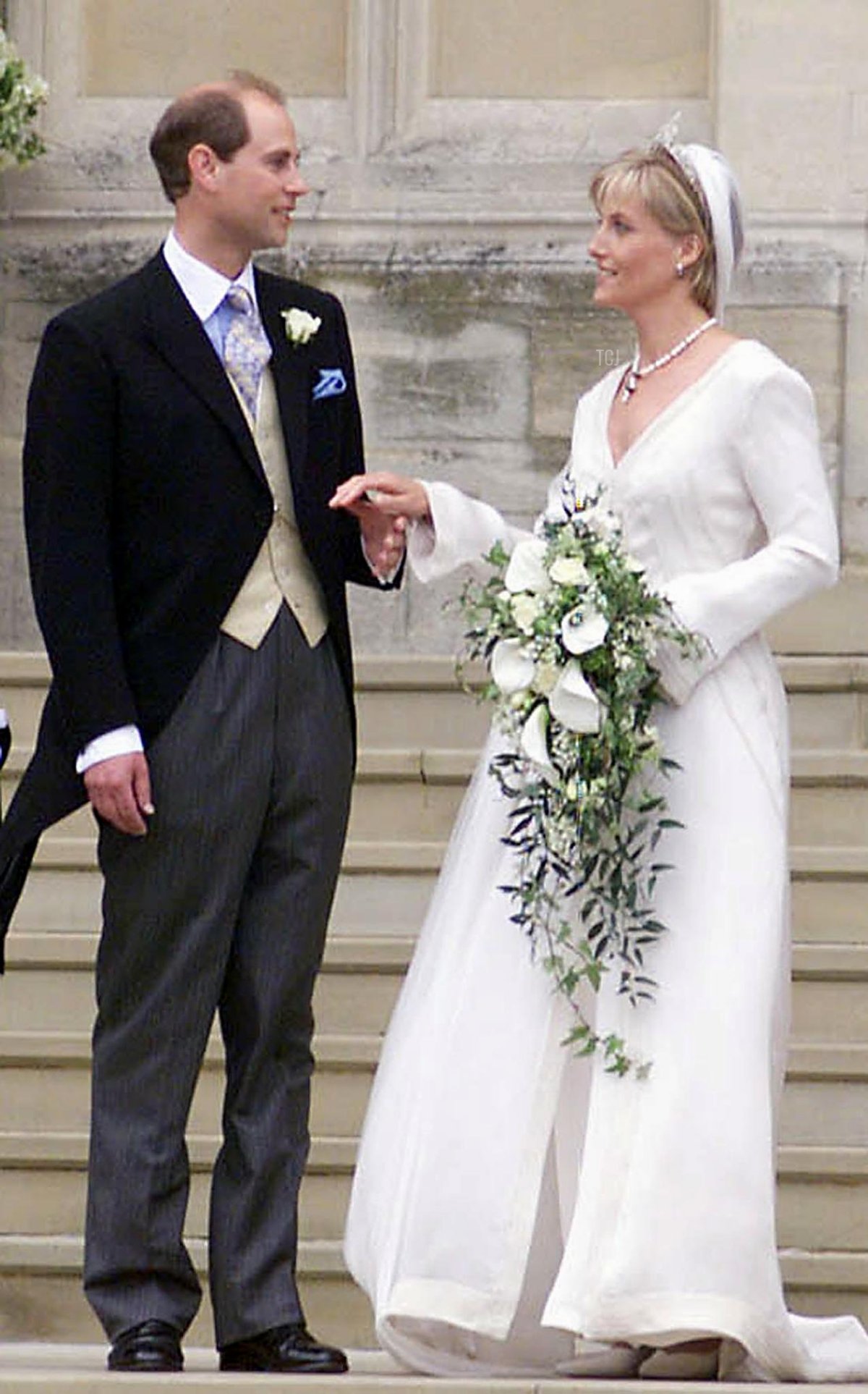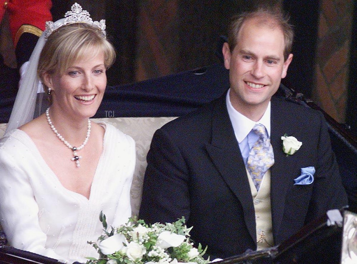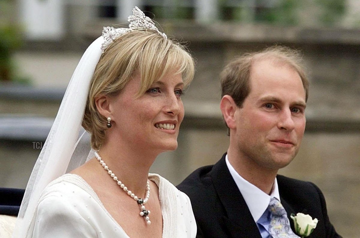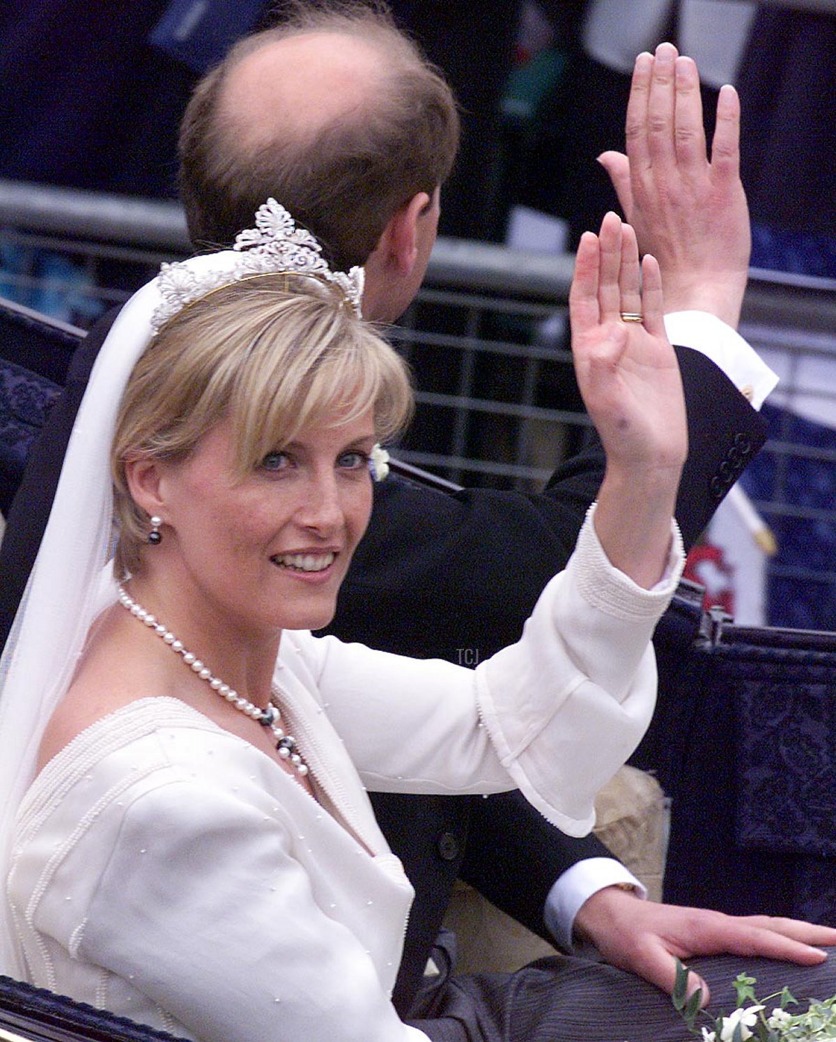 The tiara wasn’t Sophie’s only accessory on her wedding day. She also wore a necklace and earrings designed for her by her new husband, Prince Edward. Both the pieces combine white and black pearls, and the necklace features a cross pendant. Her Welsh gold wedding ring was also new and, like the tiara, was also made by the man who was then the crown jeweller, David Thomas.