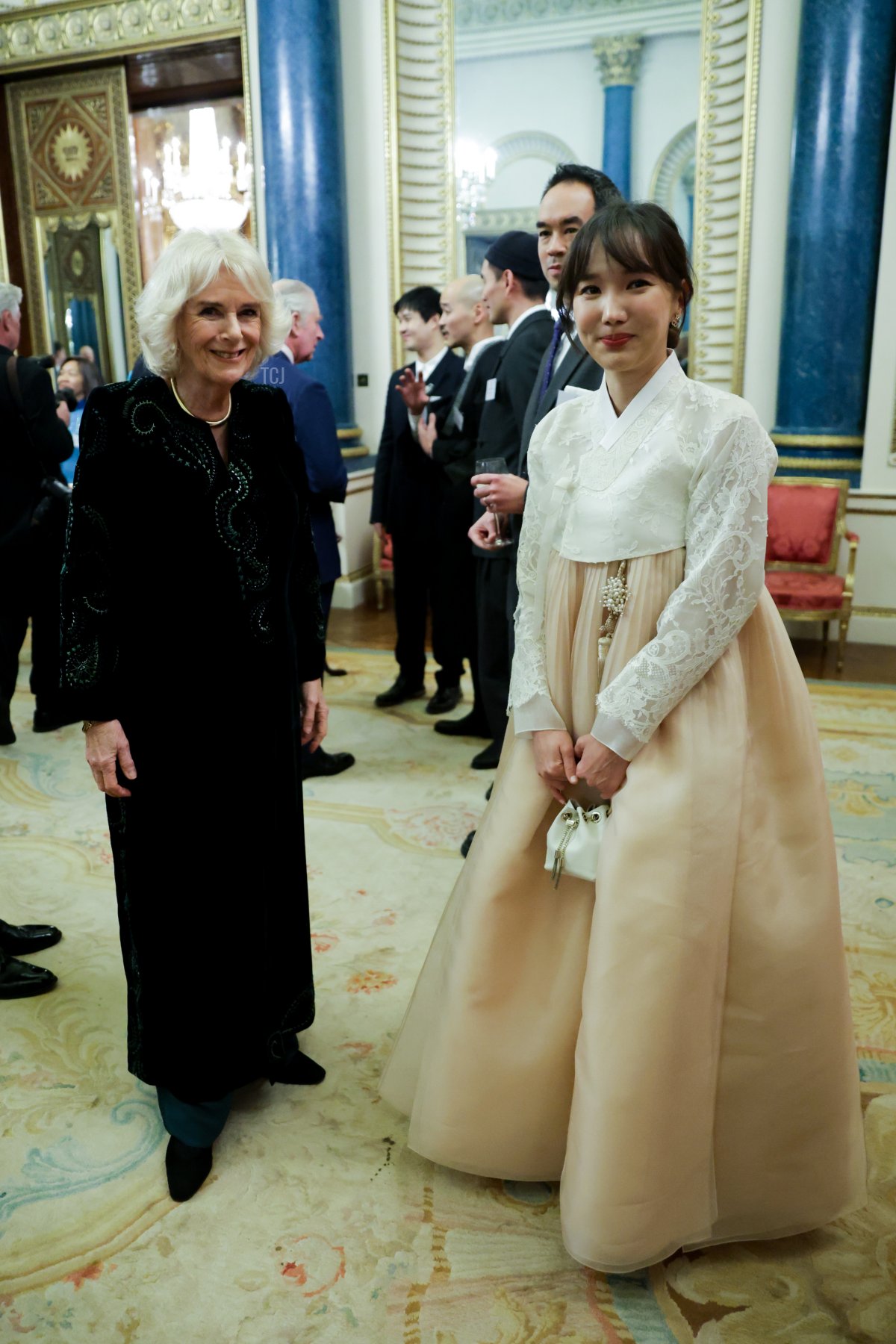 For this second reception, Queen Camilla wore a lovely embroidered ensemble. (Also: check out the gorgeous hanbok worn by this guest at the reception!)