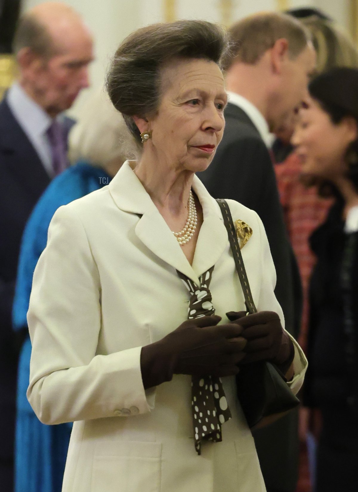 Princess Anne wore the stud portion of her beloved Andrew Grima earrings, plus a triple strand of pearls and her gold ribbon brooch.