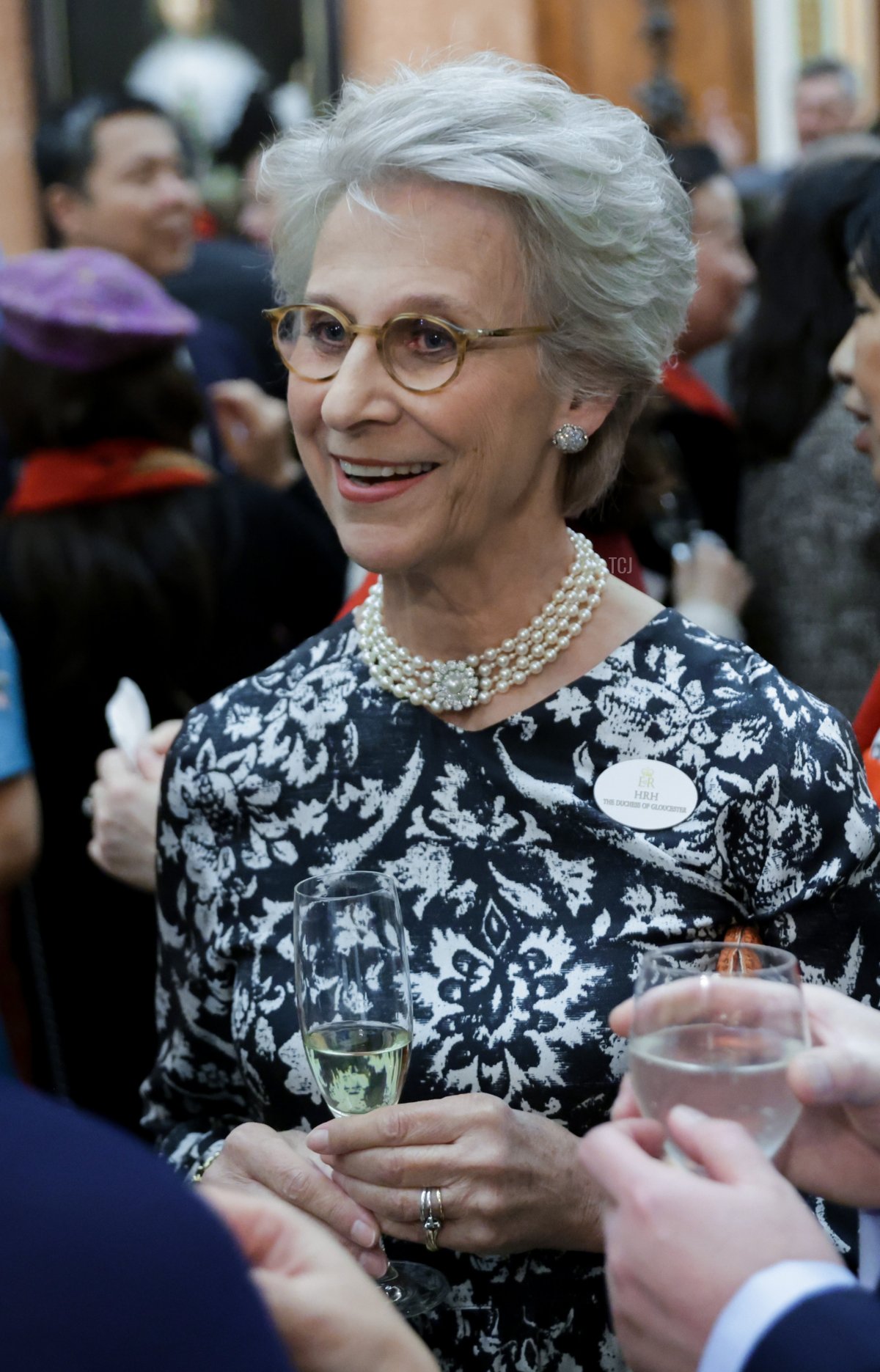 And here’s the Duchess of Gloucester at the reception as well. Birgitte wore gorgeous pavĂ©-set diamond earrings, plus a four-stranded pearl choker necklace with a floral clasp set with diamonds and a central pearl.