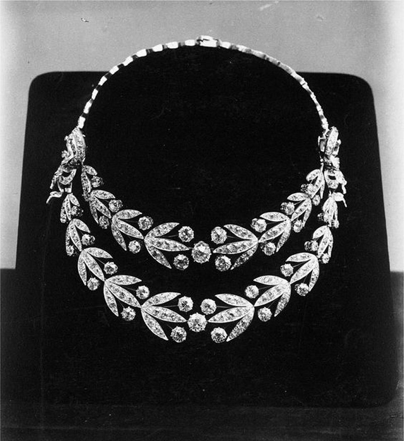 The diamond jewel, with its classic laurel leaf design, comes from Boucheron. A similar piece is showcased in the archival photograph from the firm above. The convertible jewel was given to Princess Margaret as a wedding present by her husband’s grandmother, Queen Sofia of Sweden.