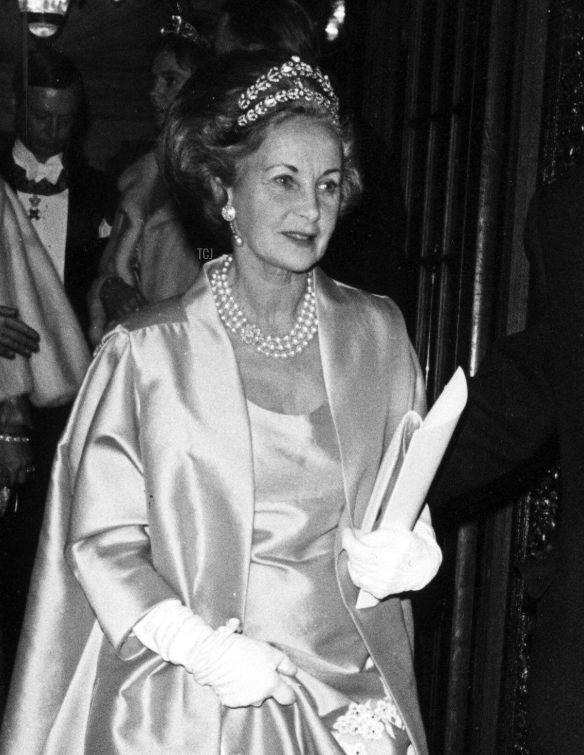 But Bertil and Lilian continued their romance in private—for decades. They lived together quietly and privately at both Bertil’s home in Sweden and their villa on the French Riviera. And, as time went on, royal attitudes toward marriages to commoners changed. Near the end of King Gustaf VI Adolf’s life, Lilian began to be invited publicly to grand royal events. She finally had the chance to use the diamond laurel wreath tiara that Bertil had inherited from his mother. Above, she makes one of her first public appearances in the tiara during King Gustaf VI Adolf’s 90th birthday celebrations in November 1972.