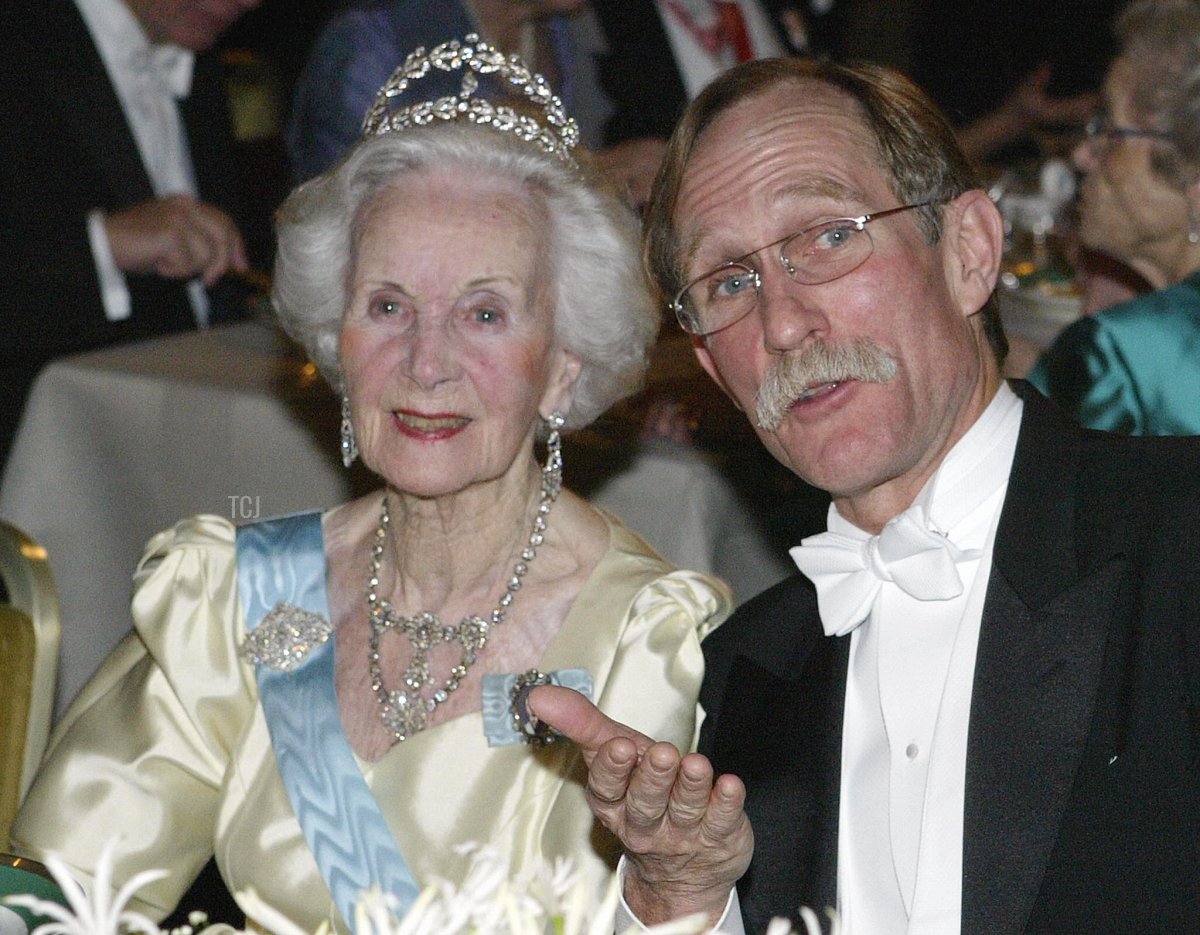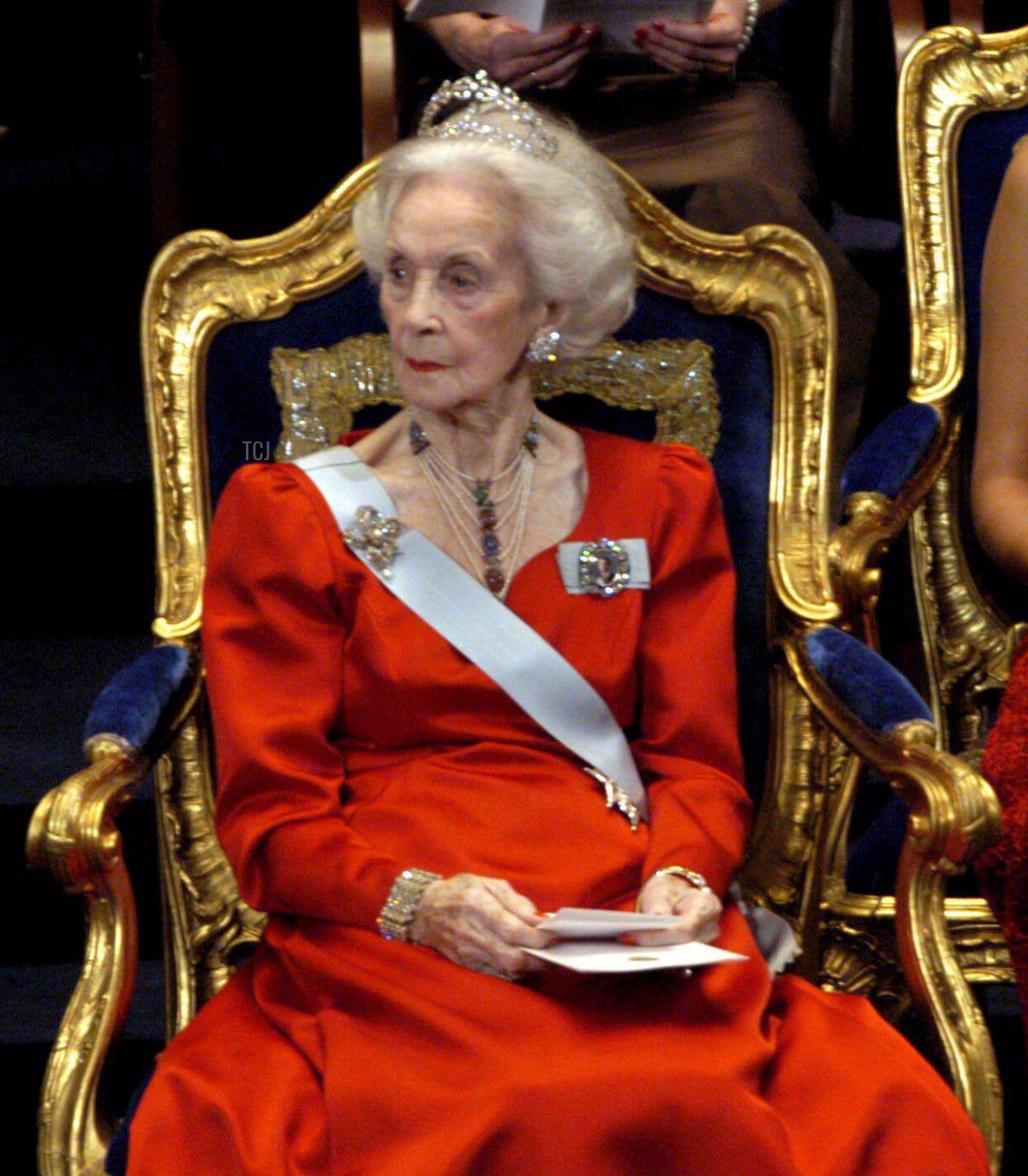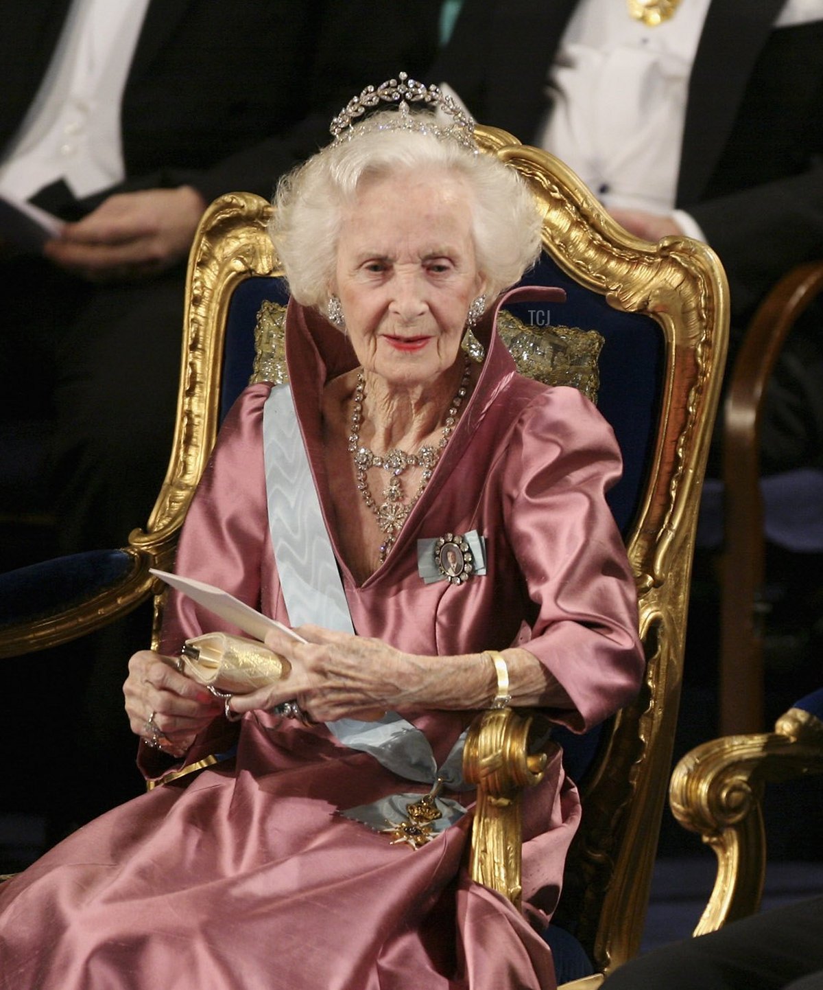 Lilian became a princess four years later, in 1976, when she and Bertil were finally granted permission to marry by his nephew, King Carl XVI Gustaf. She remained a beloved member of the royal family for the rest of her life, filling a grandmotherly role for Carl Gustaf’s children. She could often be spotted wearing tiaras at events like state dinners and the annual Nobel Prize ceremony and banquet. She particularly liked to pair the laurel wreath tiara with another heirloom jewel: the necklace made by transforming Queen Josefina’s Diamond Stomacher. She wears the combination above at the Nobels in December 2003.
