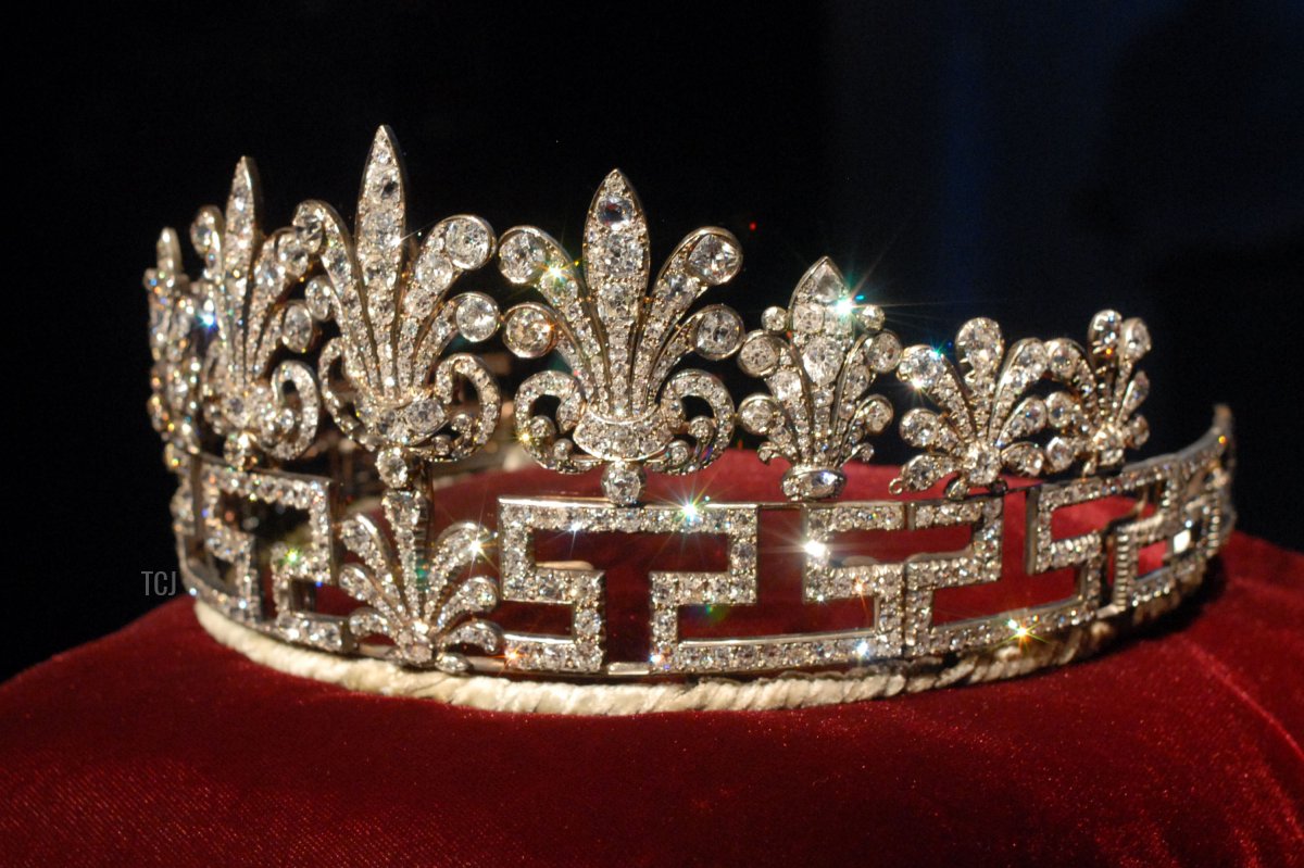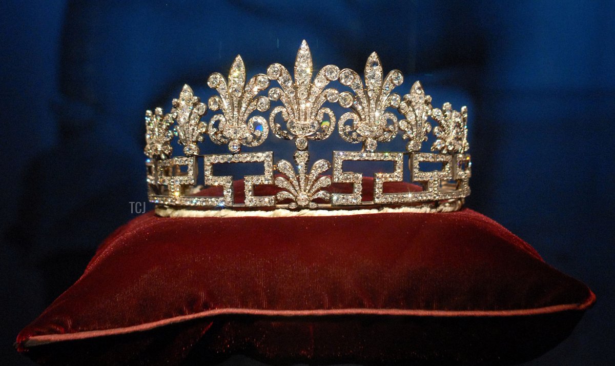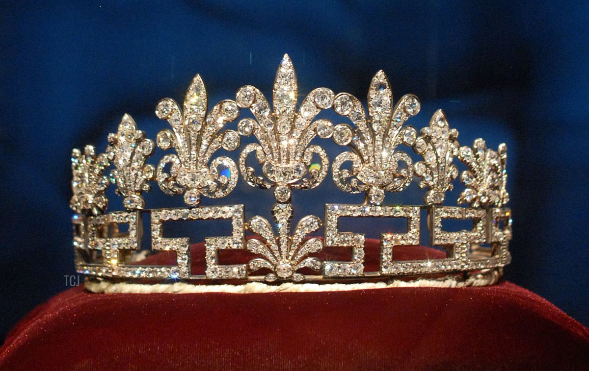 The tiara was still in a similar bandeau-style setting when Cynthia Spencer wore it for the coronation of Queen Elizabeth II in 1953. At some point, however, the tiara was transformed into a taller, more traditional diadem. The diamond meander elements, which resemble the letter “S” for Spencer, was used as the base of the tiara, with most of the honeysuckle elements placed on top of the meander design. A single honeysuckle element was also placed at the center of the tiara’s base.