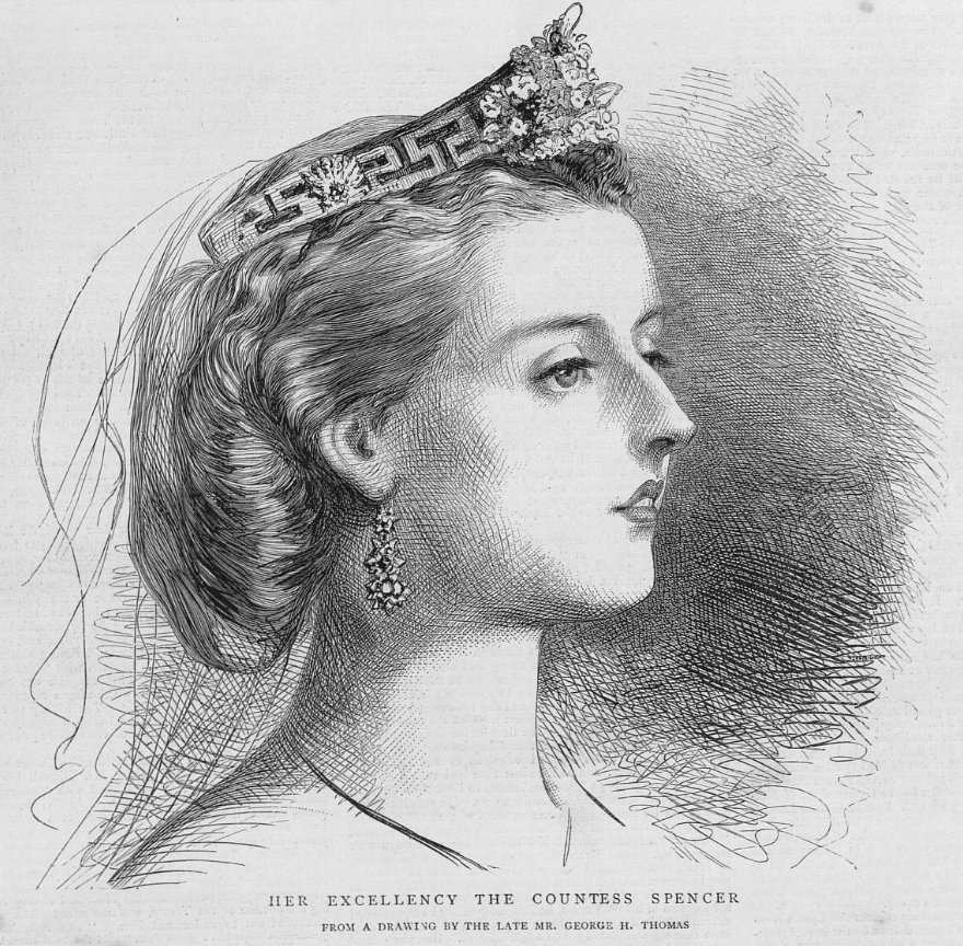 One of the tiaras that Cynthia wore as a courtier was the Spencer Tiara, made famous two generations later when her granddaughter, Lady Diana, wore it for her 1981 wedding to the Prince of Wales. The other was an interesting jewel with honeysuckle and meander design motifs. The tiara has taken various forms over the years. Its first wearer is said to have been Charlotte Seymour, who married the 5th Earl Spencer in 1858. One of the earliest depictions of Charlotte wearing a version of the honeysuckle and meander tiara appears to be this illustration, published in The Graphic in 1872.
