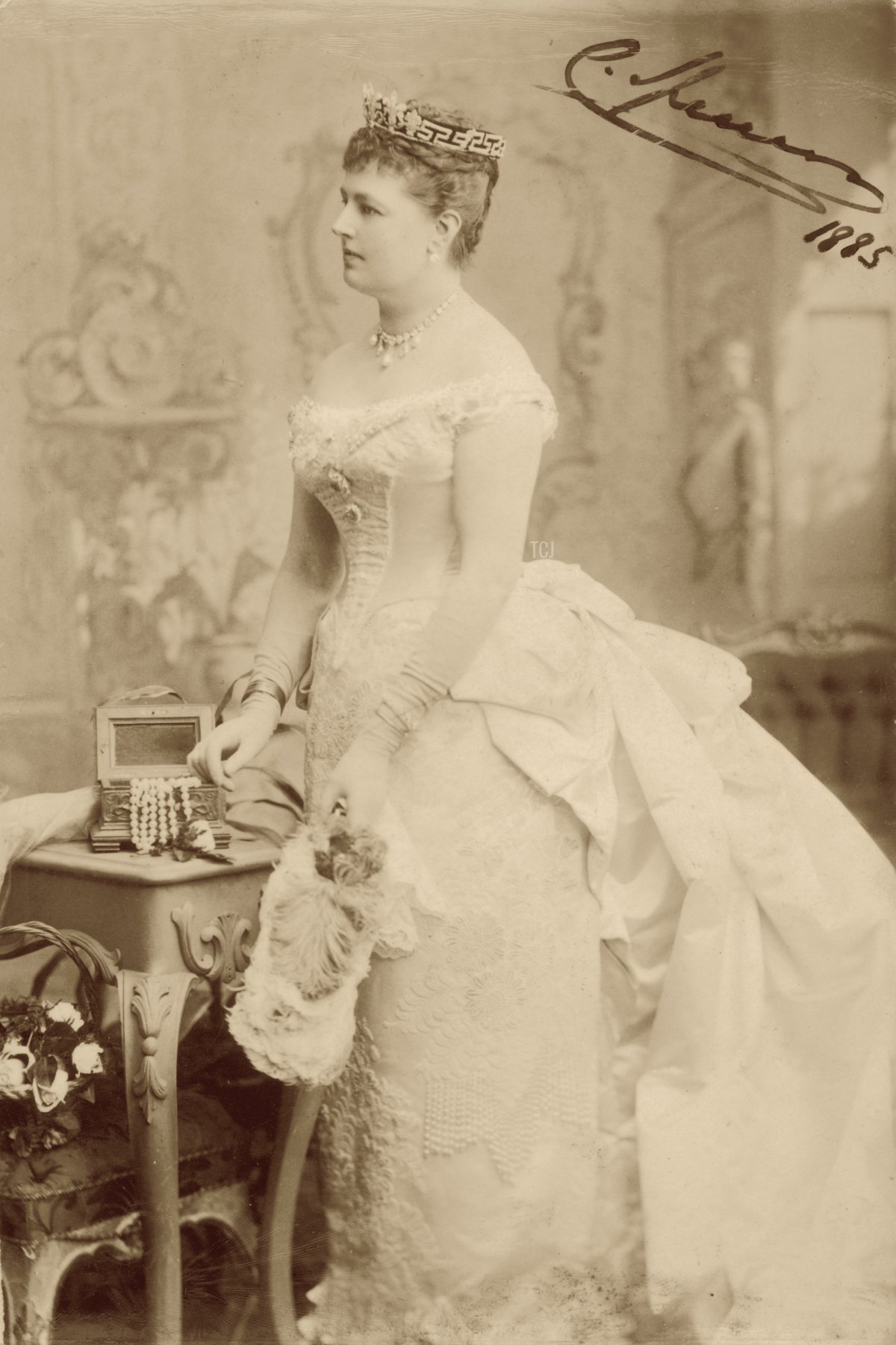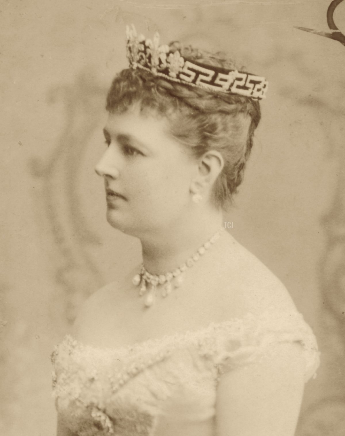 The 5th Earl Spencer also served two tenures as Lord Lieutenant of Ireland. In April 1885, when the Prince and Princess of Wales made a visit to Ireland, they were the guests of honor at a banquet hosted by the Spencers at Dublin Castle. This portrait of Charlotte wearing the honeysuckle and meander tiara may date from the time of that visit. She certainly wore a tiara for the banquet at the castle. The Belfast News-Letter noted, “The Countess Spencer wore a white satin dress with pearl ornaments, her headdress being a tiara set with diamonds. A brilliant diamond necklace was also worn by her Excellency.”