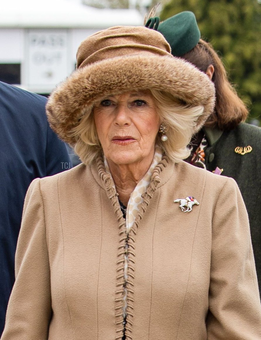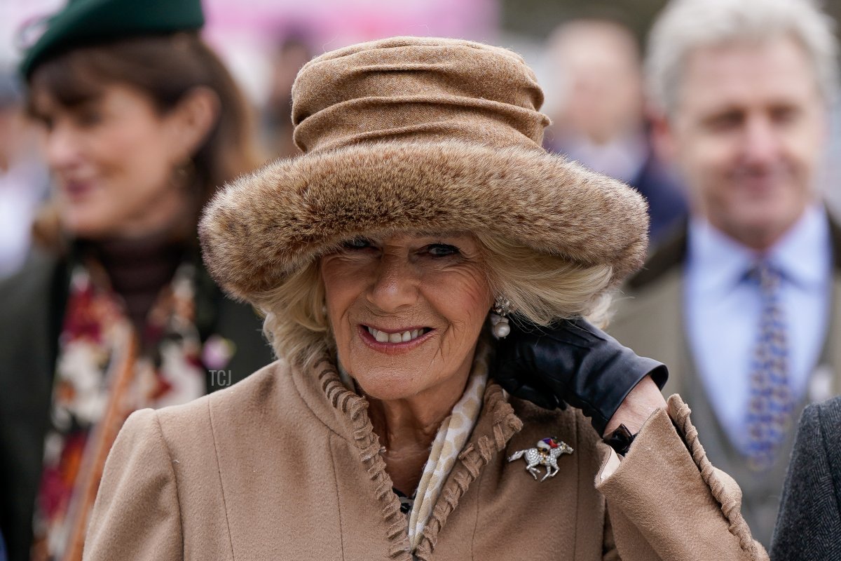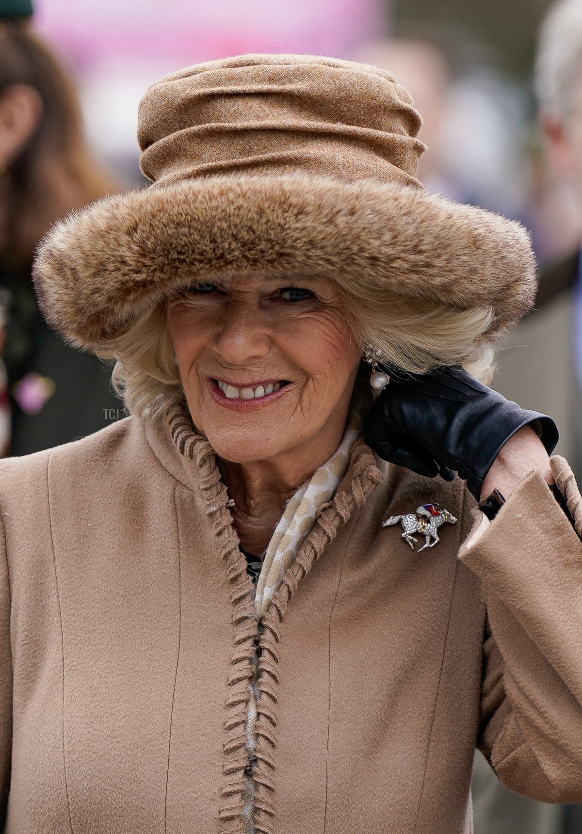 Queen Camilla attended Ladies’ Day at the Cheltenham Festival on Wednesday, wearing a sparkling racing-themed brooch with a mystery provenance.