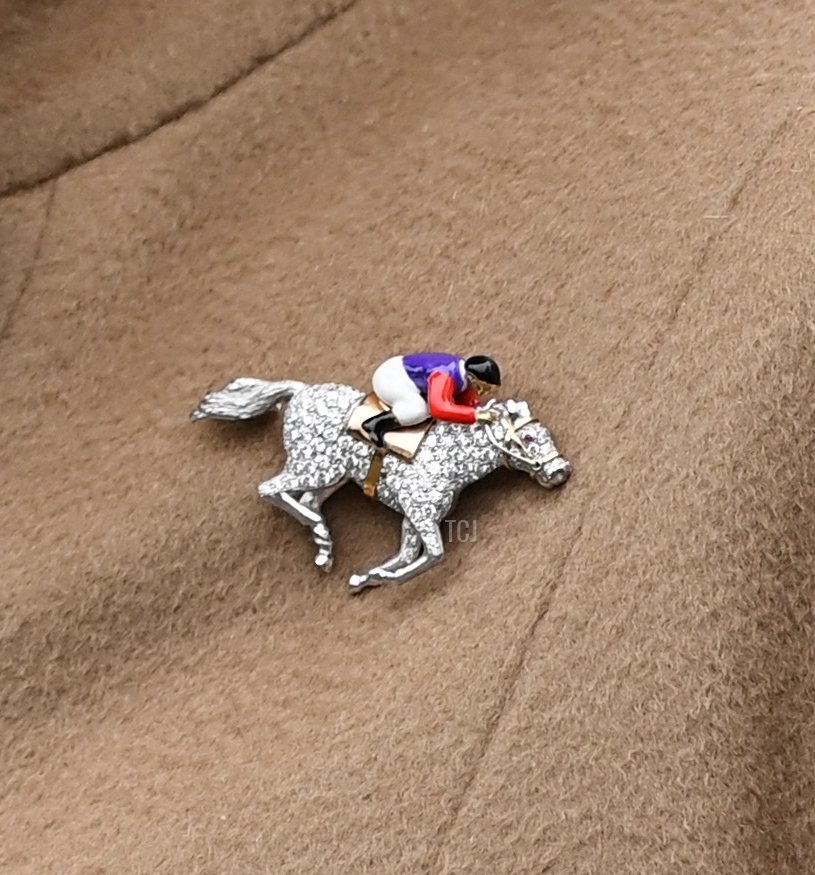 The brooch features a pavé-set diamond horse, ridden by a jockey wearing the late Queen Elizabeth II’s silks.