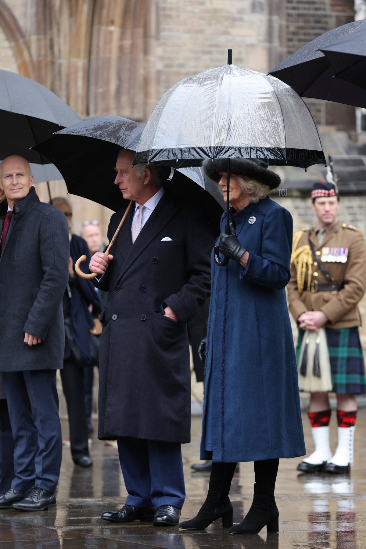 For Friday’s engagements, Camilla wore a blue coat with dark accessories, including a fur-trimmed hat.