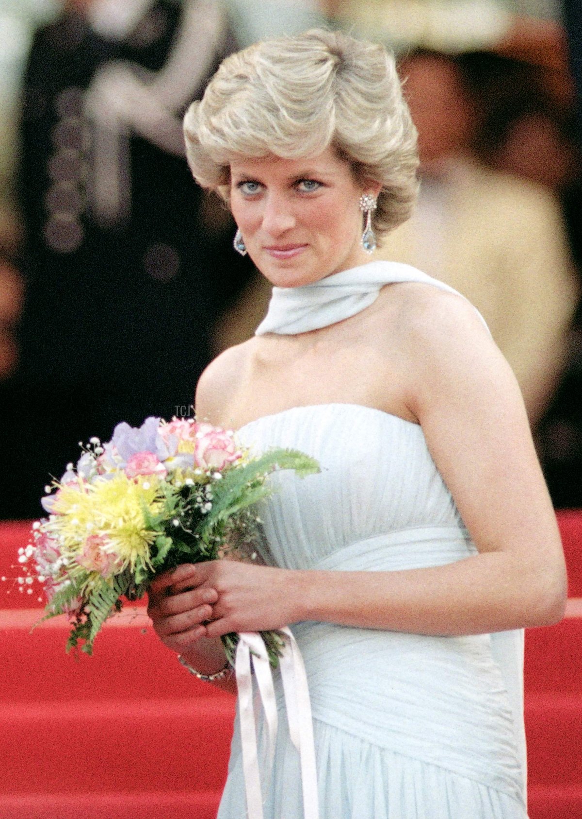Diamonds and aquamarines were natural accessories to pair with the blue chiffon gown. Diana wore a pair of earrings with diamond floral studs and pear-shaped aquamarine drops set in a slender diamond frame.