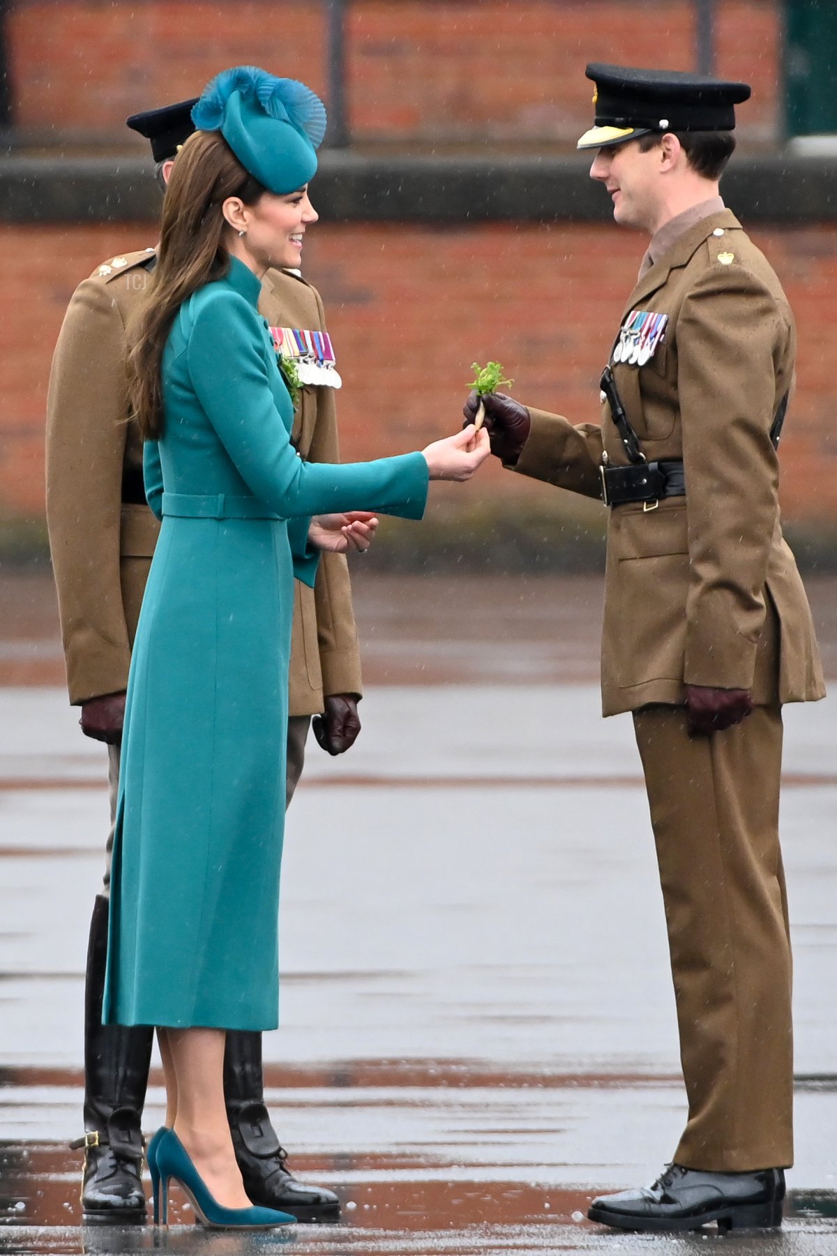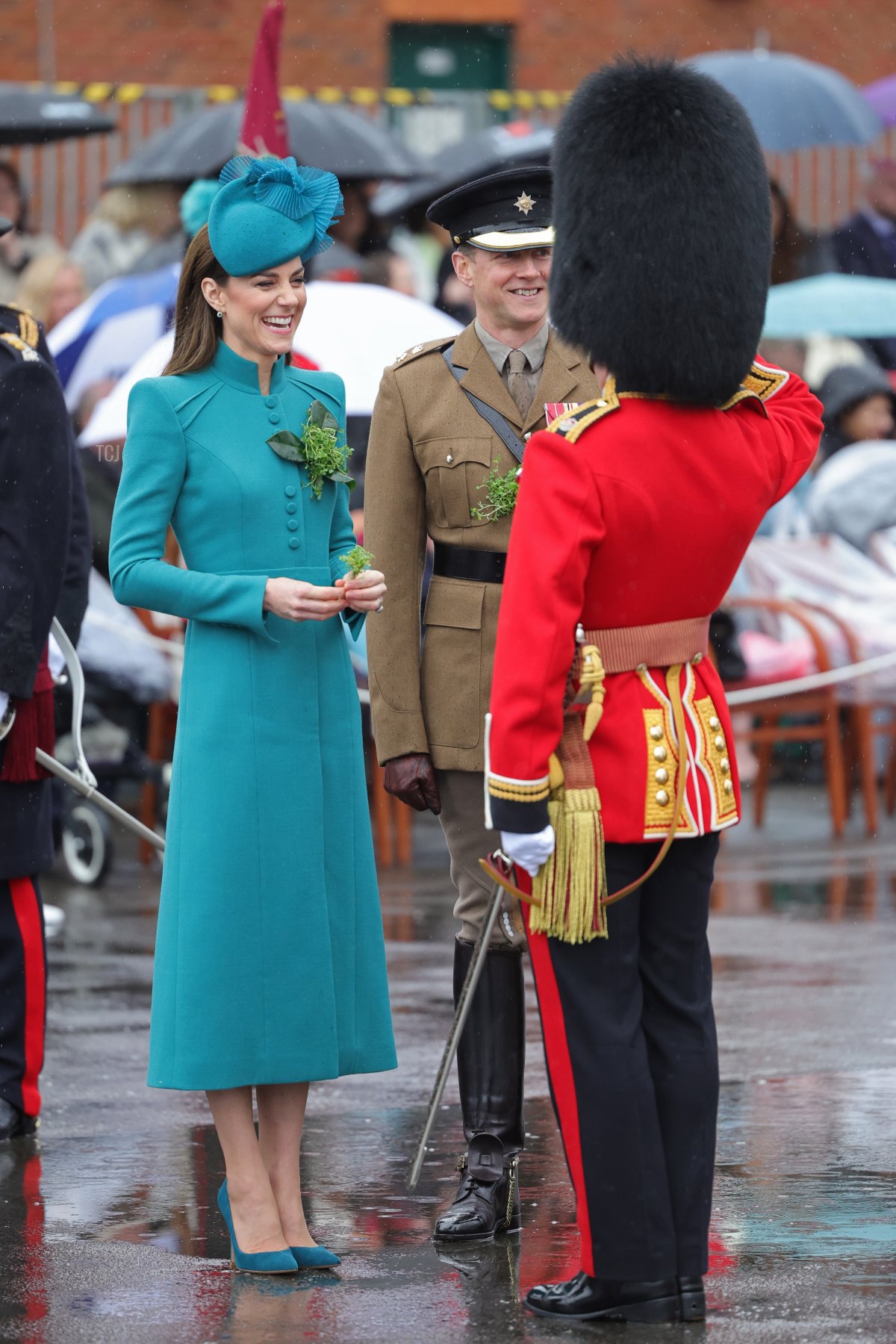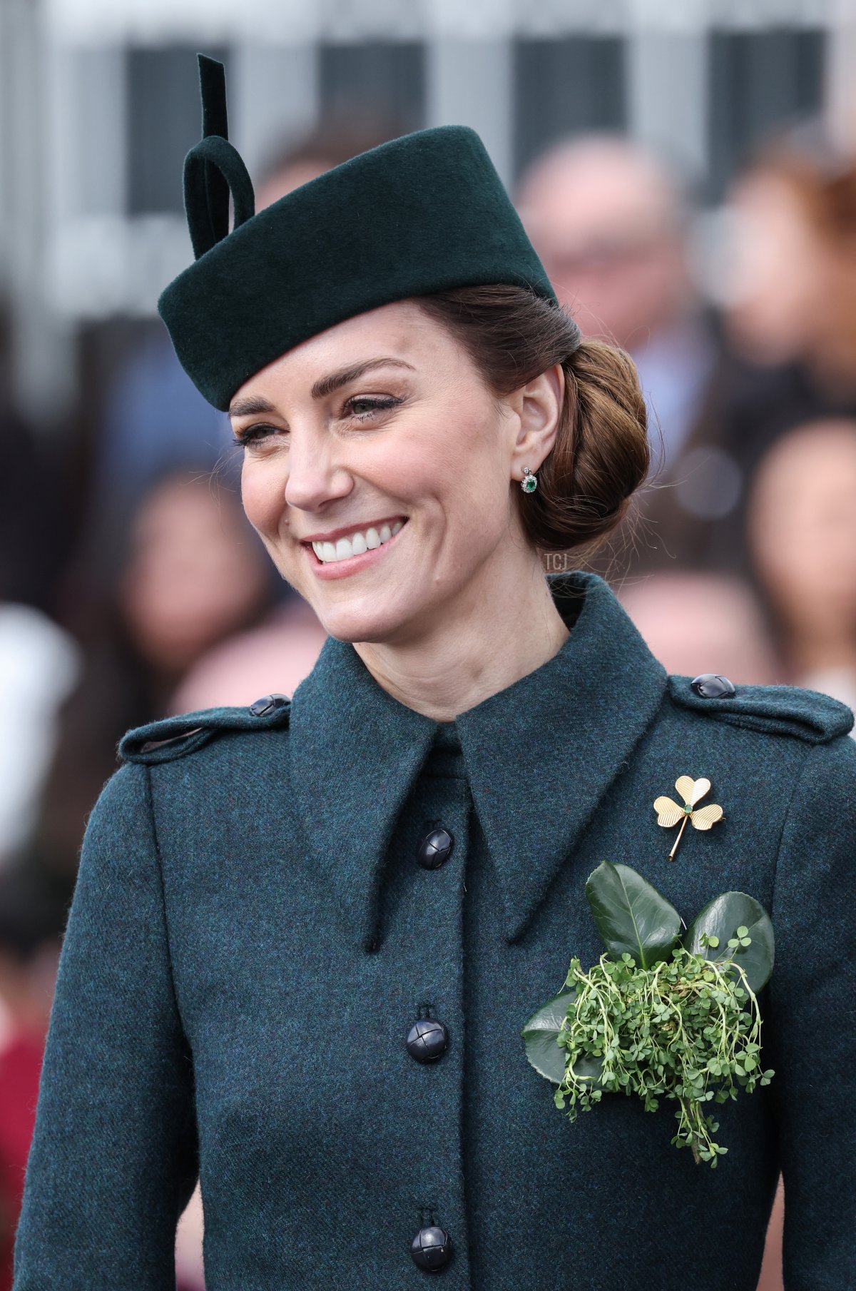 As she has almost every year since her royal marriage, Princess Catherine presented sprigs of shamrocks during the parade. The tradition of royal ladies presenting shamrocks to the guards was begun by Queen Alexandra.