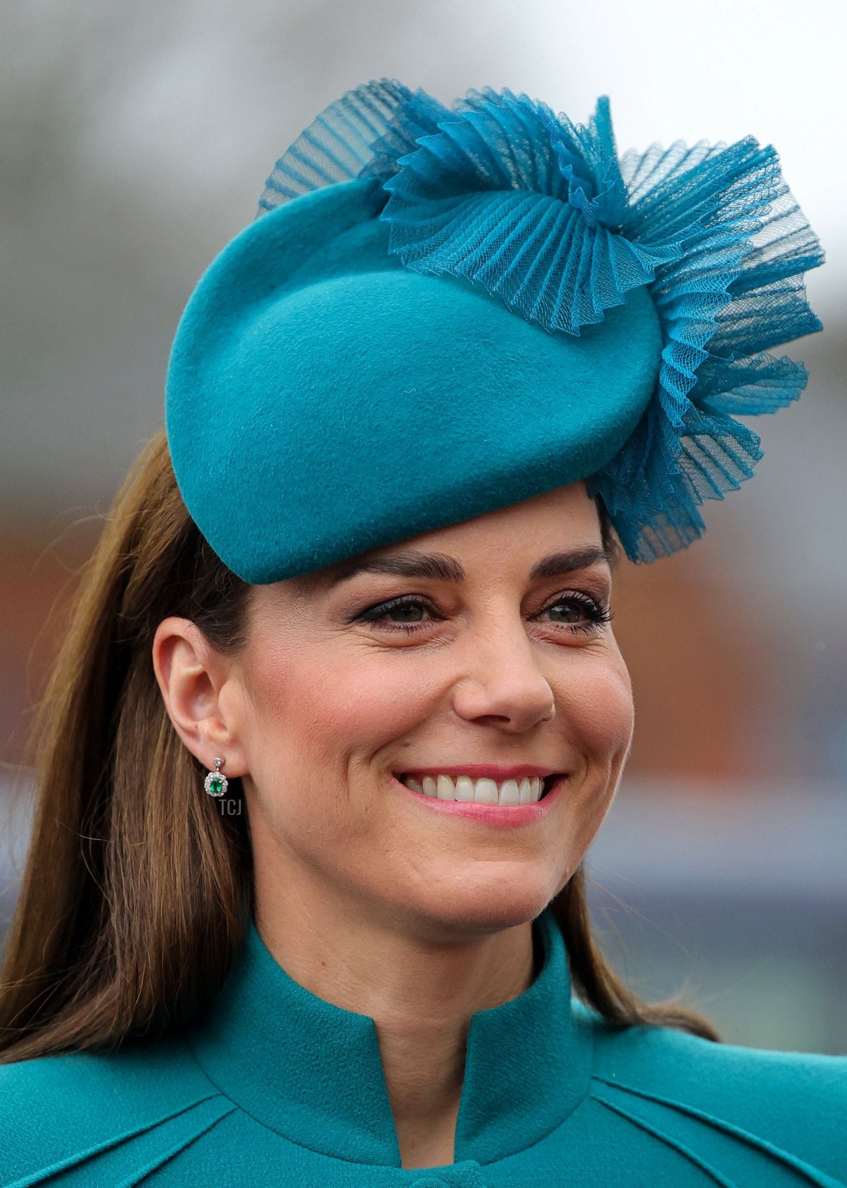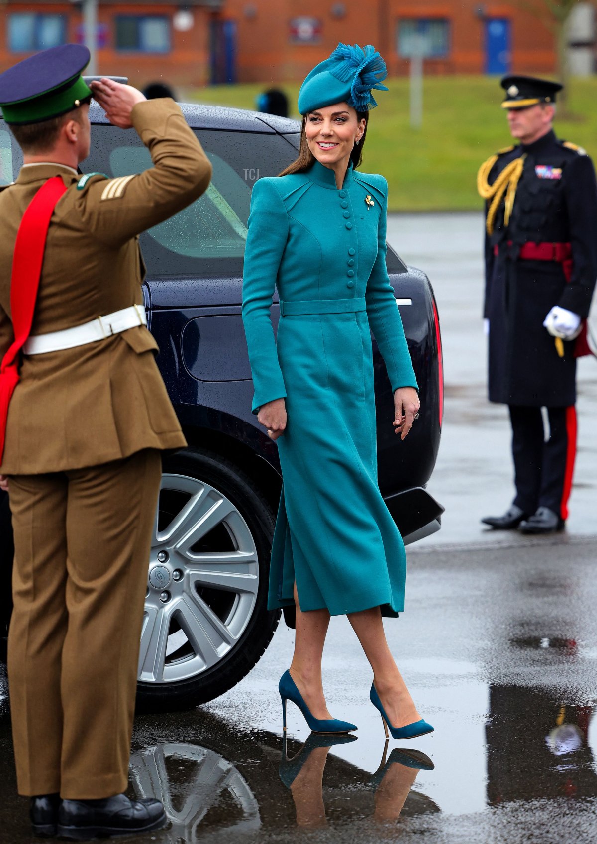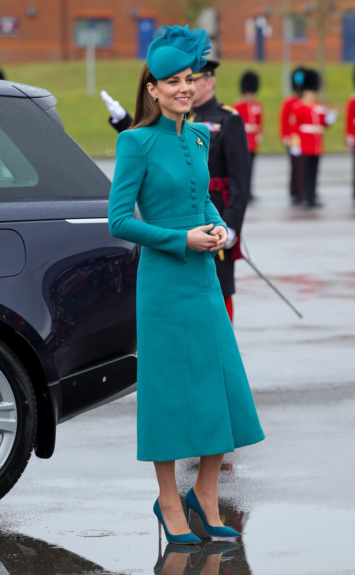 For the parade, Kate wore a teal ensemble featuring a coat dress by Catherine Walker and a matching Jane Taylor hat.