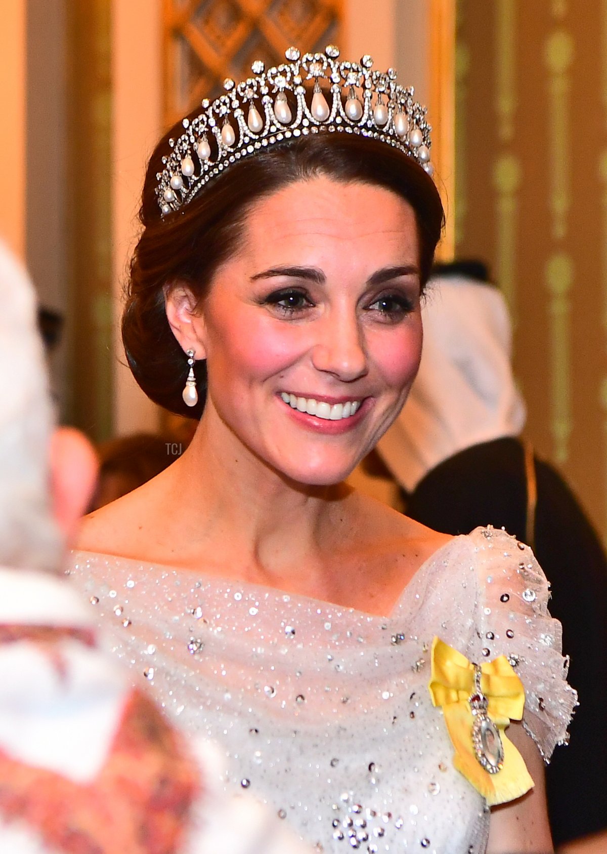 Her most-worn tiara is undoubtedly Queen Mary’s Lover’s Knot Tiara, which she has worn for banquets and receptions on numerous occasions. Above, she wears the tiara for the Diplomatic Reception in December 2018.