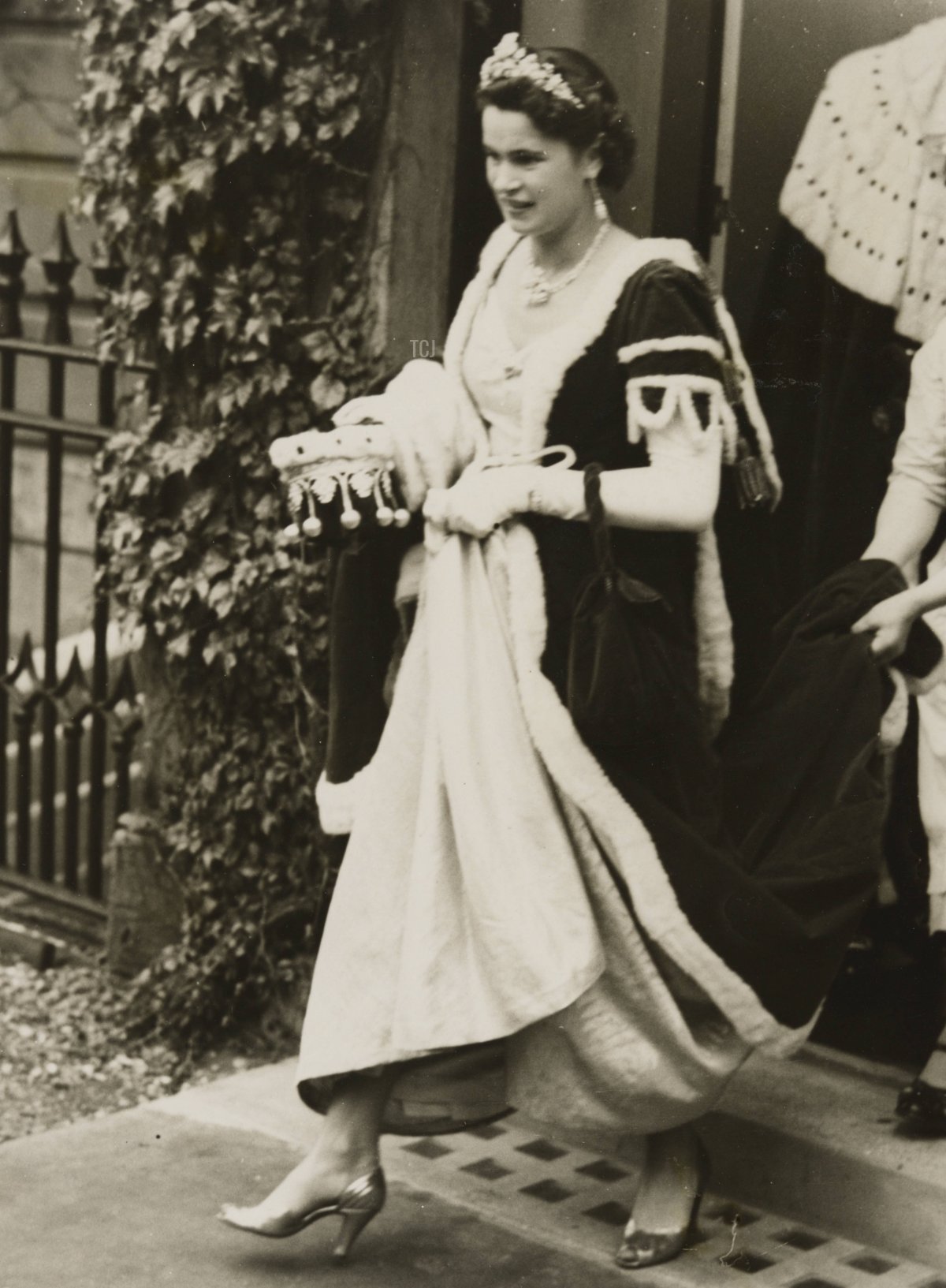 Usually, ladies wear their tiaras for the duration of the event, only adding the coronet during the appropriate moment of the ceremony. Here, the Countess of Harewood (wife of Queen Elizabeth II’s cousin, the Earl of Harewood) wears her tiara as she leaves home for Westminster Abbey to attend the coronation of Queen Elizabeth II in 1953. You’ll note that she’s carrying her coronet in her hand.