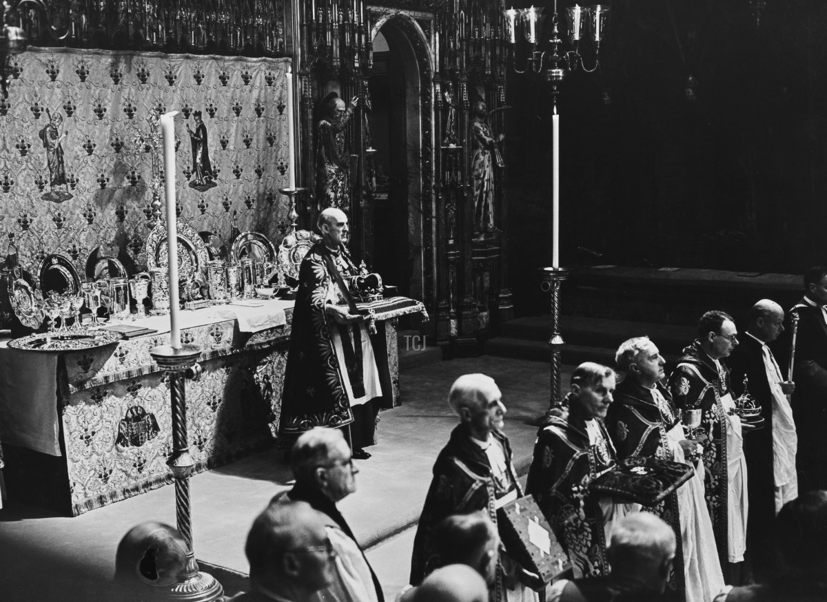 Members of the royal family, including Princesses Elizabeth and Margaret, processed in to the Abbey shortly after ten o’clock that morning. The King and Queen’s procession arrived sharply at eleven. Archbishop Cosmo Lang conducted the service that followed, which lasted two and a half hours after the arrival of the monarch and his consort.