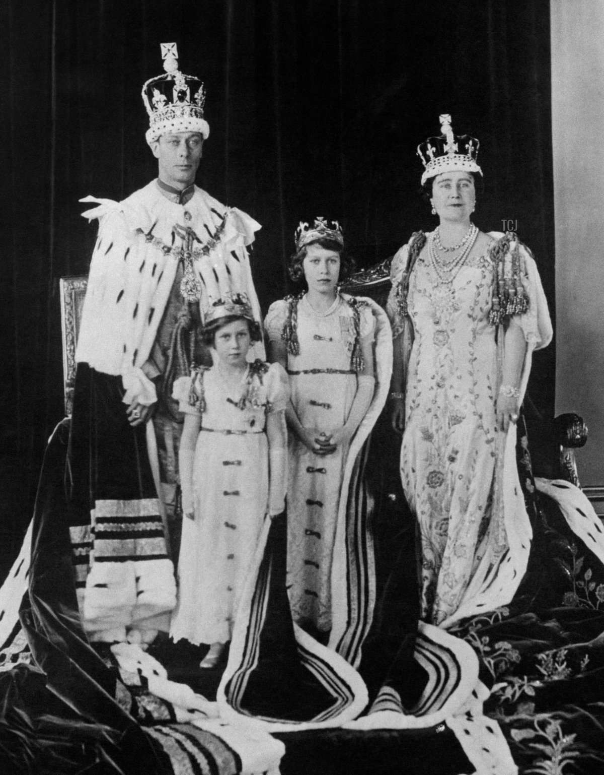 The King and the Queen posed in their coronation finery for several portraits on the day, including this picture with their daughters, Princess Elizabeth and Princess Margaret. The girls wore special silver-gilt coronets that had been made for them by Garrard. They also wore pearl necklaces that had been given to them in 1935 by their grandfather, King George V, as a Silver Jubilee present. Elizabeth’s necklace had three rows of pearls, while Margaret’s had two.