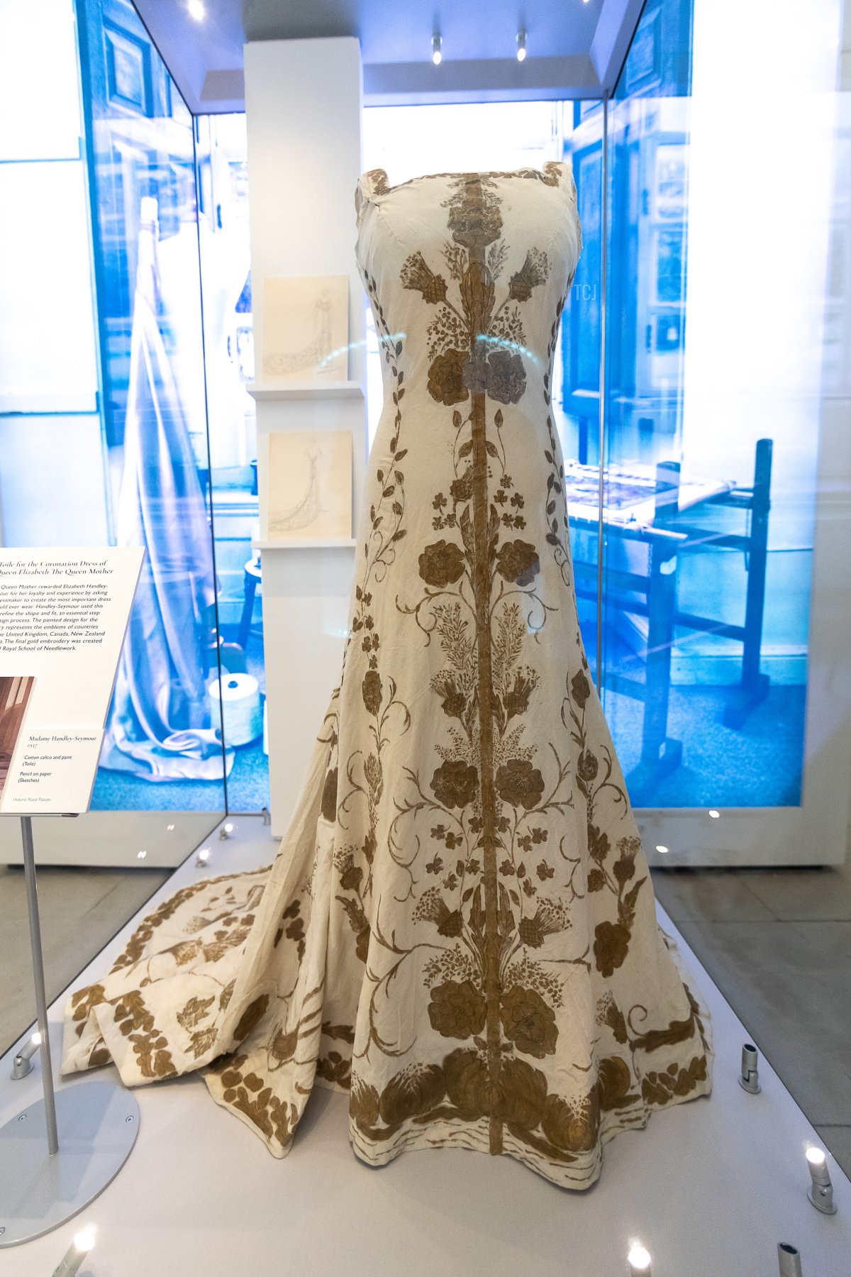 The silk satin gown that Elizabeth wore for the coronation was made by Elizabeth Handley-Seymour, the London-based couturier who had also made Elizabeth’s wedding dress in 1923. The photograph above shows a rare surviving toile from the process, a full-size working pattern that allowed the designer and sewers to test the fit of the gown before making a final version. The toile is decorated with the patterns that would be embroidered in golden thread. The emblems on the gown were largely floral, including national symbols like the English rose, the Scottish thistle, and the Irish shamrock. Numerous floral symbols from the Commonwealth (then still the Empire) were also embroidered on the gown, including the Indian lotus flower and the South African protea.