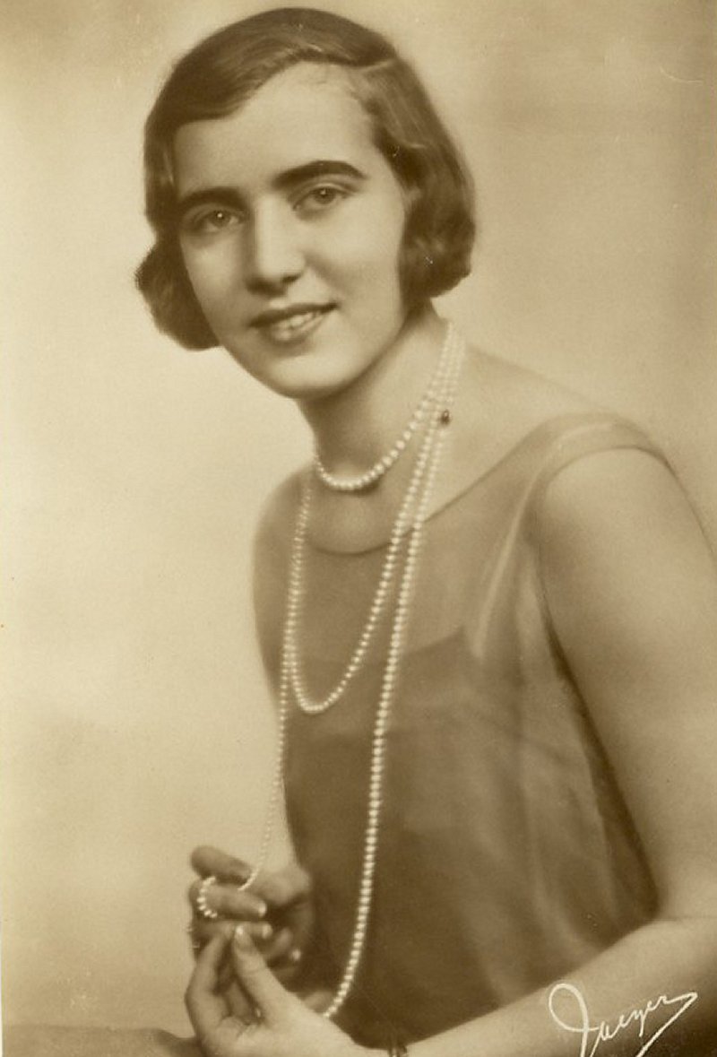 As she grew older, Princess Ingrid was also often photographed wearing the pearls. Here, she’s even wrapping them around her hands, just like her mother did in earlier pictures. This image, which dates to the late 1920s, shows the necklace’s ruby clasp as well.