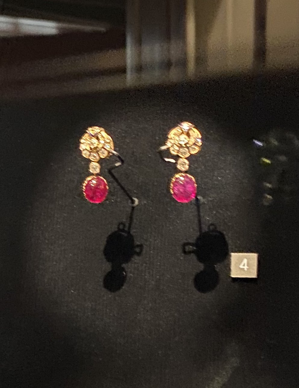 Here’s a look at the earrings, also from last year’s Golden Jubilee jewelry exhibition at Amalienborg. The ruby drop of each earring coordinates nicely with the ruby clasp of the pearl necklace, so it’s easy to see why Queen Margrethe often wears them as a set.