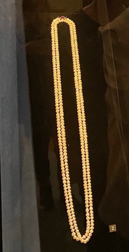 When I say that the necklace was long, I mean that it was long. A whopping 332 freshwater pearls are strung on the necklace, which was made at some unknown point before the 1905 wedding. In this photograph, from the big display of jewels at Amalienborg last year, you can see just how impressively lengthy the necklace is. You can also catch a glimpse of the little ruby-set clasp.