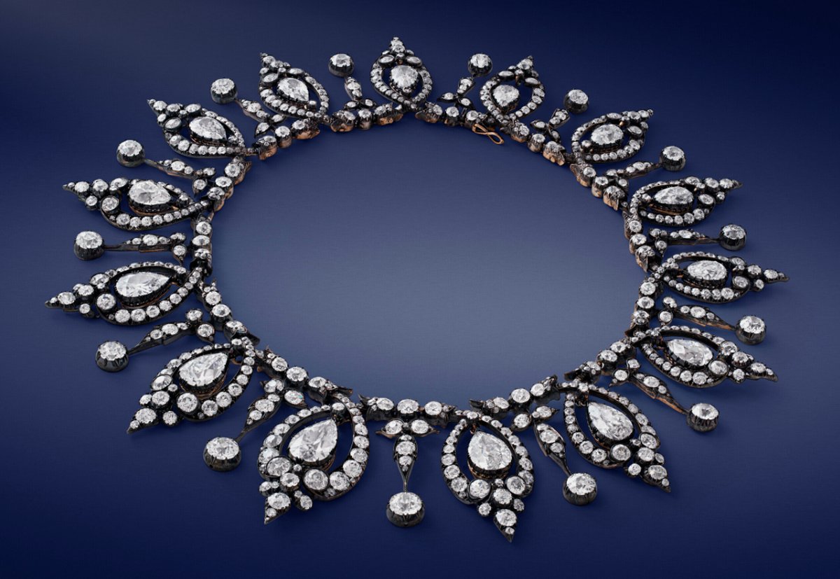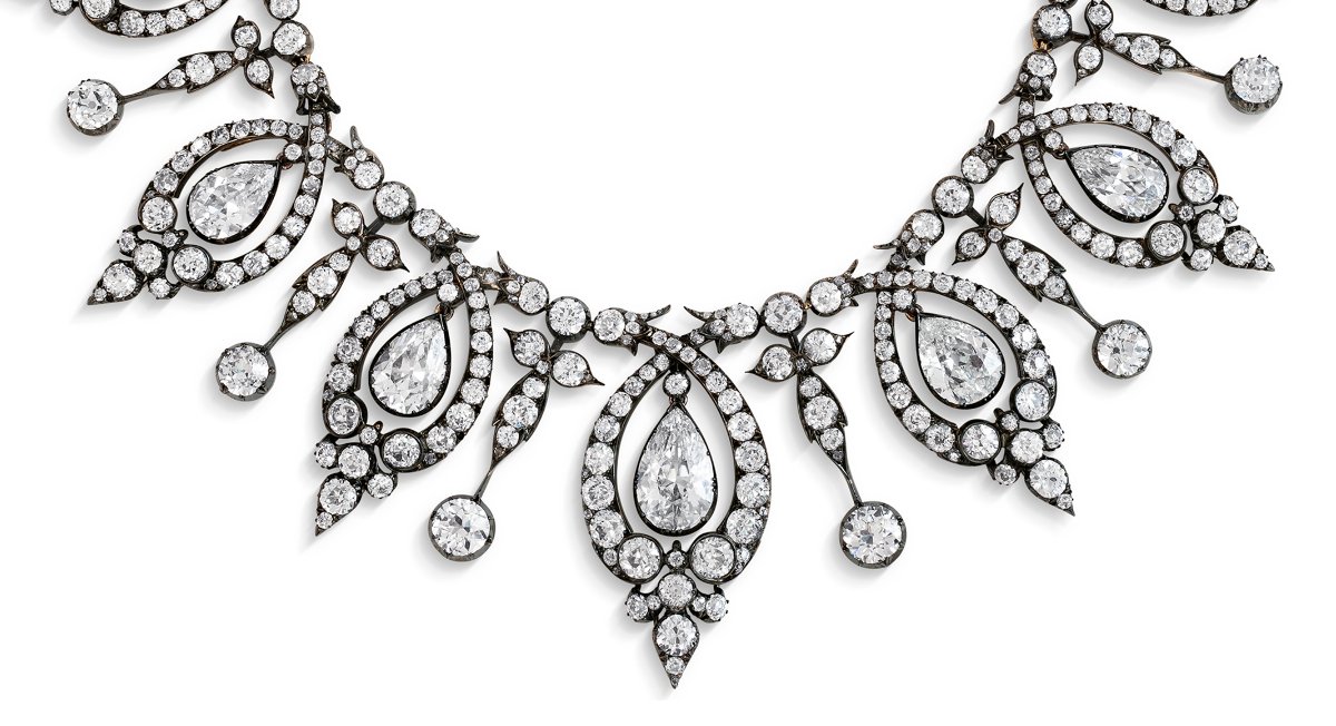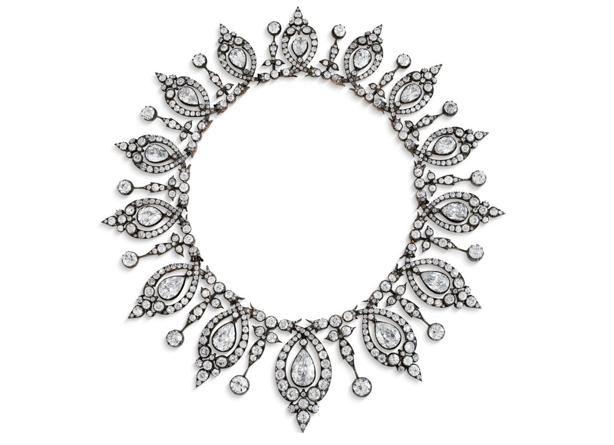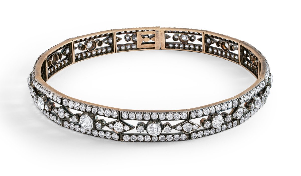 The jewel in question is a gorgeous convertible piece from the Victorian period, able to be worn as a tiara or a necklace. It dates to around 1890 and is set with old-cut and rose-cut diamonds in gold and silver.