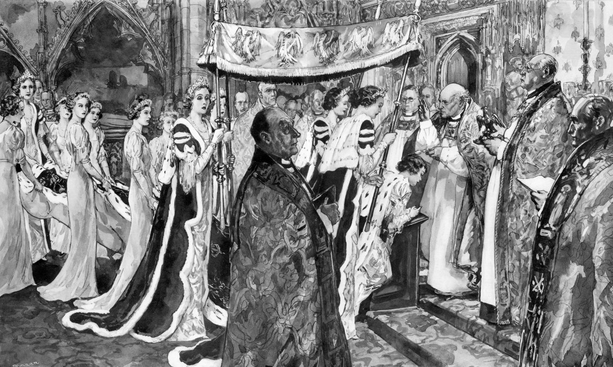 A year and a half after her wedding, the new Duchess of Roxburghe served as one of the canopy bearers at the coronation of King George VI and Queen Elizabeth on May 12, 1937. In this illustration, which depicts the anointing of Queen Elizabeth, she is positioned at the back of the canopy on the Queen’s left side. The Duchesses of Rutland, Norfolk, and Buccleuch hold the other three corners of the canopy.