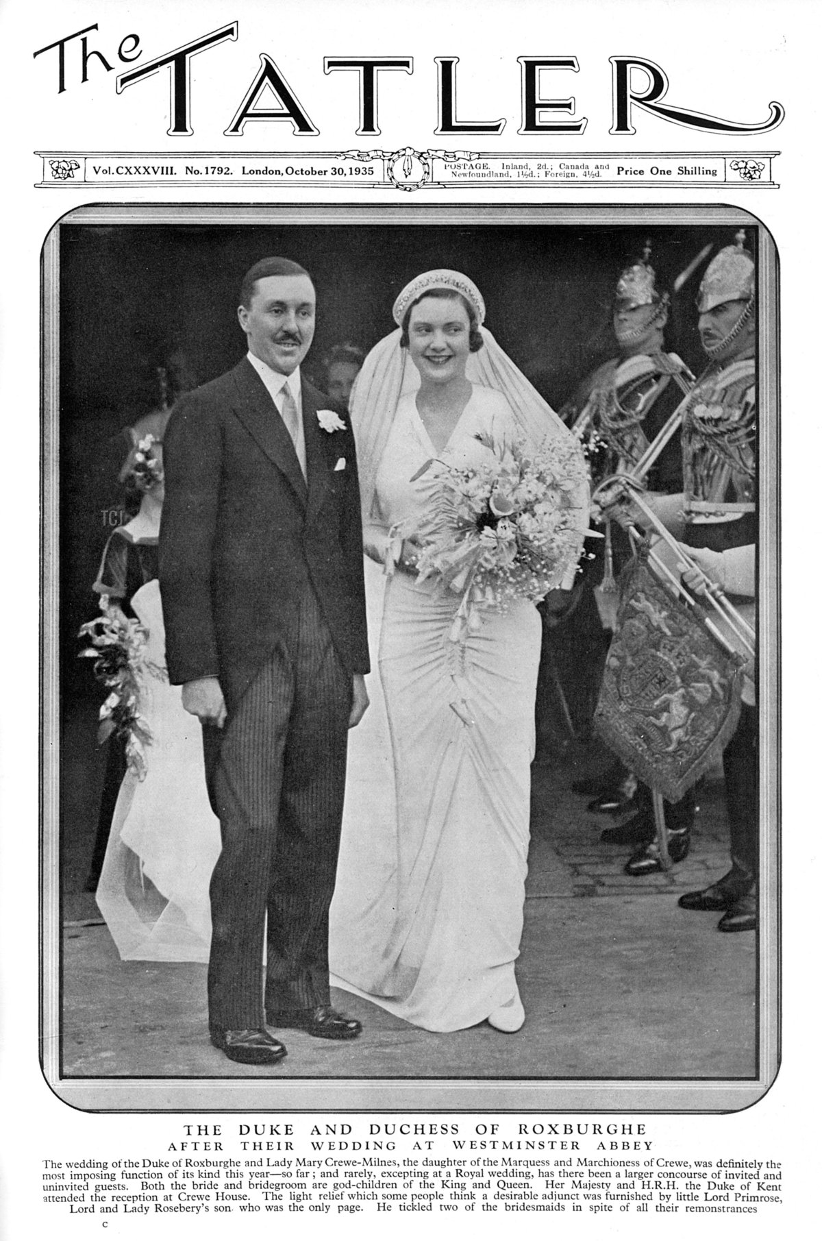 Lady Margaret’s tiara was inherited by her only daughter, Lady Mary Crewe-Milnes. Like her mother, Lady Mary (who was described in on 1930s article as “vividly beautiful”) also made a brilliant marriage. She married George Innes-Ker, the 9th Duke of Roxburghe, in a sparkling ceremony at Westminster Abbey in October 1935 that was attended by Queen Mary (for whom she was named) and the Duke of Kent.