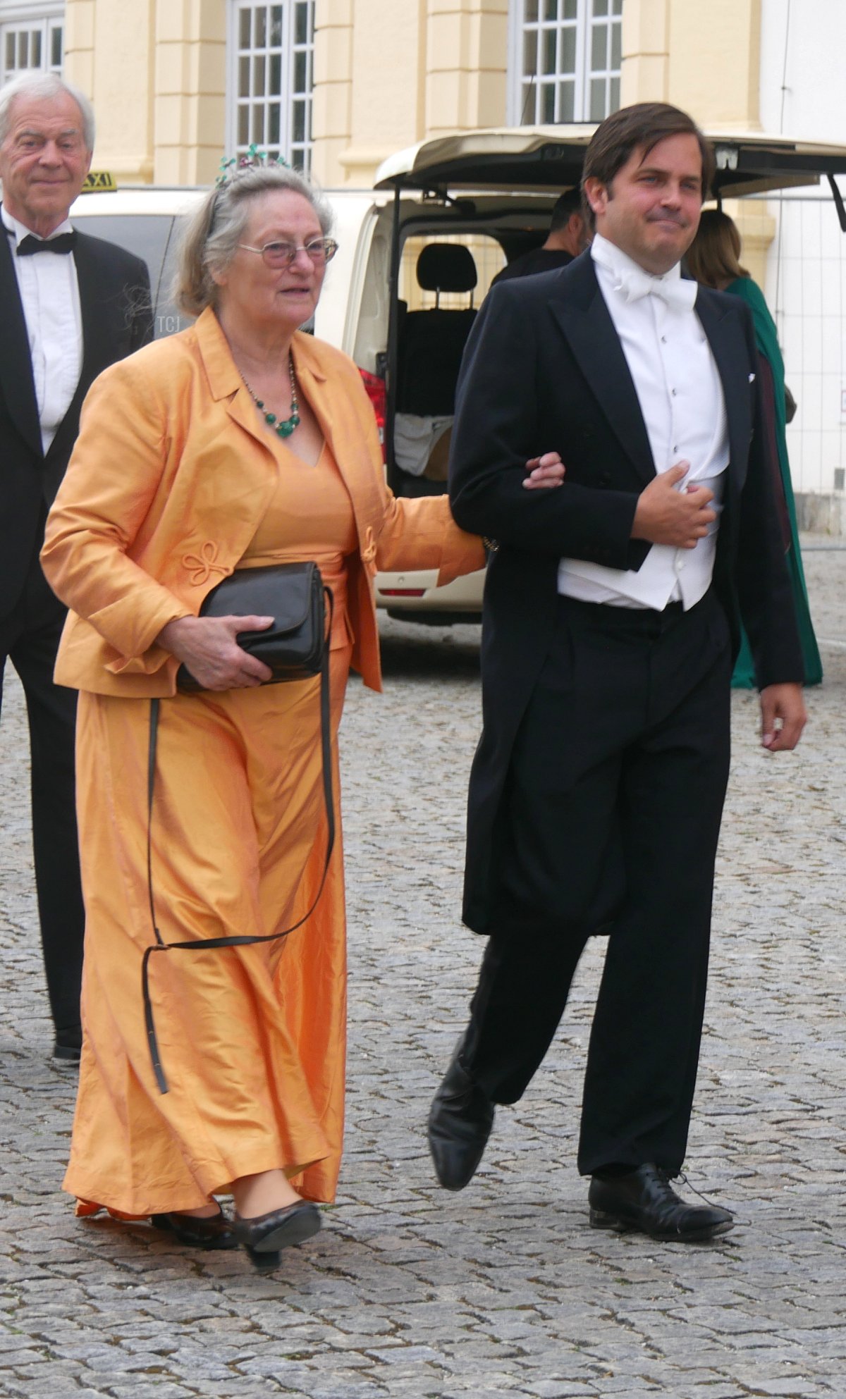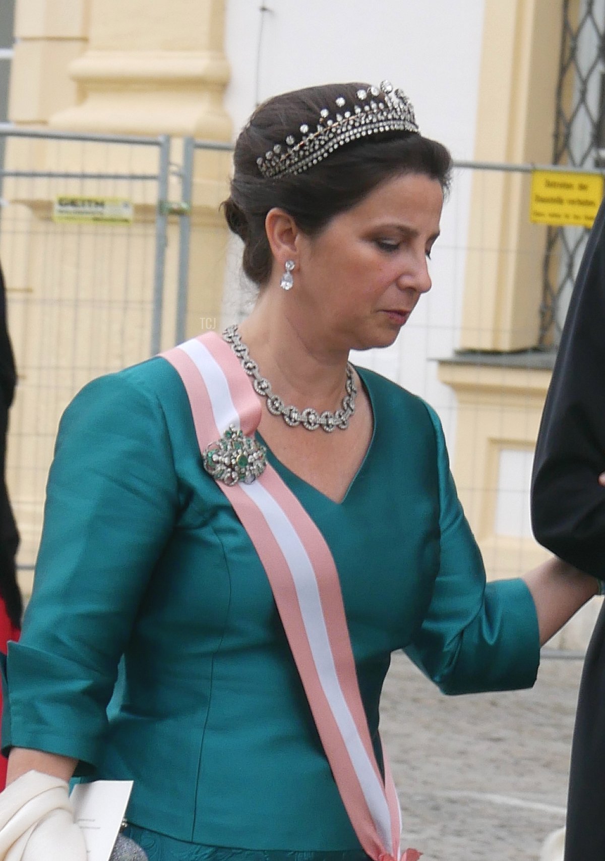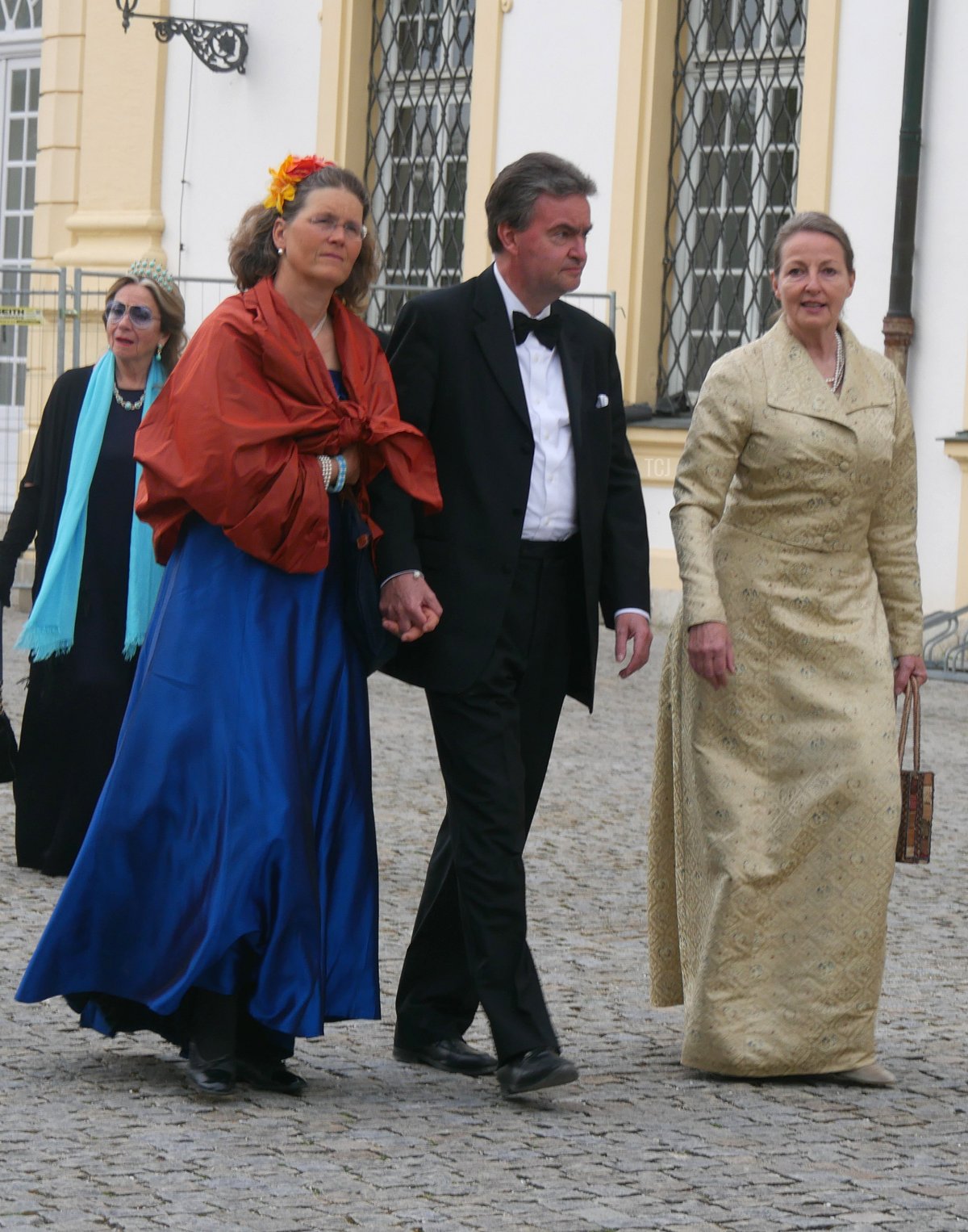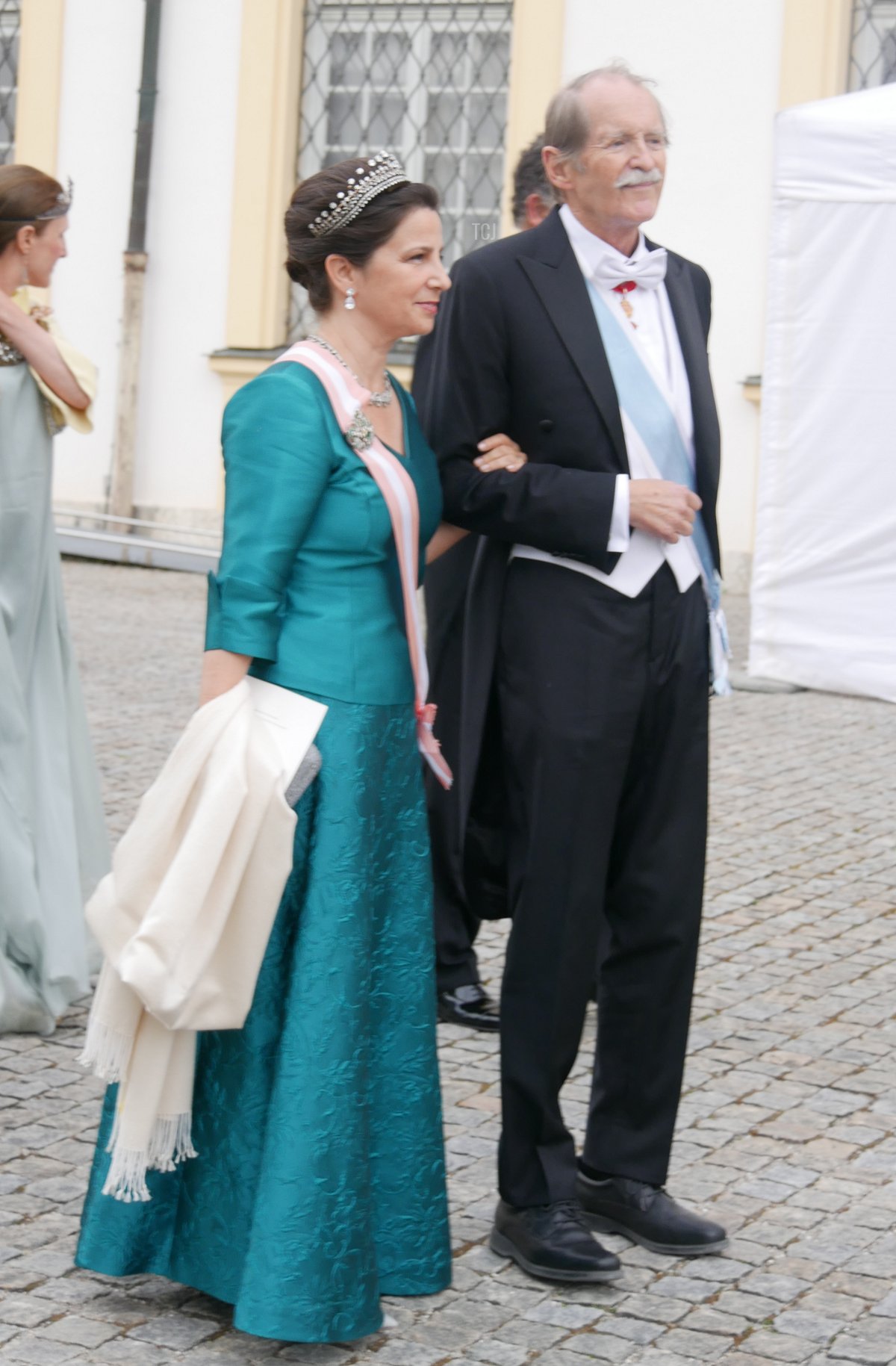 And speaking of Sisi, the Habsburgs were represented at the wedding, too. Archduke Georg attended with his wife, Archduchess Eilika (who was born Duchess Eilika of Oldenberg), and his sister, Archduchess Gabriela. (Georg and Gabriela are children of Otto, the last Crown Prince of Austria-Hungary. Both tend to use the surname “von Habsburg” rather than their archducal courtesy titles.) No tiaras on either Habsburg lady, sadly—both wore pearls, and Eilika added her large aquamarine pendant (not seen in this photograph).