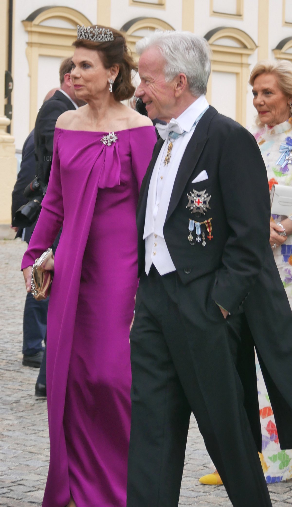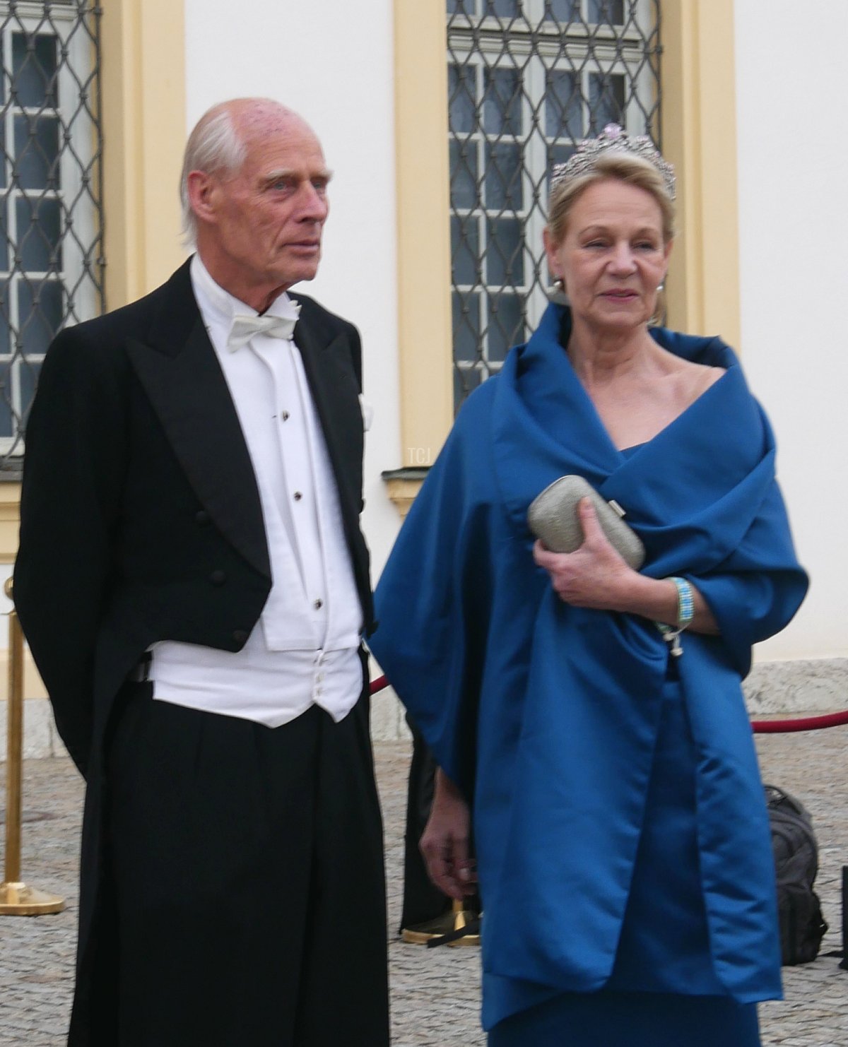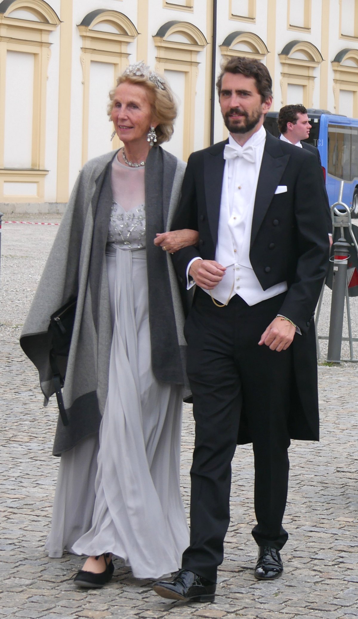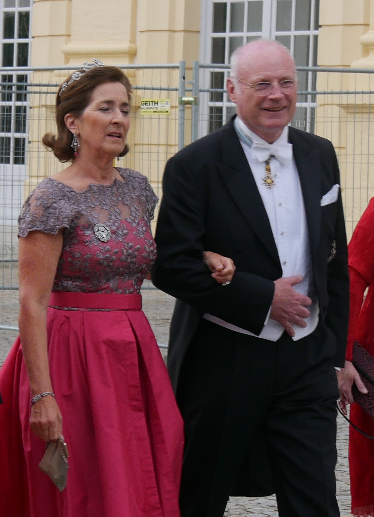 And speaking of Sisi, the Habsburgs were represented at the wedding, too. Archduke Georg attended with his wife, Archduchess Eilika (who was born Duchess Eilika of Oldenberg), and his sister, Archduchess Gabriela. (Georg and Gabriela are children of Otto, the last Crown Prince of Austria-Hungary. Both tend to use the surname “von Habsburg” rather than their archducal courtesy titles.) No tiaras on either Habsburg lady, sadly—both wore pearls, and Eilika added her large aquamarine pendant (not seen in this photograph).