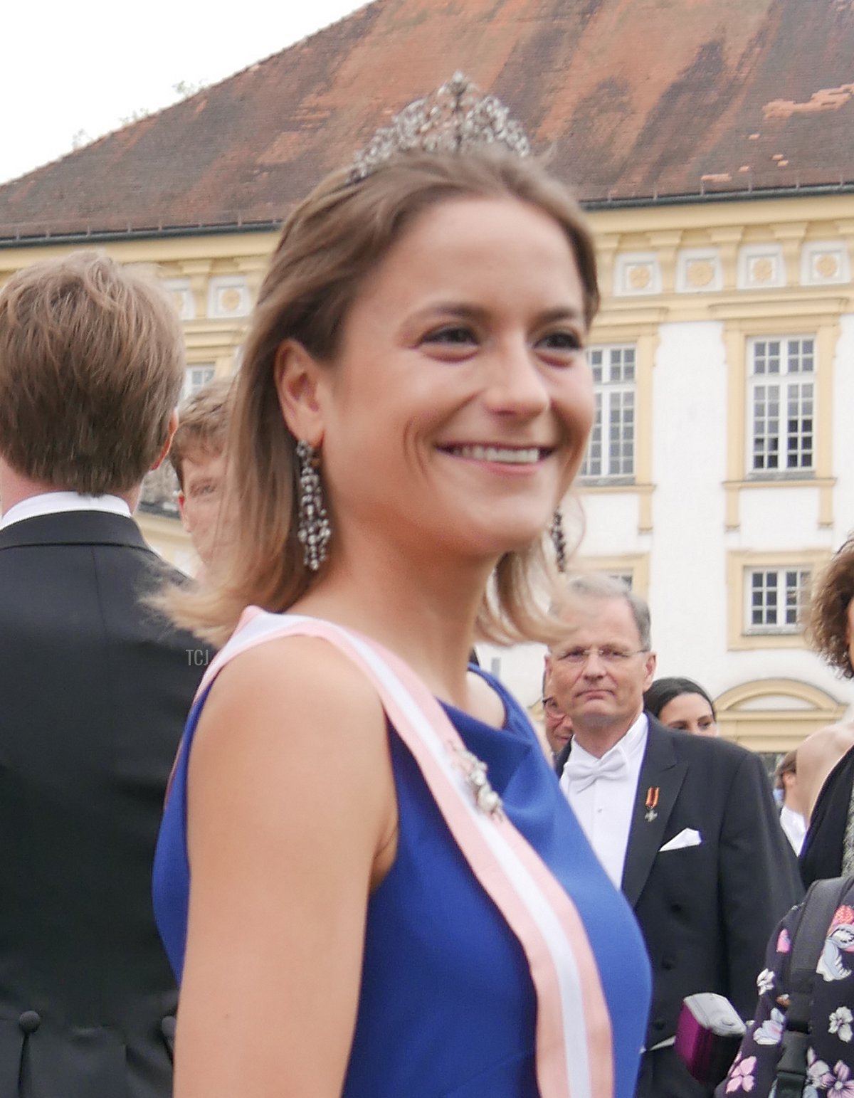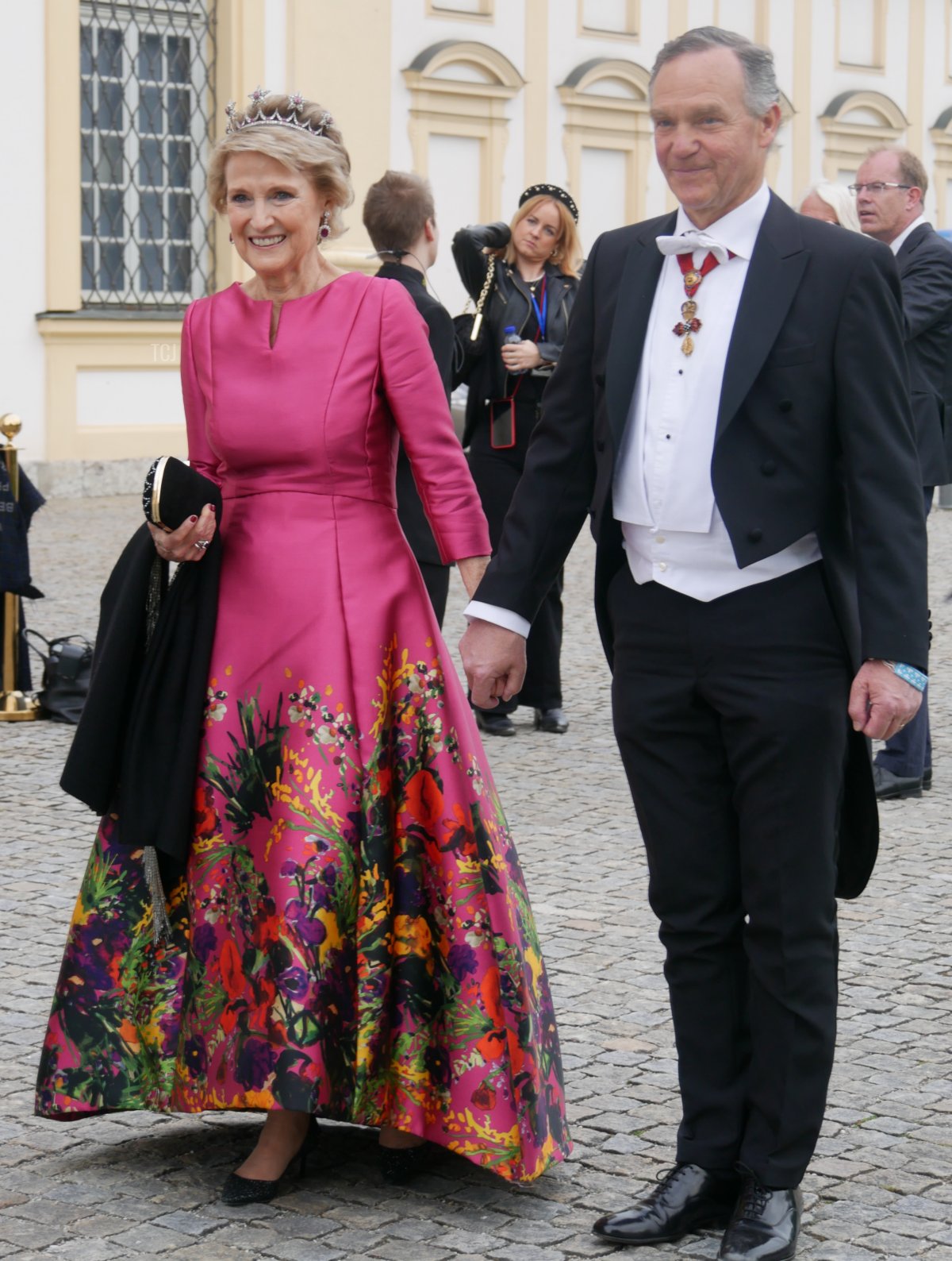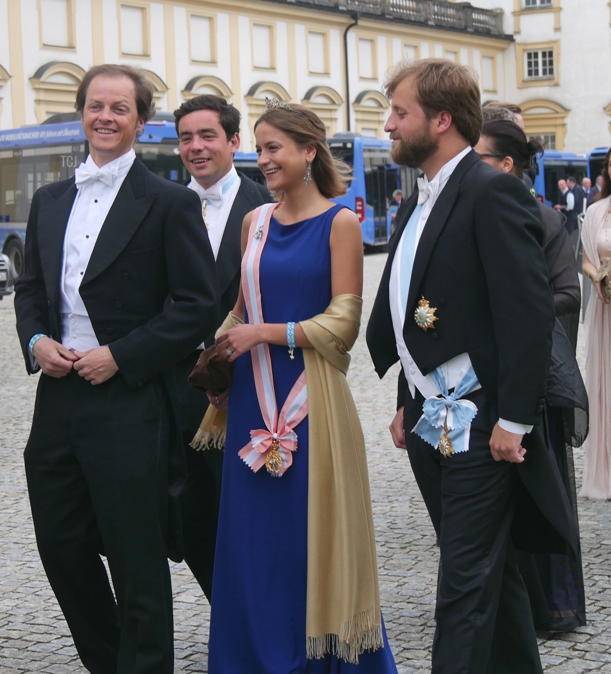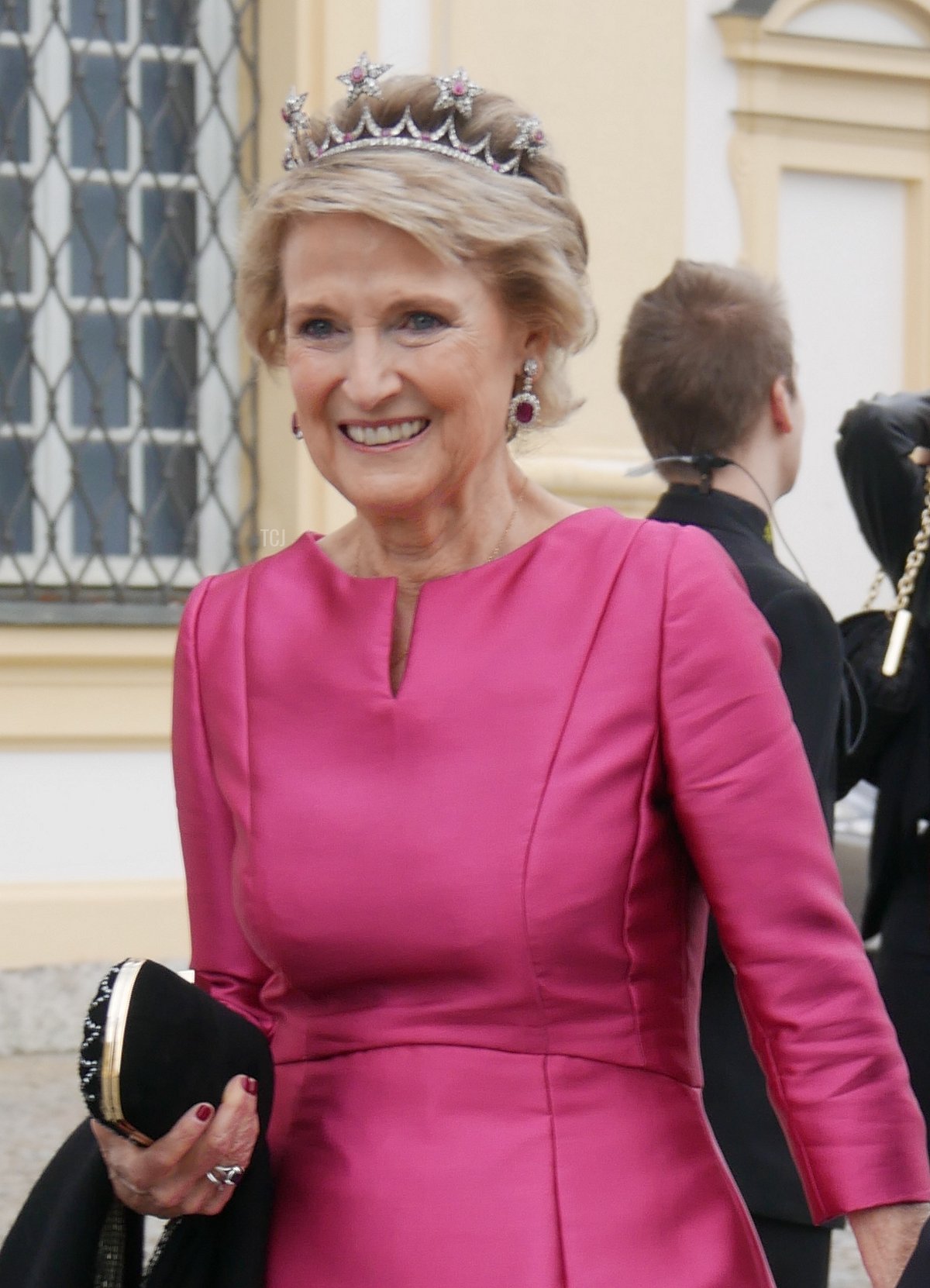 And speaking of Sisi, the Habsburgs were represented at the wedding, too. Archduke Georg attended with his wife, Archduchess Eilika (who was born Duchess Eilika of Oldenberg), and his sister, Archduchess Gabriela. (Georg and Gabriela are children of Otto, the last Crown Prince of Austria-Hungary. Both tend to use the surname “von Habsburg” rather than their archducal courtesy titles.) No tiaras on either Habsburg lady, sadly—both wore pearls, and Eilika added her large aquamarine pendant (not seen in this photograph).