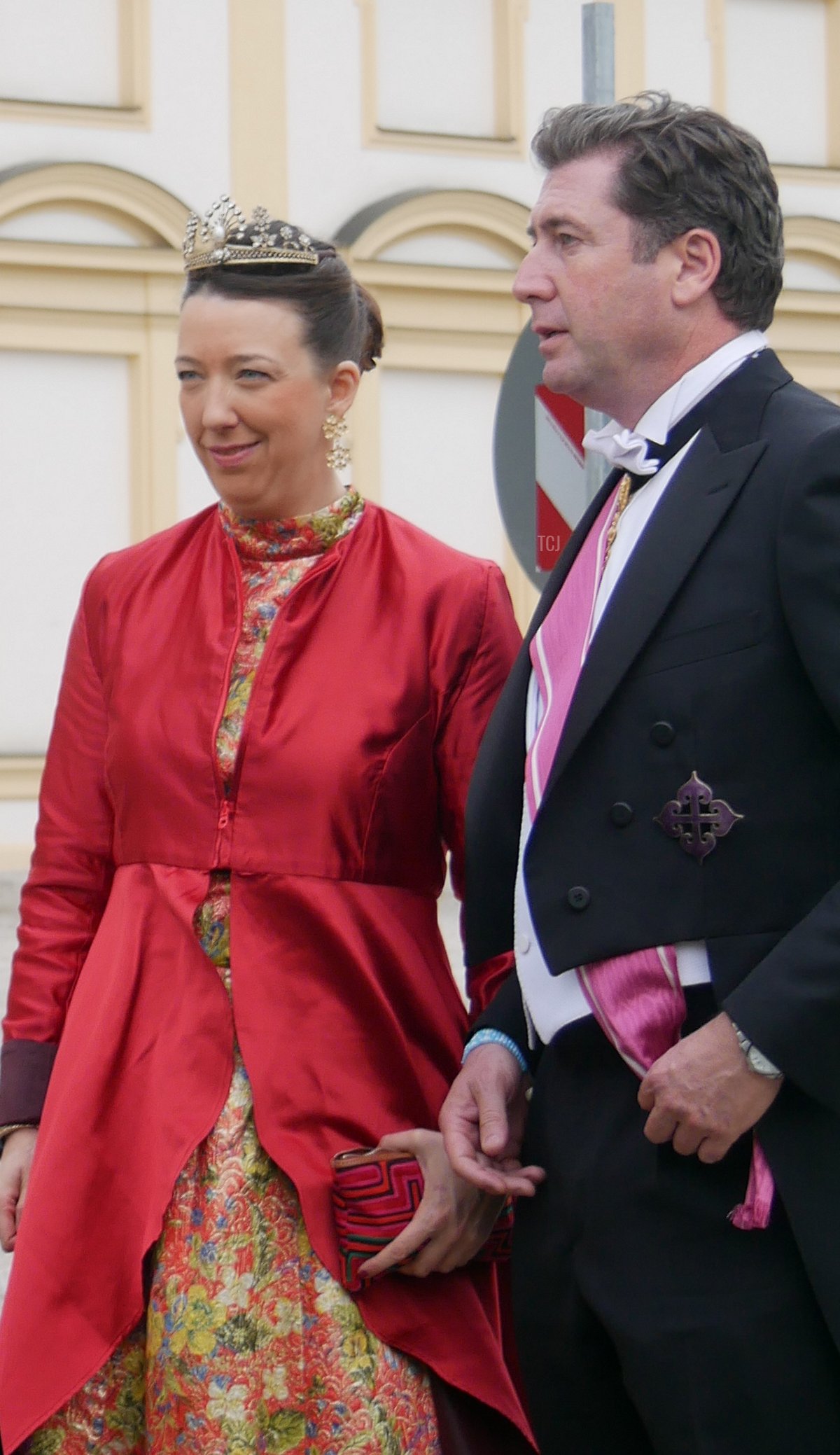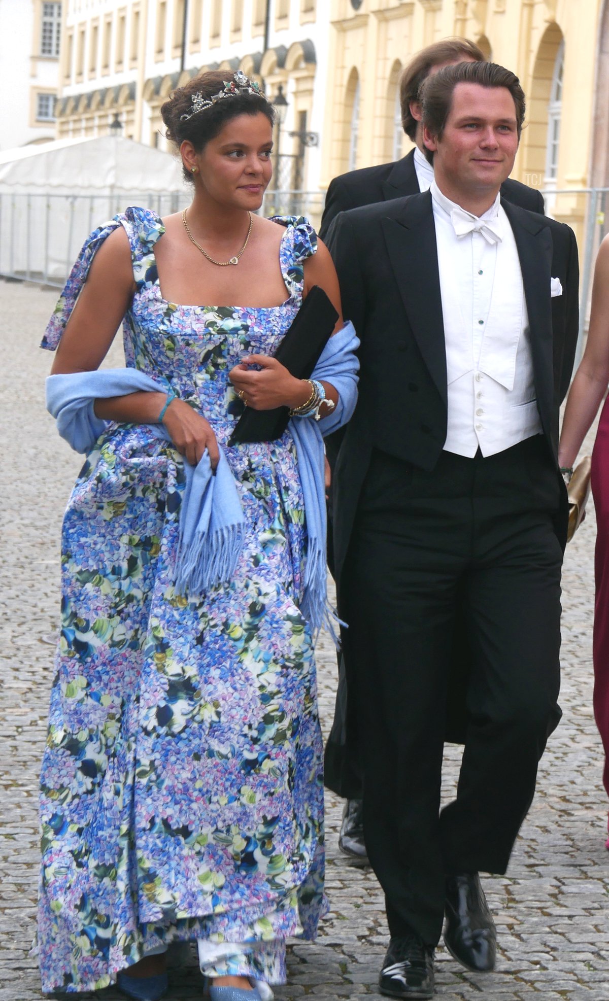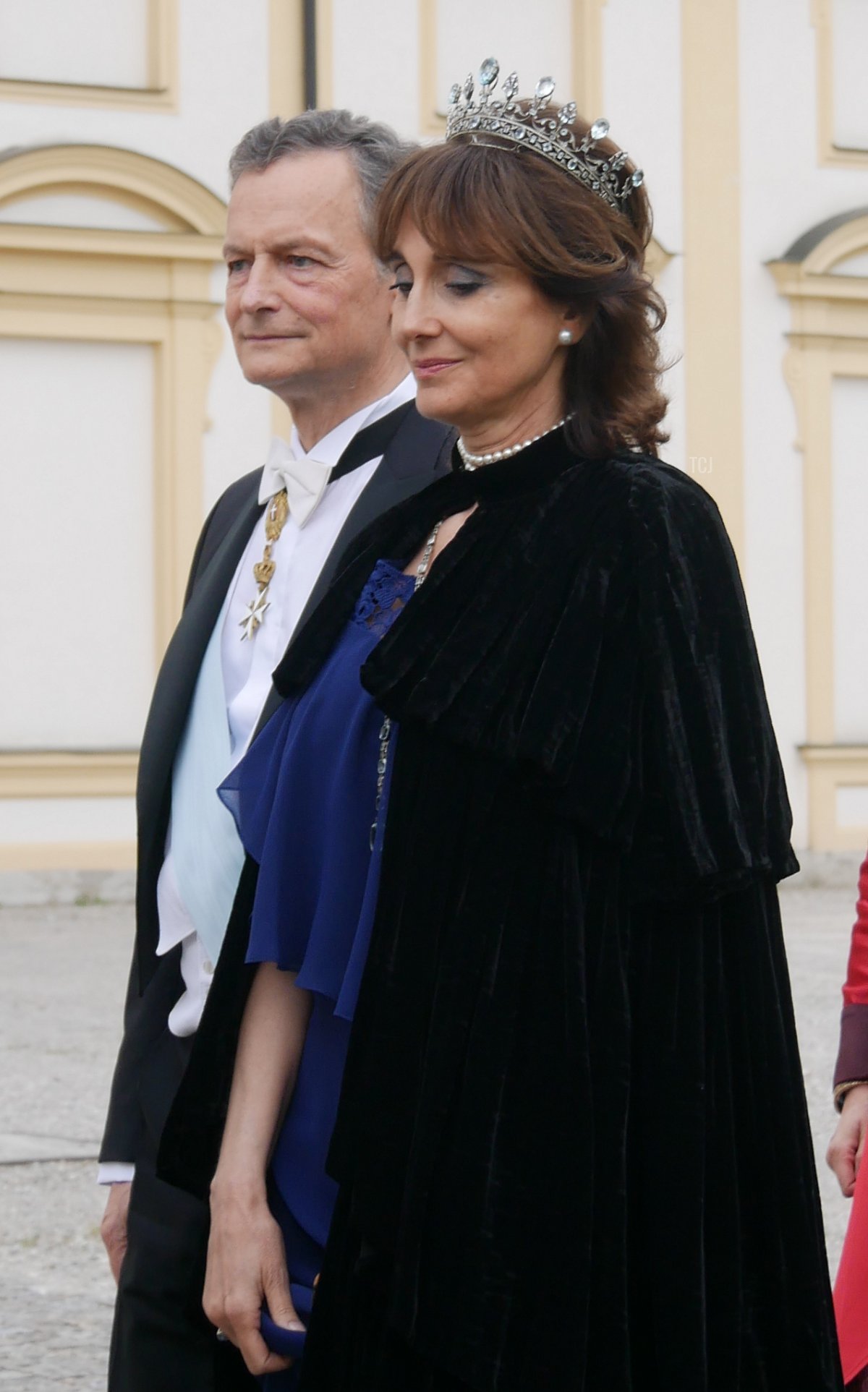 Prince Charles-Louis of Arenberg attended the wedding gala with his wife, Princess Fiammetta. (Charles-Louis is a son of Princess Sophie Marie of Bavaria, the youngest daughter of Crown Prince Rupprecht of Bavaria and Princess Antonia of Luxembourg, who married the 12th Duke of Arenberg.) Fiammetta wore a gorgeous tiara that is set with (I believe) diamonds and aquamarines, plus pearls and a sautoir-length diamond necklace.
