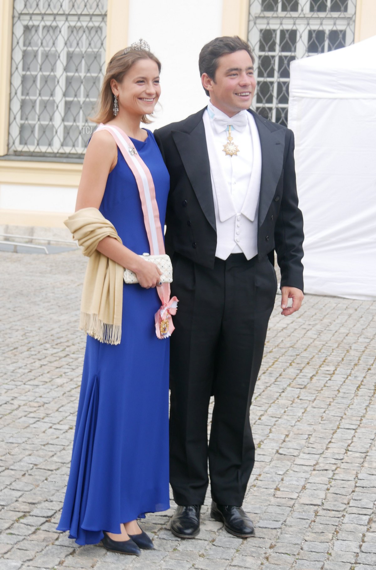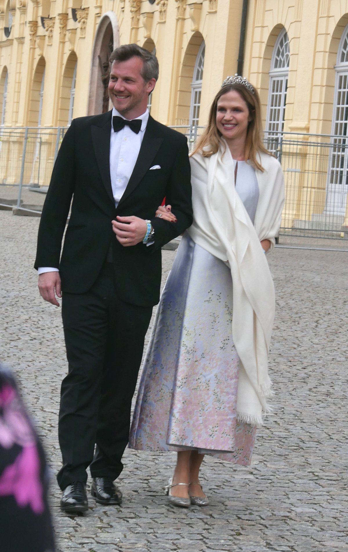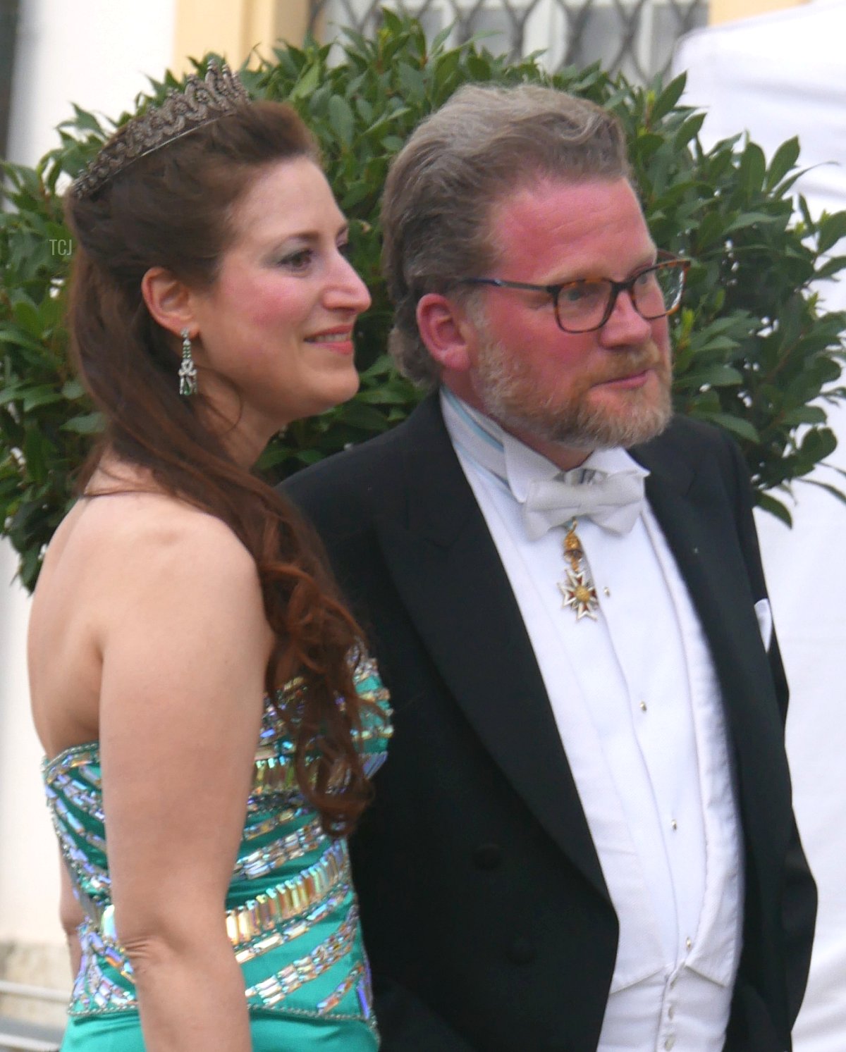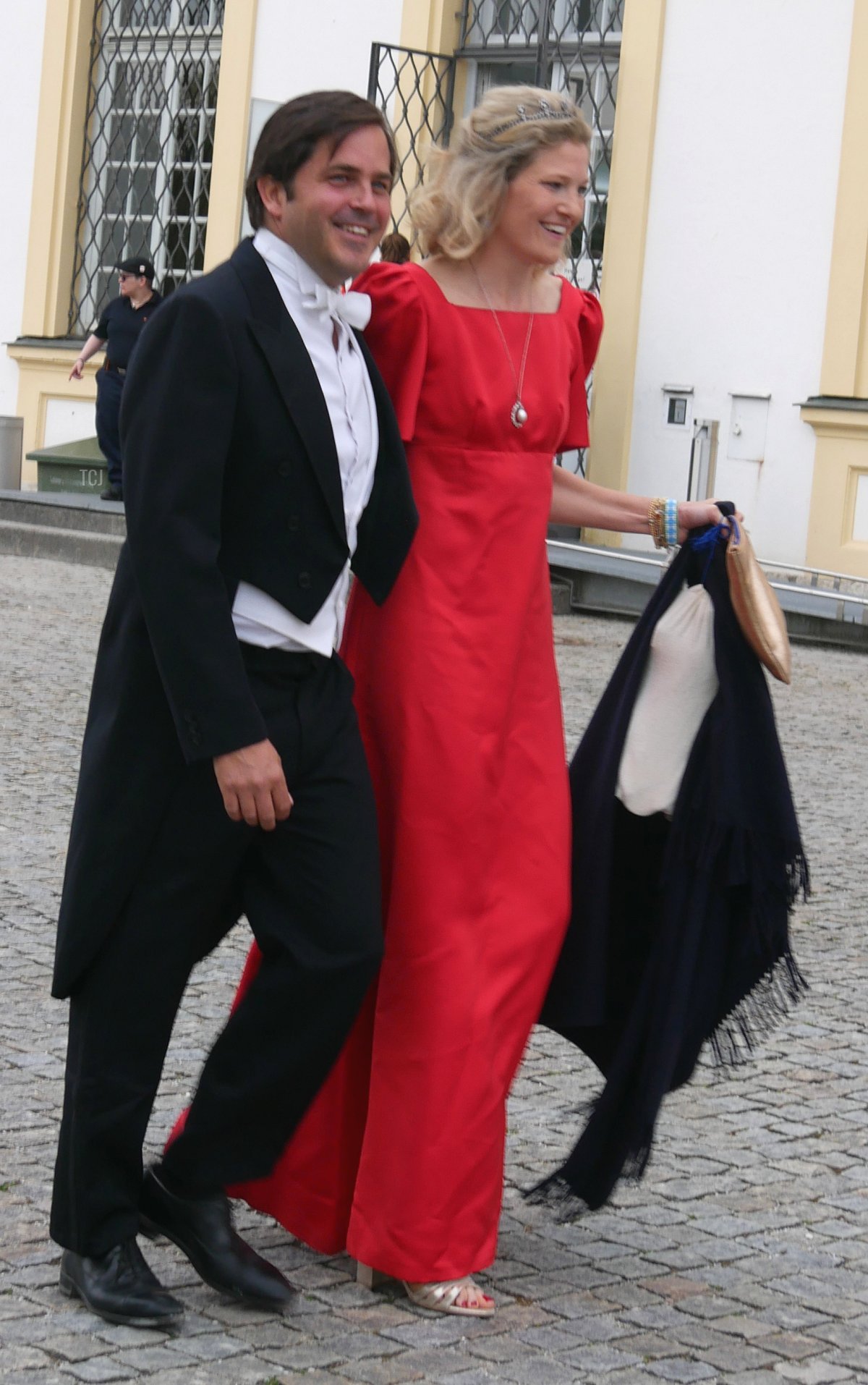 Prince Charles-Louis of Arenberg attended the wedding gala with his wife, Princess Fiammetta. (Charles-Louis is a son of Princess Sophie Marie of Bavaria, the youngest daughter of Crown Prince Rupprecht of Bavaria and Princess Antonia of Luxembourg, who married the 12th Duke of Arenberg.) Fiammetta wore a gorgeous tiara that is set with (I believe) diamonds and aquamarines, plus pearls and a sautoir-length diamond necklace.