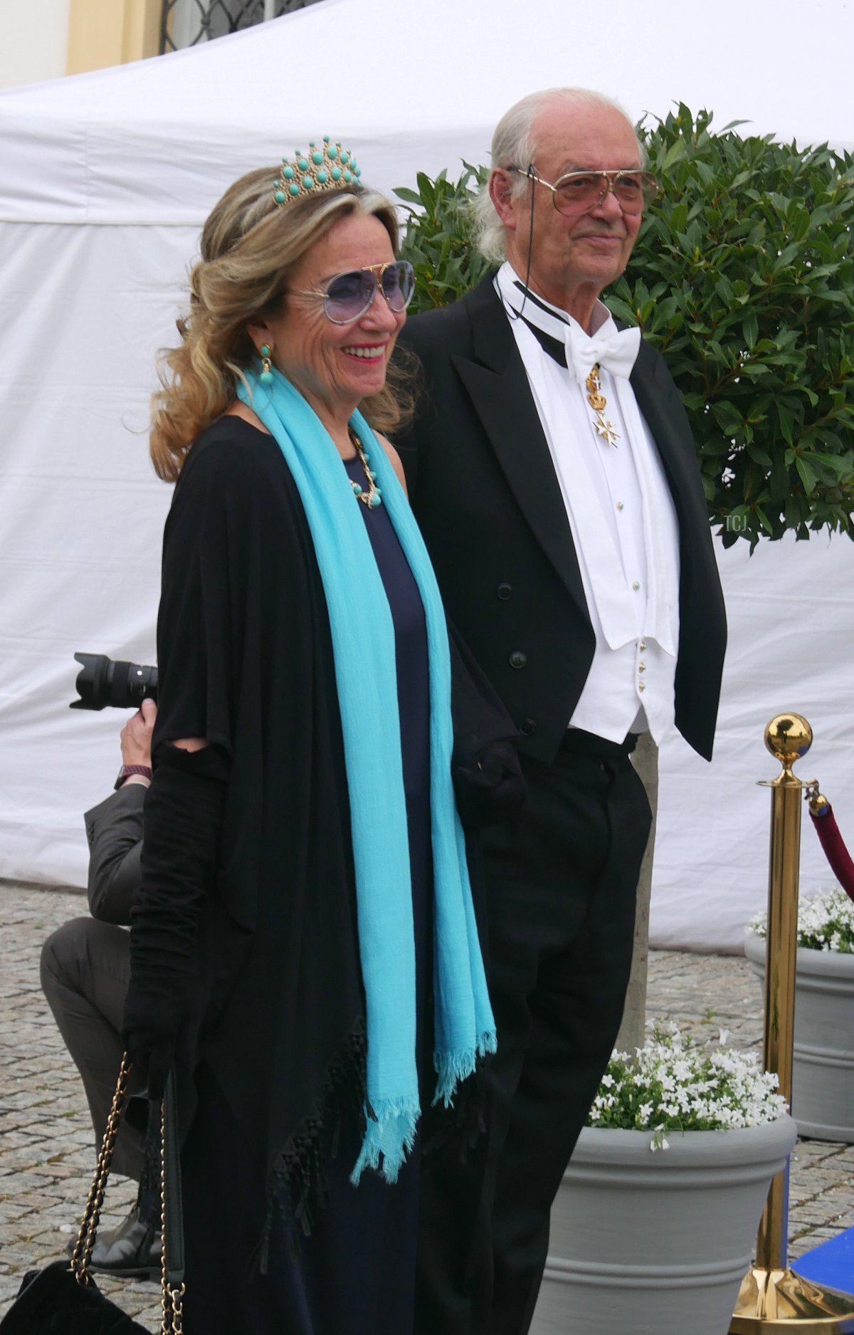 The Fugger von Babenhausen princely family also hails from Bavaria. Hubertus, the 8th Prince Fugger von Babenhausen attended the wedding gala with his wife, Princess Alexandra, who is the sister of Prince Albrecht of Oettingen-Spielberg. She wore an eye-catching parure that appears to be set with turquoises for the reception.