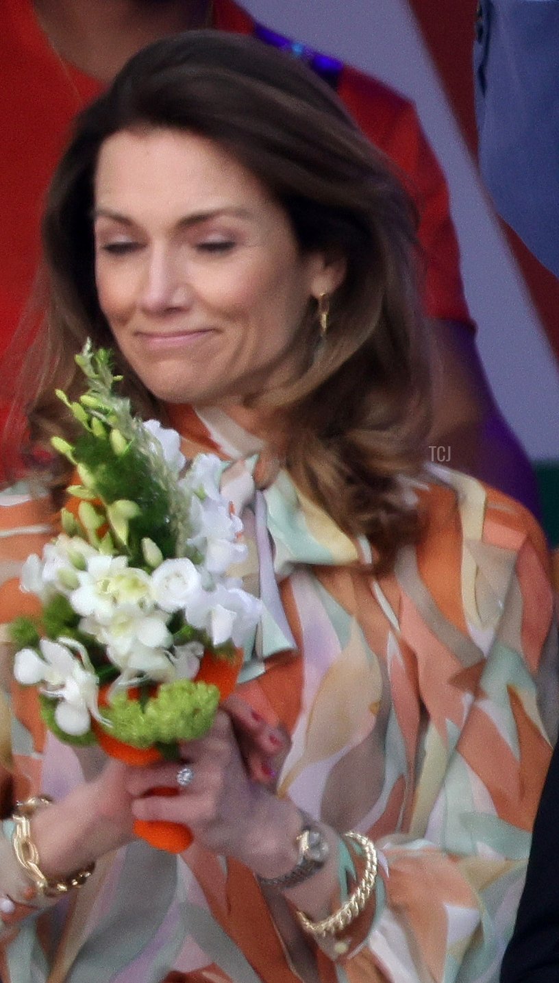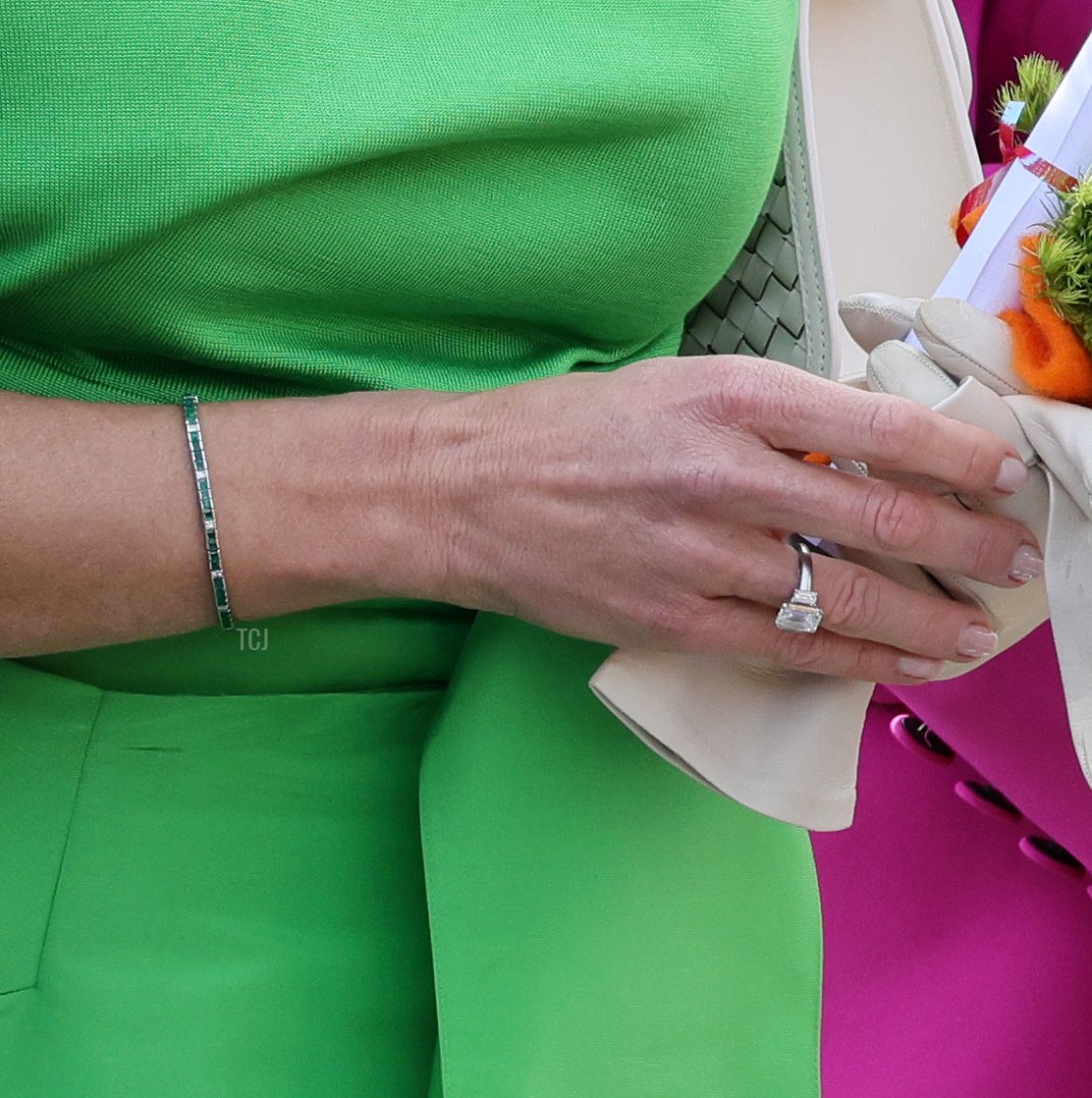 She added her emerald and diamond tennis bracelet on her right wrist, plus her emerald-cut diamond ring on her right hand. That ring was a gift from King Willem-Alexander in 2007 to celebrate the birth of Princess Ariane. (You can read more about the four major rings that the King has given to his wife in this article.)
