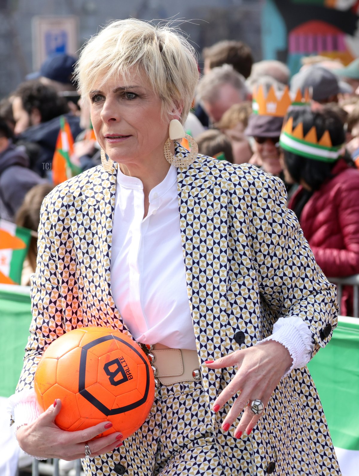 Princess Laurentien’s bright printed trouser suit stood out all on its own, but she upped the interest with a pair of big, textural earrings, plus a cocktail ring that coordinated nicely with that football.