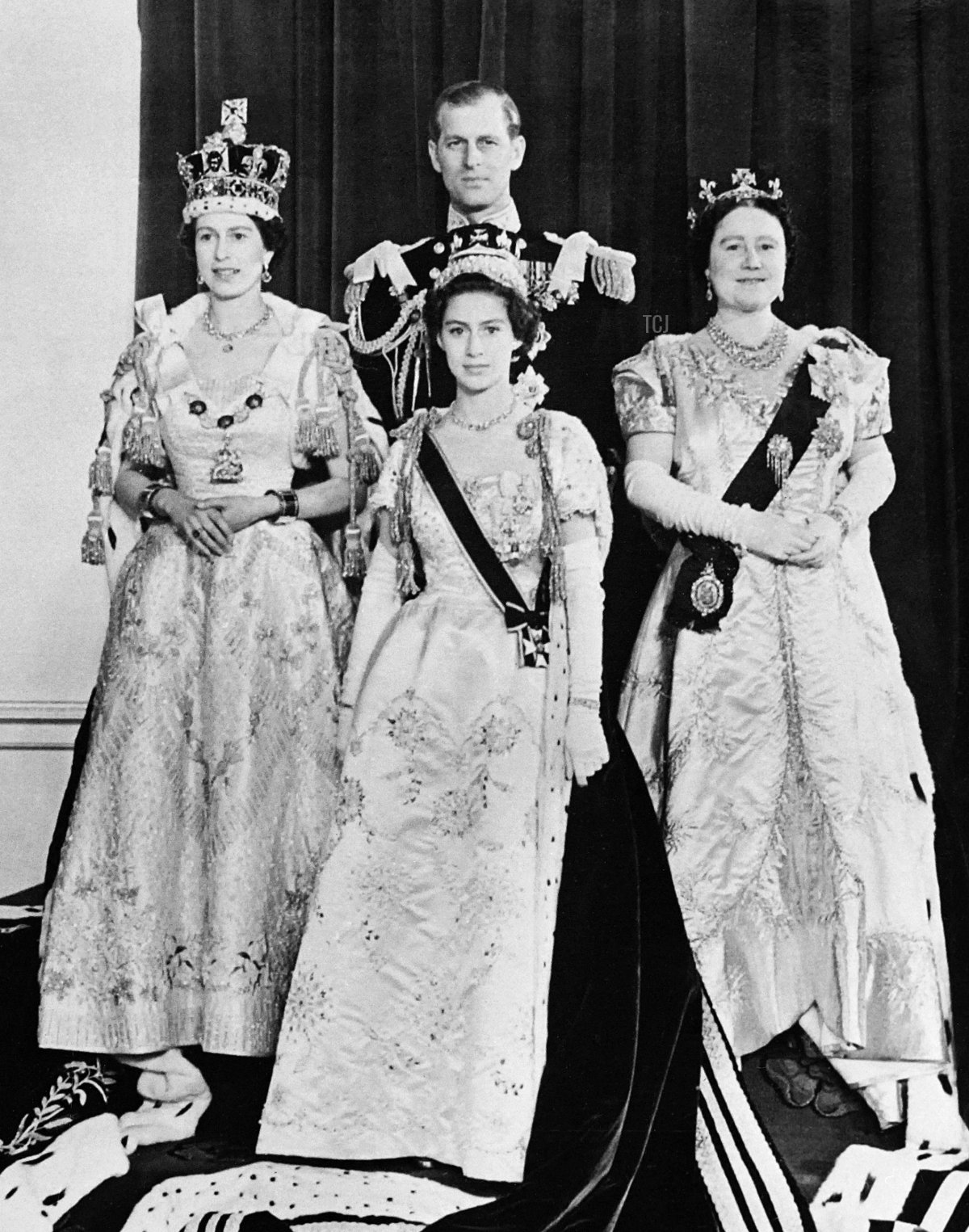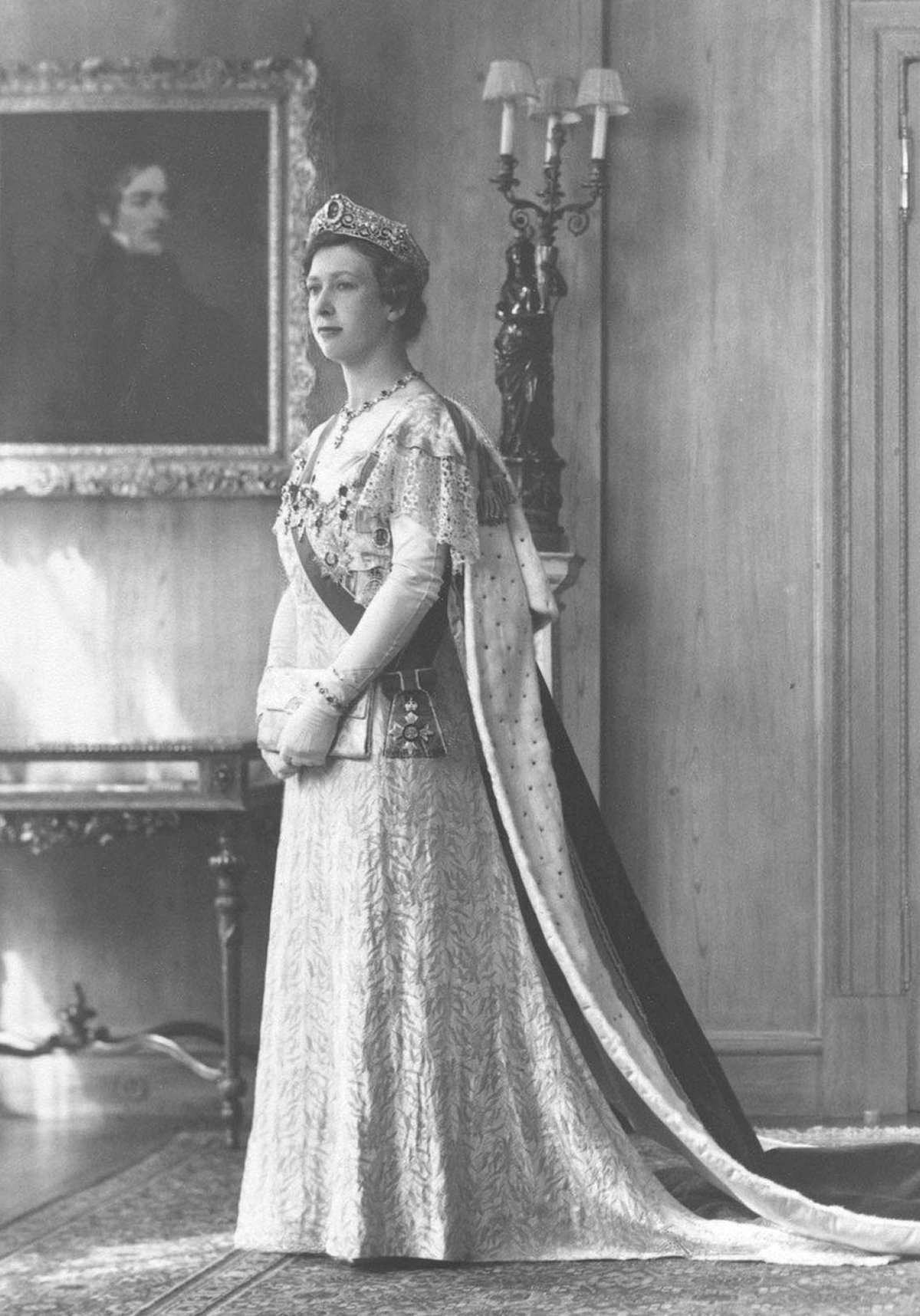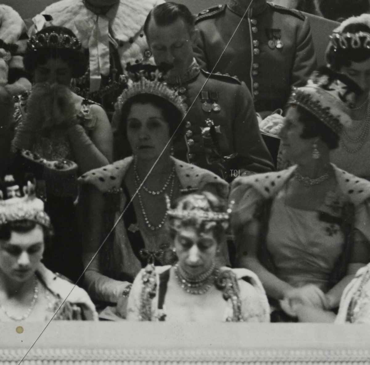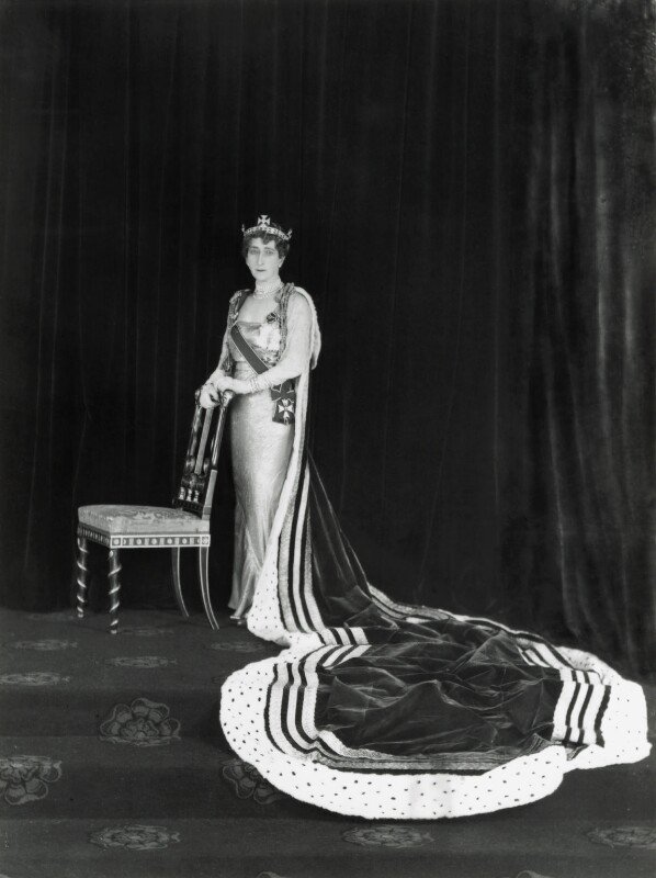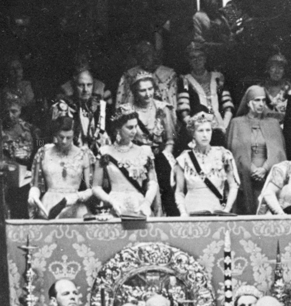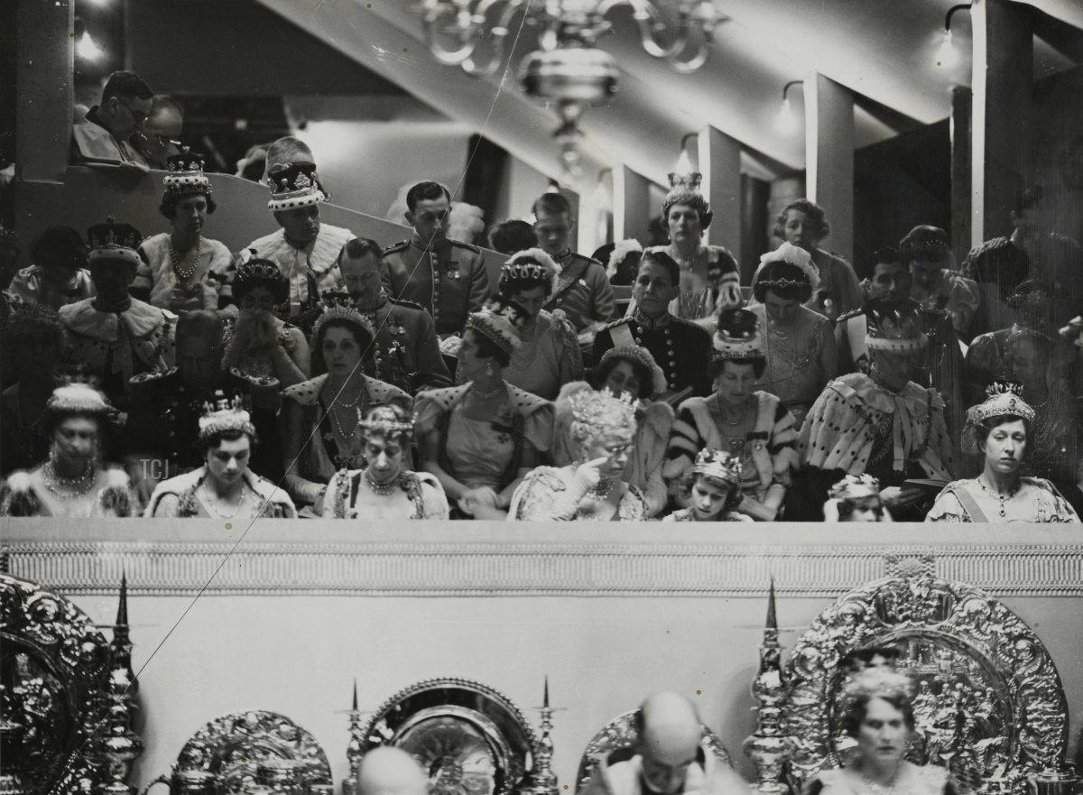 Beside her, from left to right, were the Duchess of Kent, the Duchess of Gloucester, Queen Maud of Norway and Queen Mary of the United Kingdom (both of whom broke tradition and attended the coronation, though they were also crowned queens), Princesses Elizabeth and Margaret, and Princess Mary, Princess Royal and Countess of Harewood.