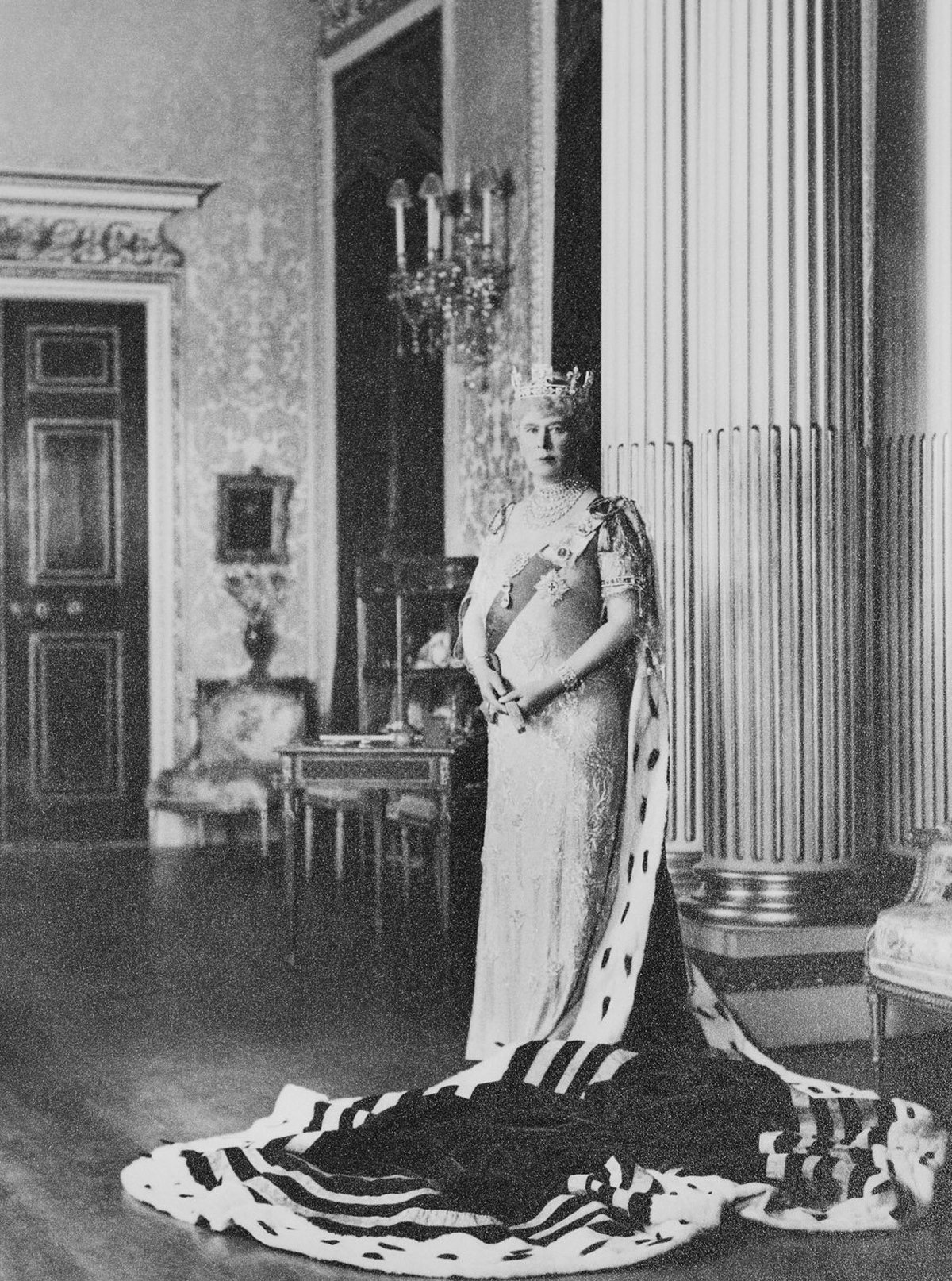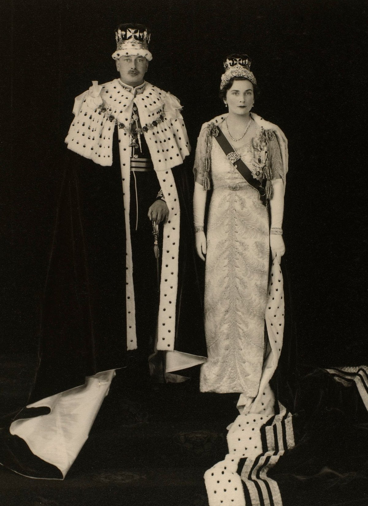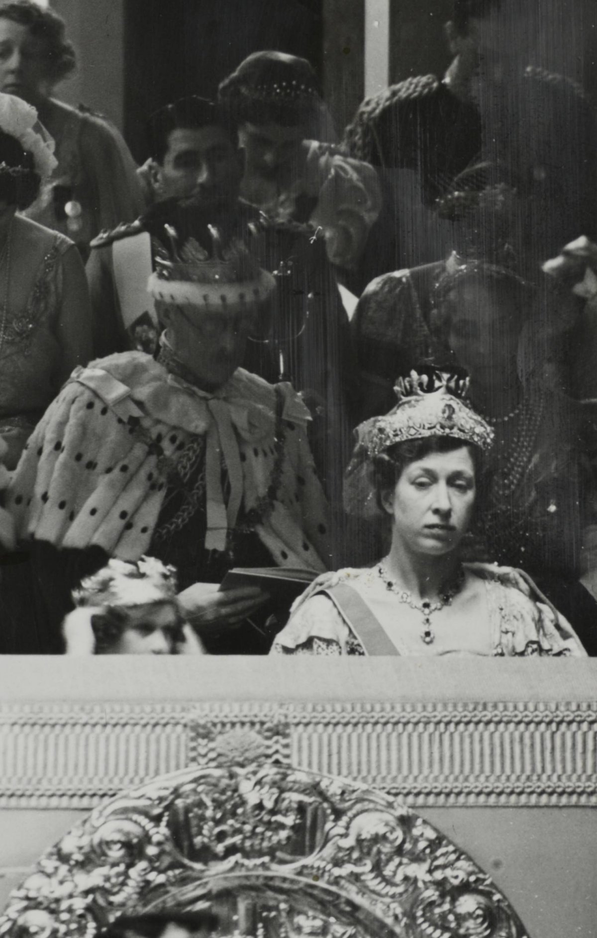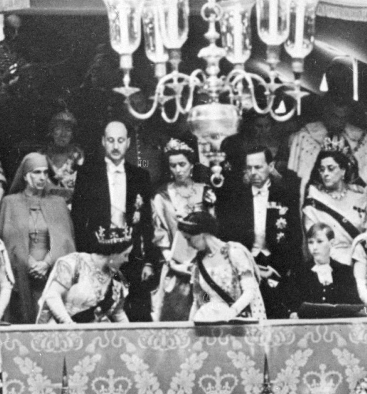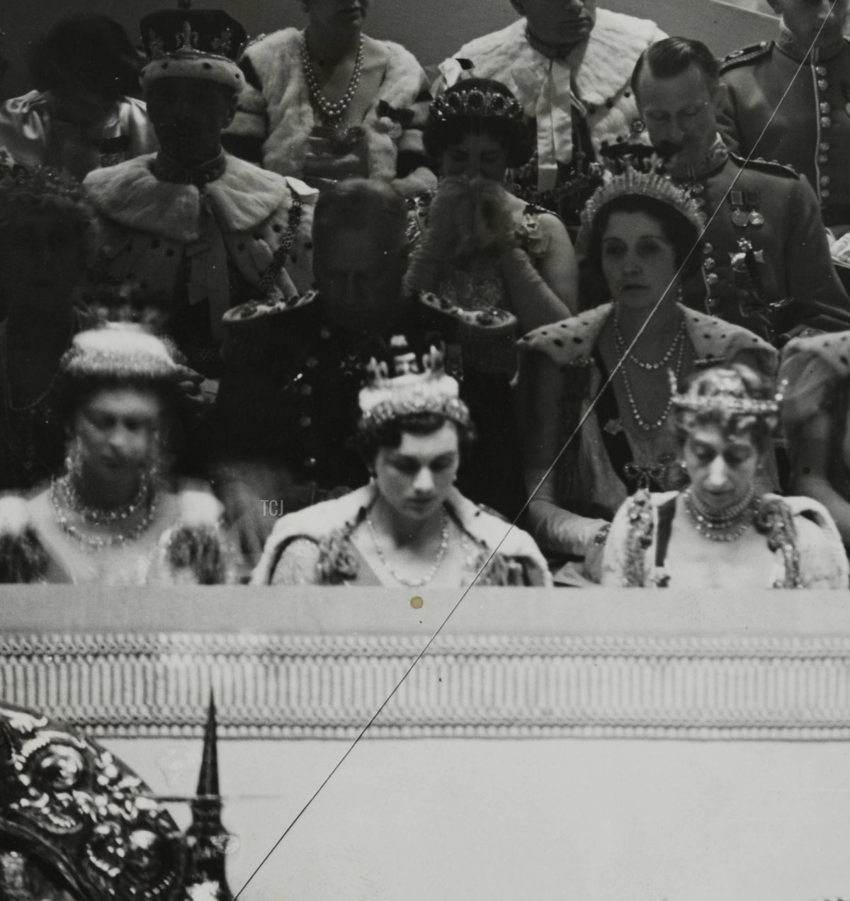 Beside her, from left to right, were the Duchess of Kent, the Duchess of Gloucester, Queen Maud of Norway and Queen Mary of the United Kingdom (both of whom broke tradition and attended the coronation, though they were also crowned queens), Princesses Elizabeth and Margaret, and Princess Mary, Princess Royal and Countess of Harewood.