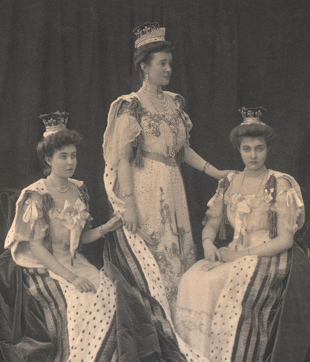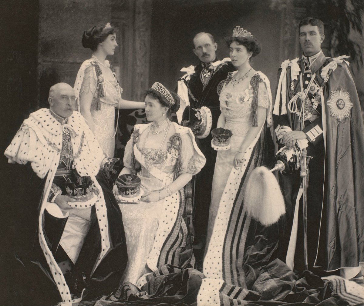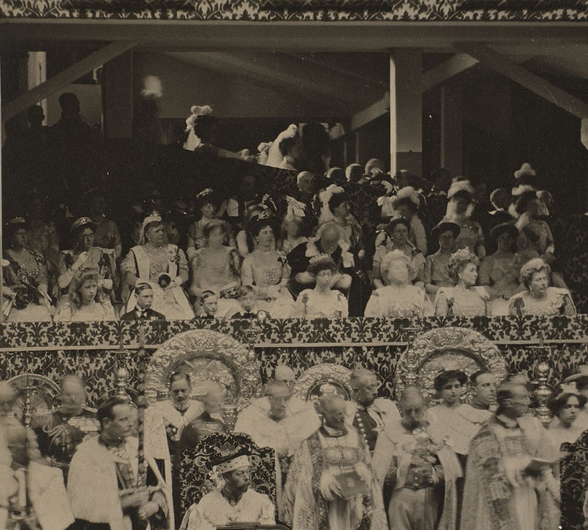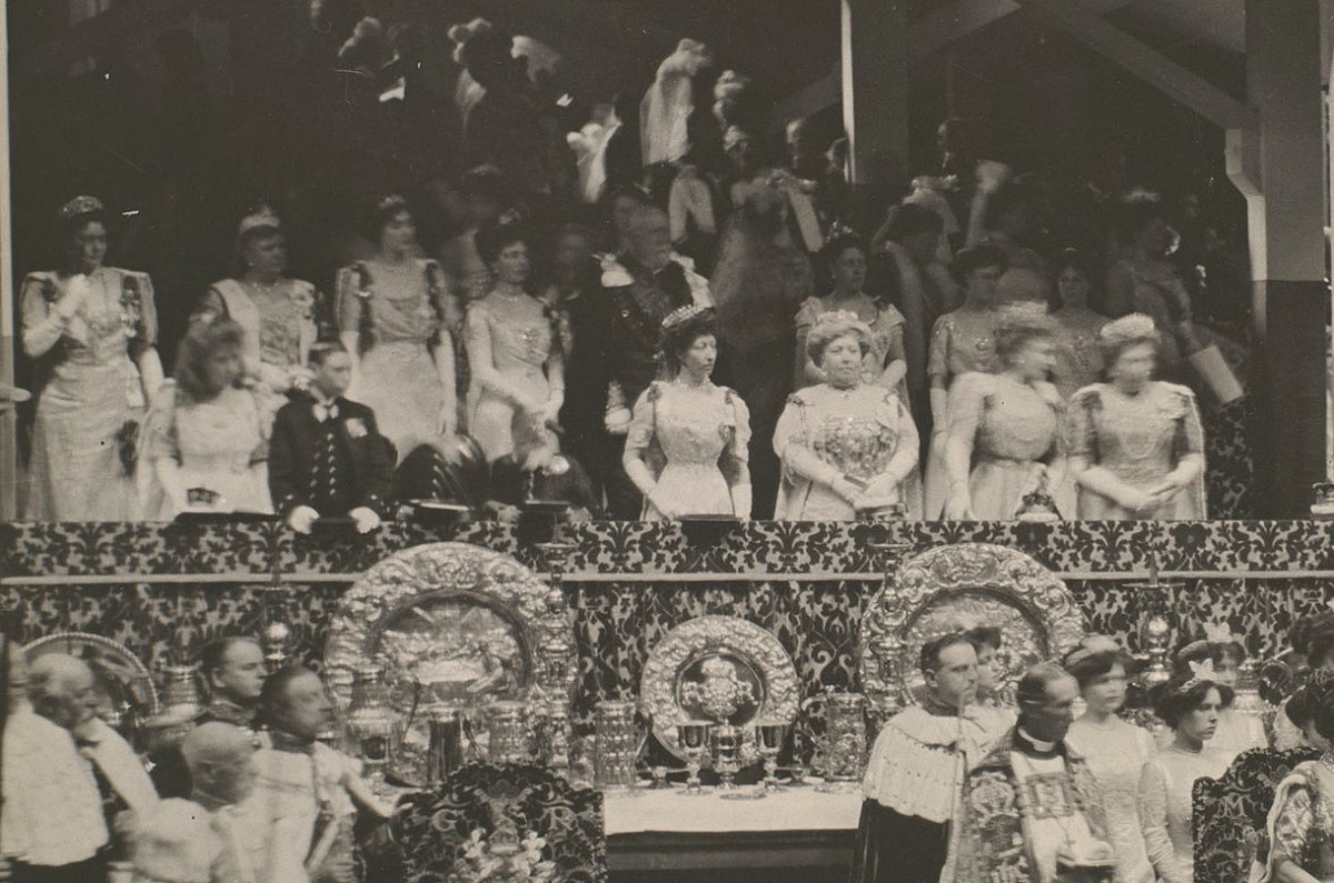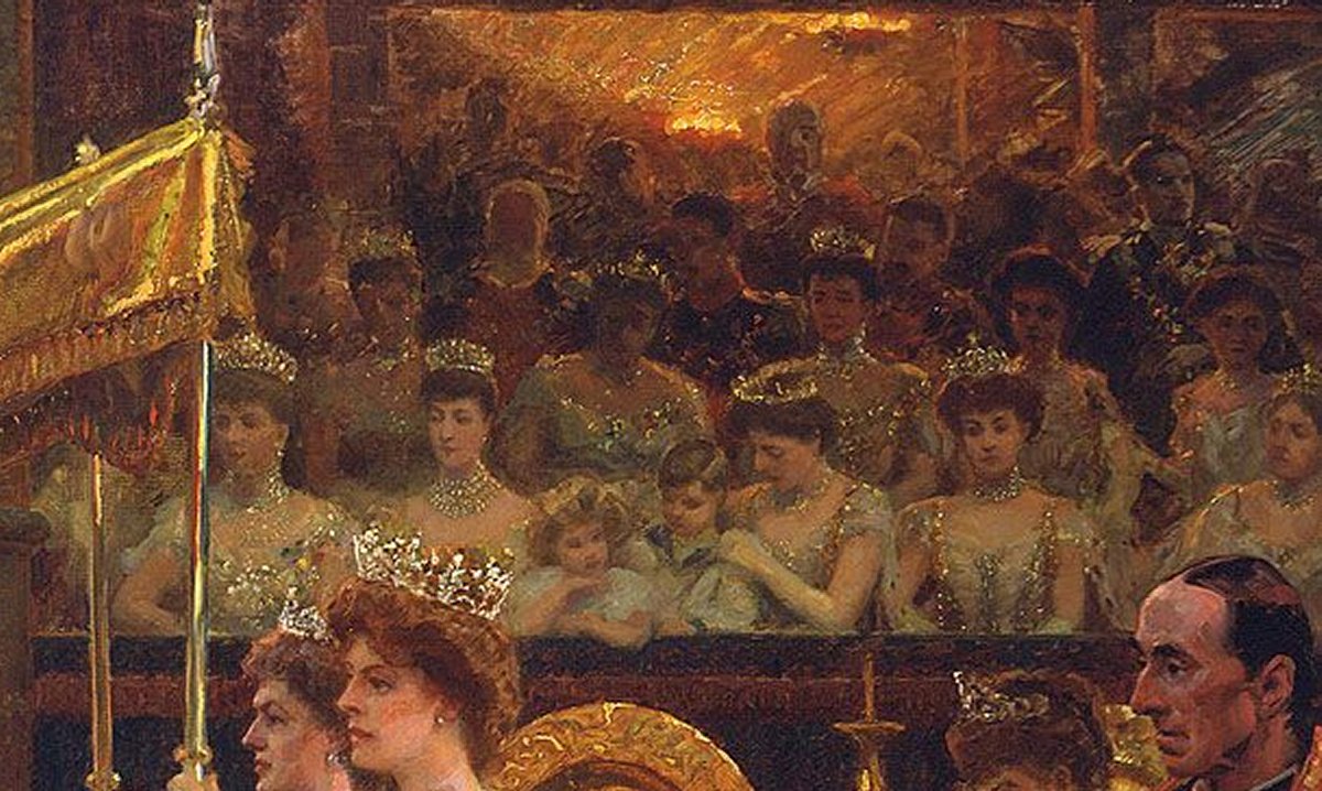 The Danish artist Laurits Regner Tuxen, a favorite of Queen Alexandra and her sister, Empress Marie Feodorovna of Russia, was commissioned to paint this scene from coronation day. Thanks to him, we get a glimpse of the women glittering in the royal box. A few faces are immediately familiar, even in painted form. In the front row, you’ll spot (from left to right) Mary of Teck, who was then Princess of Wales; Princess Louise, Duchess of Fife; Lady Alexandra Duff; Prince Edward of Wales (later King Edward VIII, then the Duke of Windsor); Princess Charles of Denmark (later Queen Maud of Norway); Princess Victoria; and Princess Louise, Duchess of Argyll.