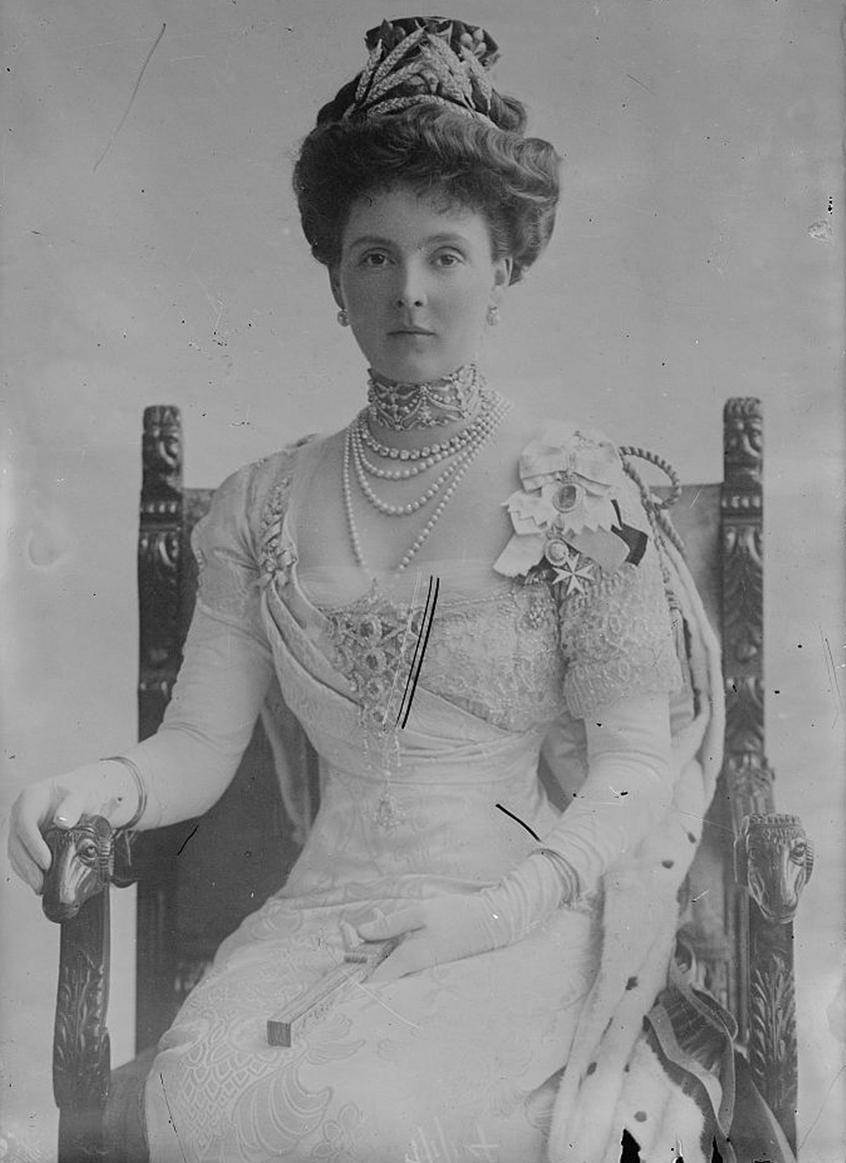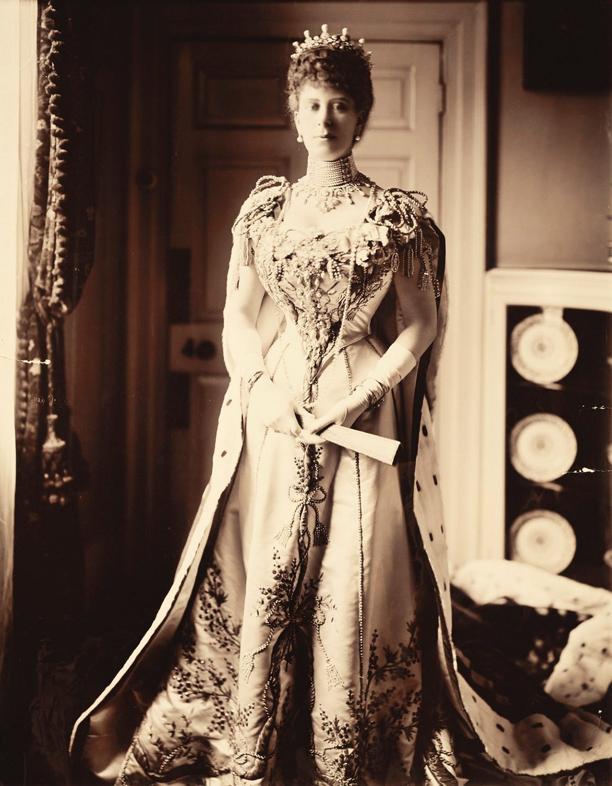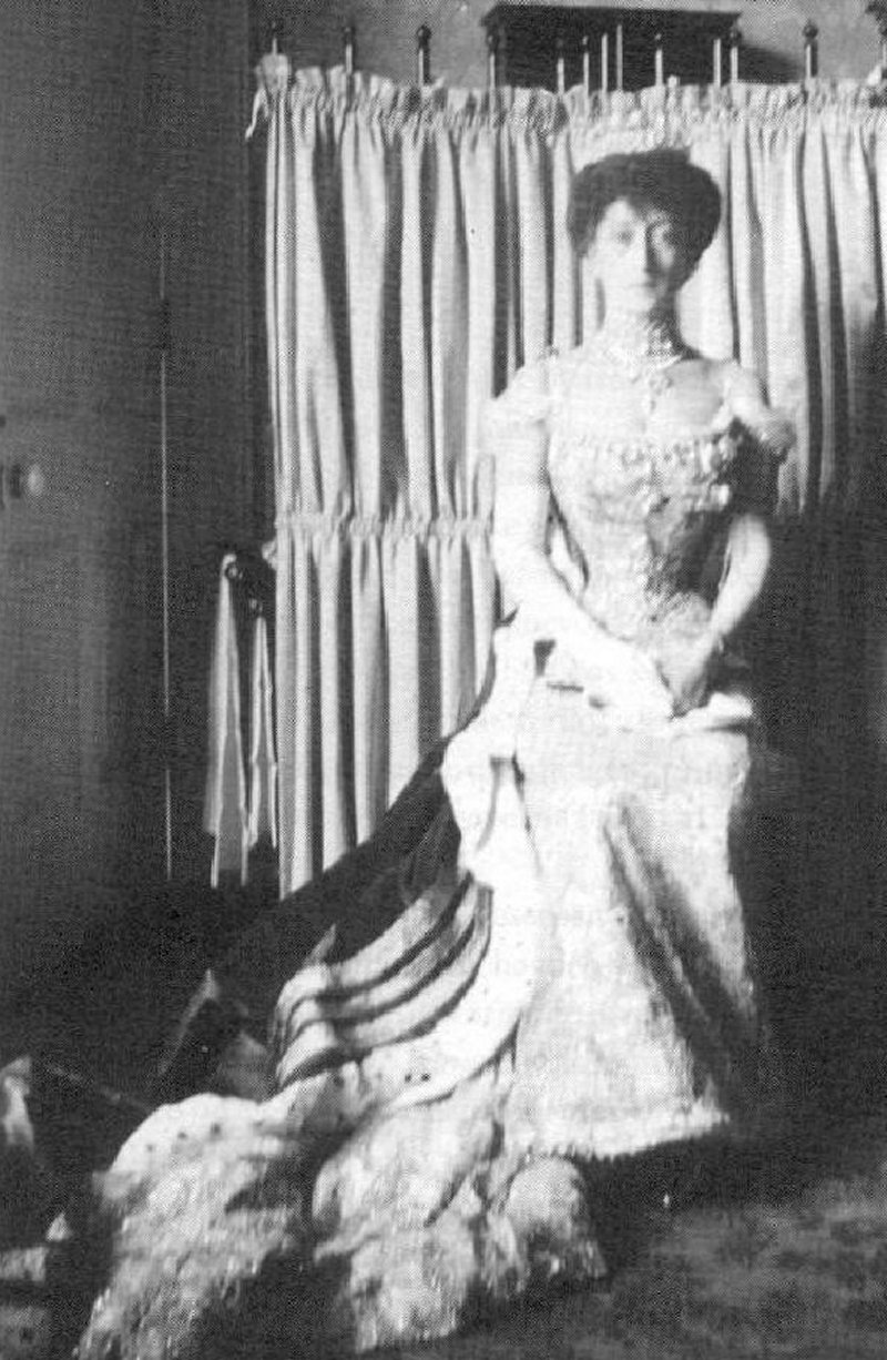 This fuzzy photograph shows Queen Maud (then still Princess Charles of Denmark) in her gown, tiara, and robes for her parents’ coronation. Her jewels for the ceremony included her large diamond tiara, a wedding gift from a group of her friends. That tiara went with Maud to Oslo three years later when her husband was elected King of Norway. It was most recently worn by the late Princess Ragnhild, and it’s said to be back in the Norwegian royal vaults today.