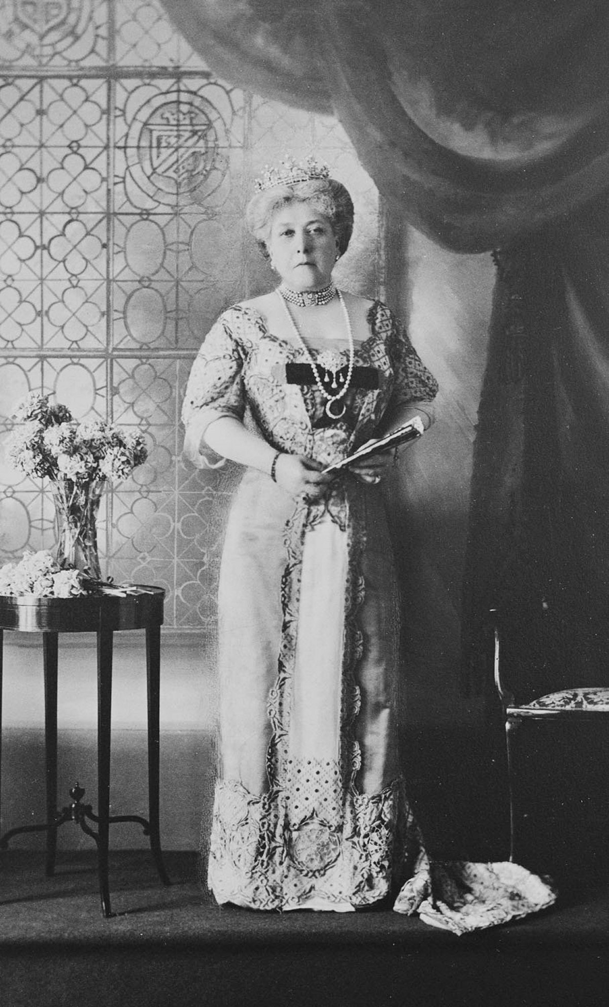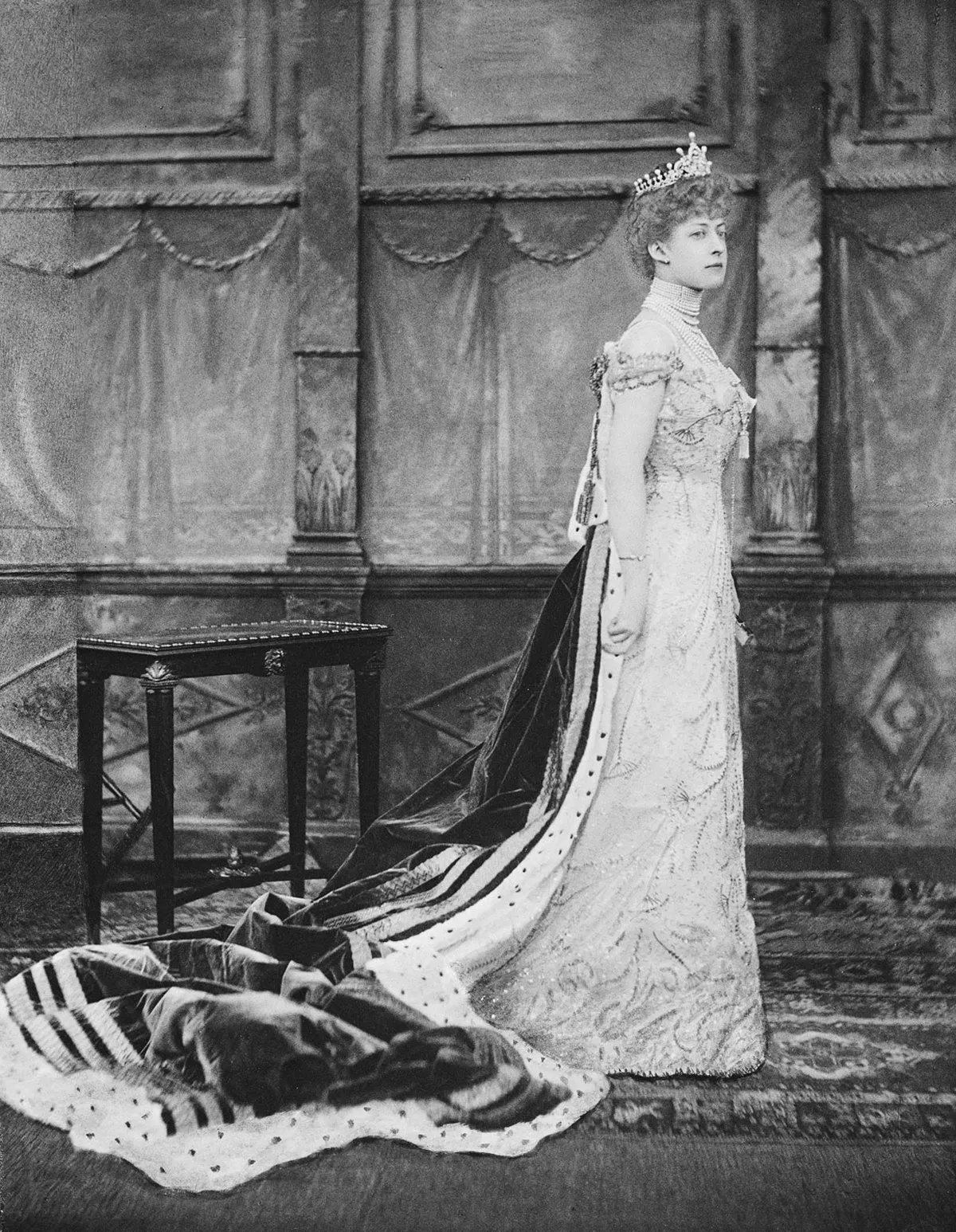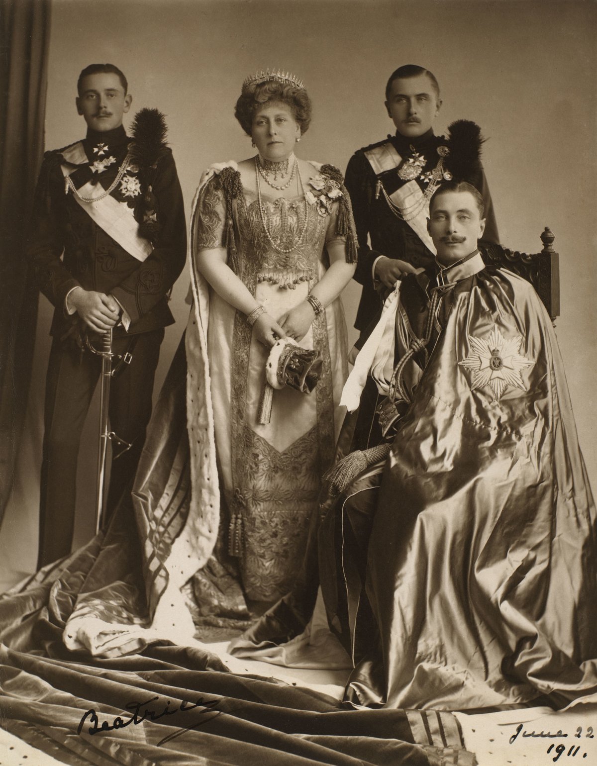 This official portrait photograph showcases the coronation attire Princess Beatrice, Queen Victoria’s youngest daughter, and her three sons, Princes Maurice, Leopold, and Alexander of Battenberg. (Her daughter, Ena, could not attend, because she was married to the King of Spain, and heads of state traditionally didn’t attend coronations in those days.) With her dress of white satin and chiffon, decorated with gold embroidery, Beatrice wore a diadem made by placing Queen Victoria’s Sunray Fringe Tiara atop her own diamond meander tiara.