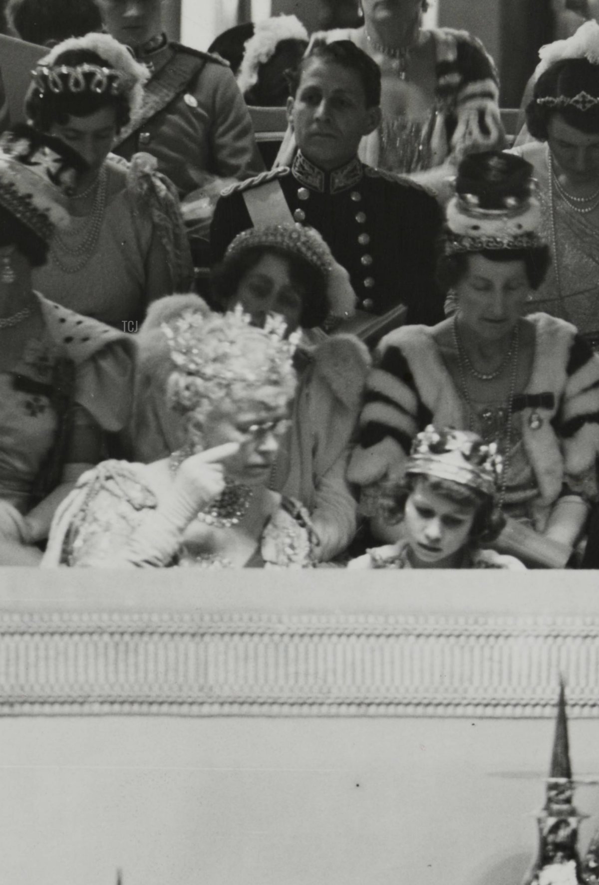 Moving along across the front of the royal box, we see Queen Mary consulting with Princess Elizabeth (later Queen Elizabeth II) on an aspect of the program. Little Elizabeth is wearing a special silver-gilt coronet made for her by Garrard for the ceremony, as well as a three-row pearl necklace given to her in 1935 by her grandfather, the late King George V. Behind the princess is Lady Elphinstone, sister of Queen Elizabeth the Queen Mother. She wears the Lotus Flower Tiara, loaned to her by Queen Elizabeth for the occasion.