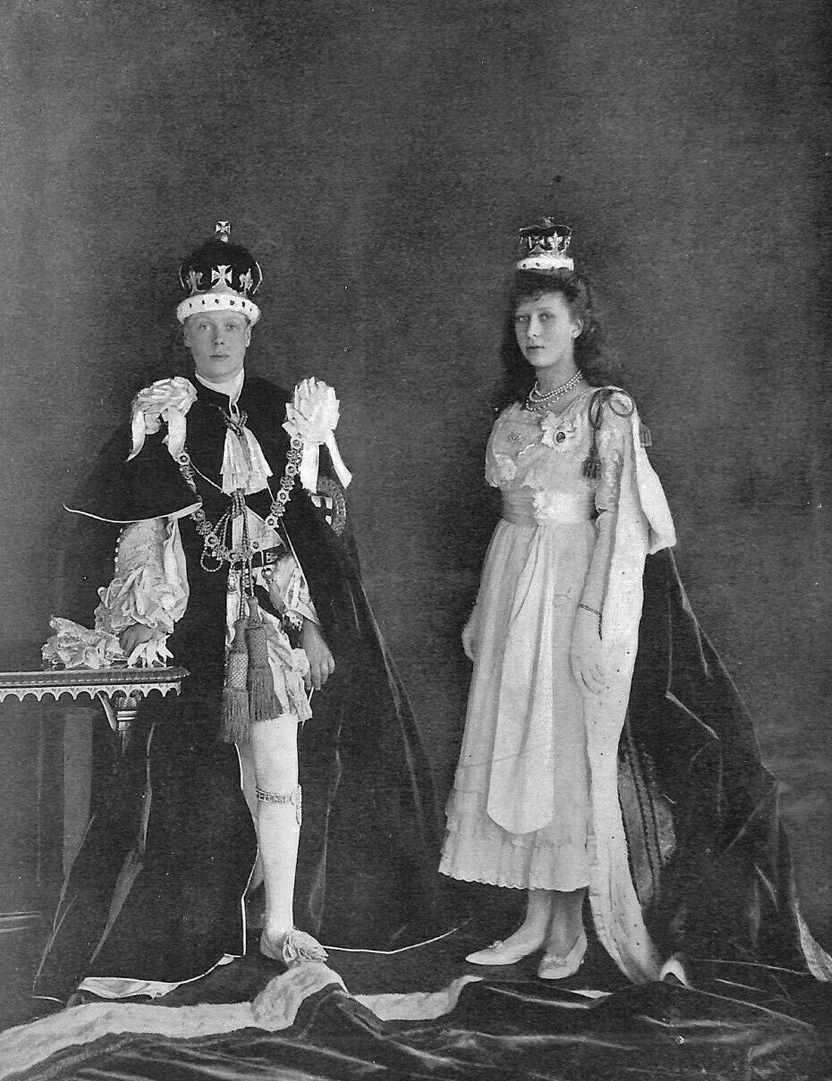 The Prince of Wales—on the day before his seventeenth birthday—had an important role in the coronation service, stepping up as the first person to pay homage to his newly-crowned father. Here, he’s pictured in coronation attire with his sister, Princess Mary. The photograph was taken at Buckingham Palace just after the family returned from the coronation ceremony.