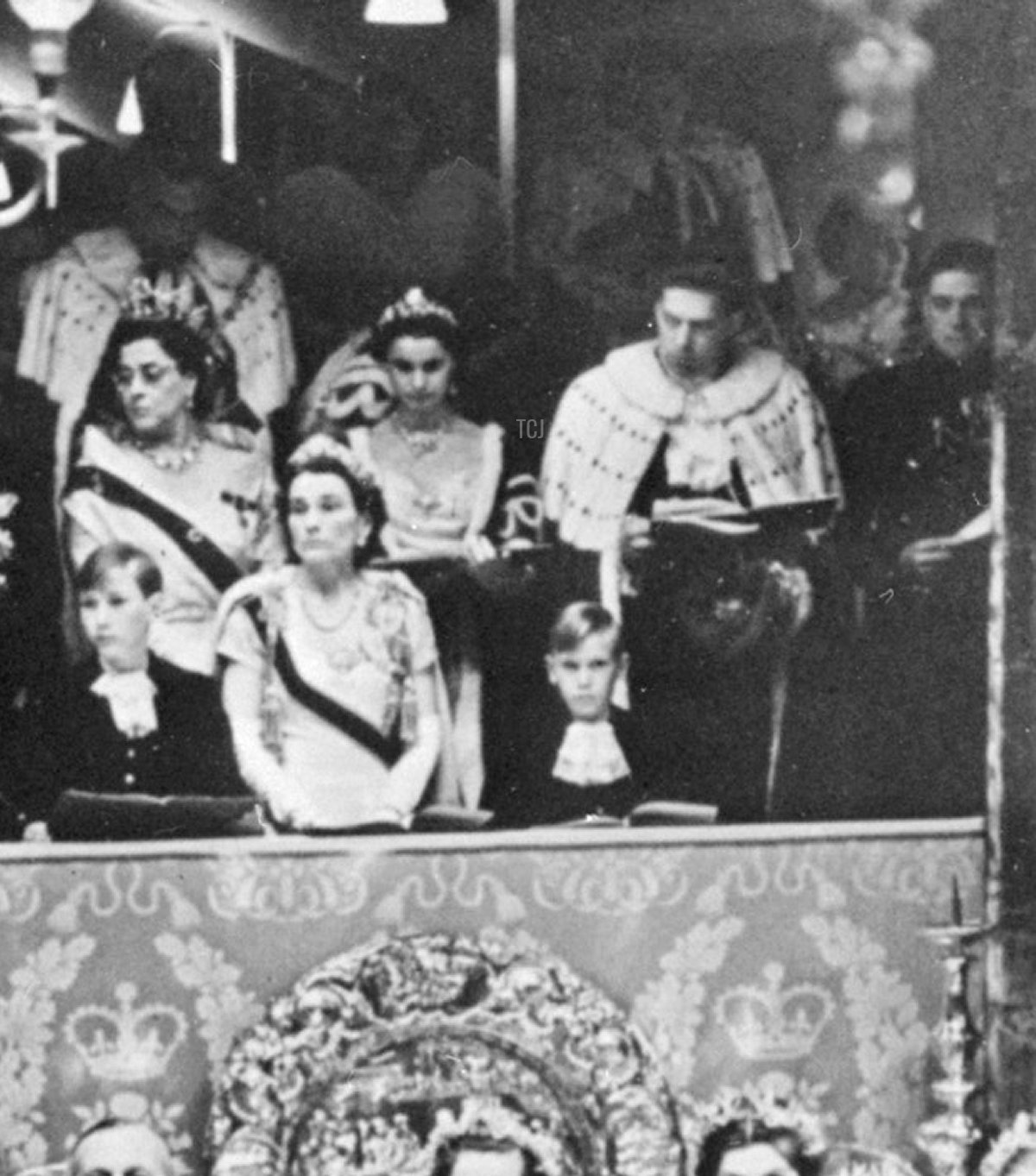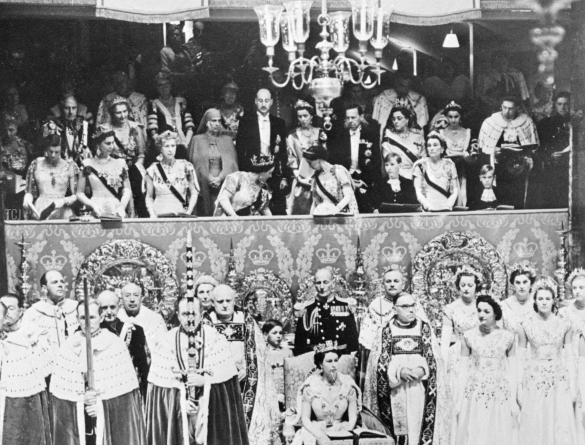 Now, let’s set our time machine forward once more, taking us to June 2, 1953. The coronation of Queen Elizabeth II has just begun at Westminster Abbey, and the royal ladies are once more taking their seats in the royal box above the coronation theatre. In the front row of the box, you’ll recognize Princess Alexandra; Princess Marina, Duchess of Kent; the Princess Royal; Queen Elizabeth the Queen Mother; Princess Margaret; and Princess Alice, Duchess of Gloucester with her sons, Prince William and Prince Richard of Gloucester.