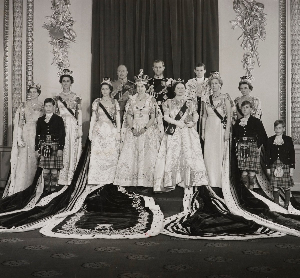 And here’s a family portrait from the 1953 coronation, featuring the core royal family with the Princess Royal, the Kents, and the Gloucesters. I’m not sure that we’ll be seeing tiaras on the royal women at this weekend’s coronation, but here’s hoping we get some excellent new family portraits from the celebration.